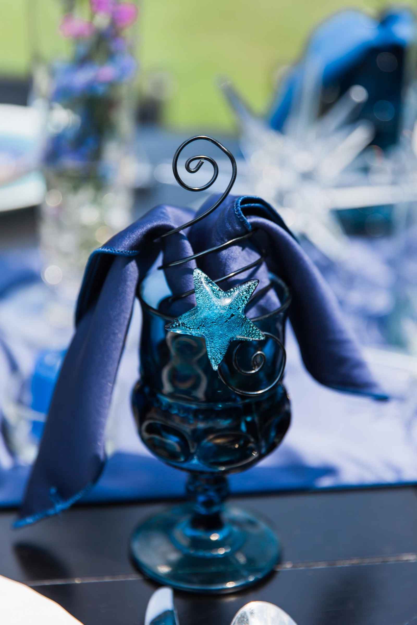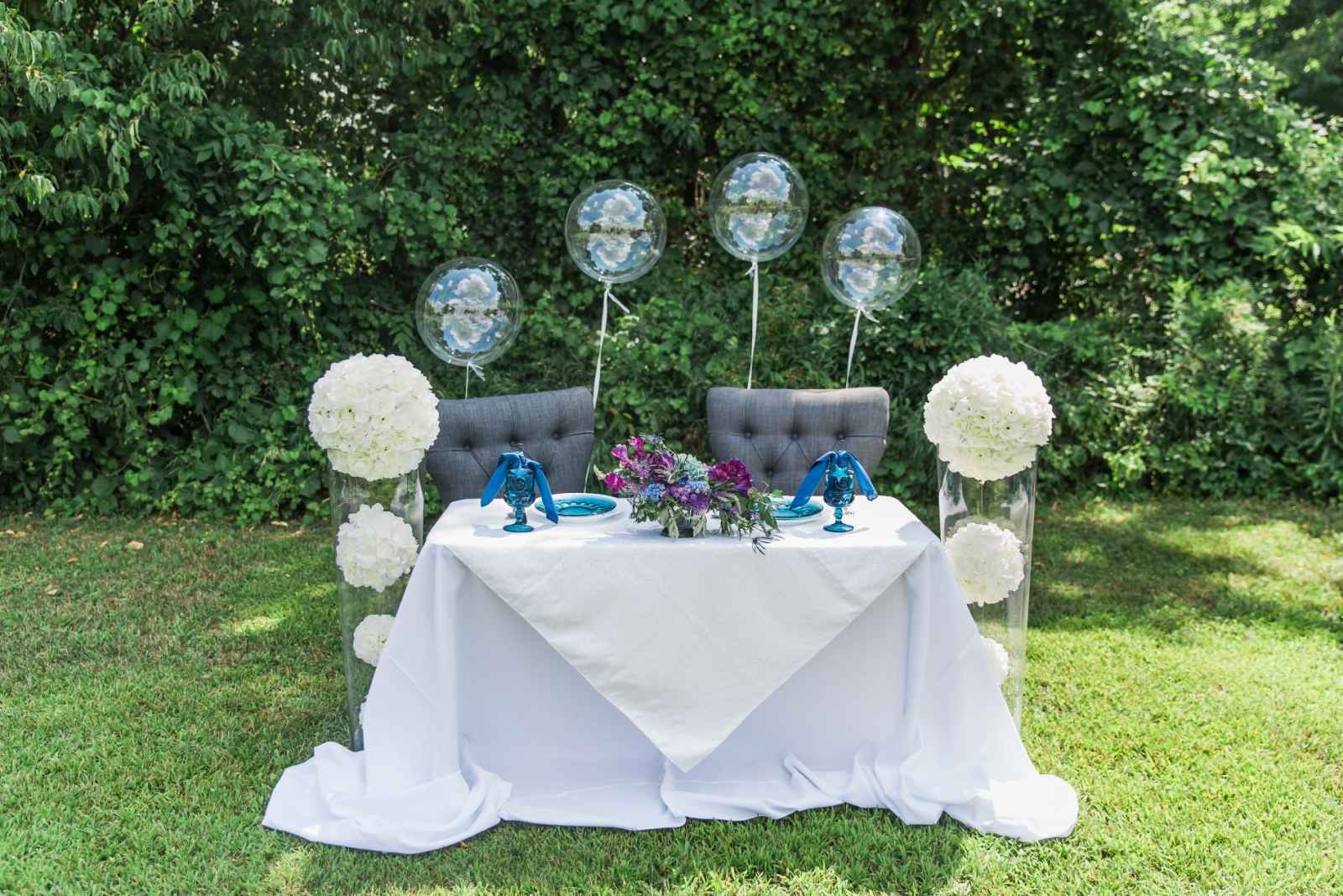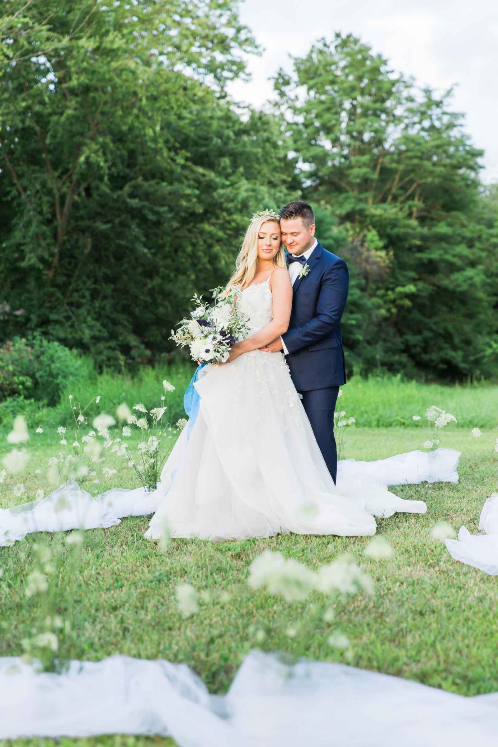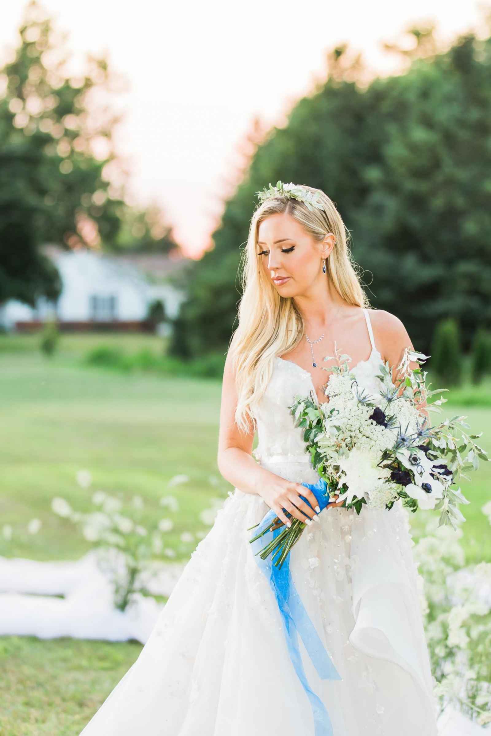 Nothing says elegance like Queen Ann’s Lace. This flower, used in shades of white and blue, was used to give the bride’s bouquet a fresh, natural look. Pops of hydrangeas and blue thistles round out this shoot’s flourishing florals.