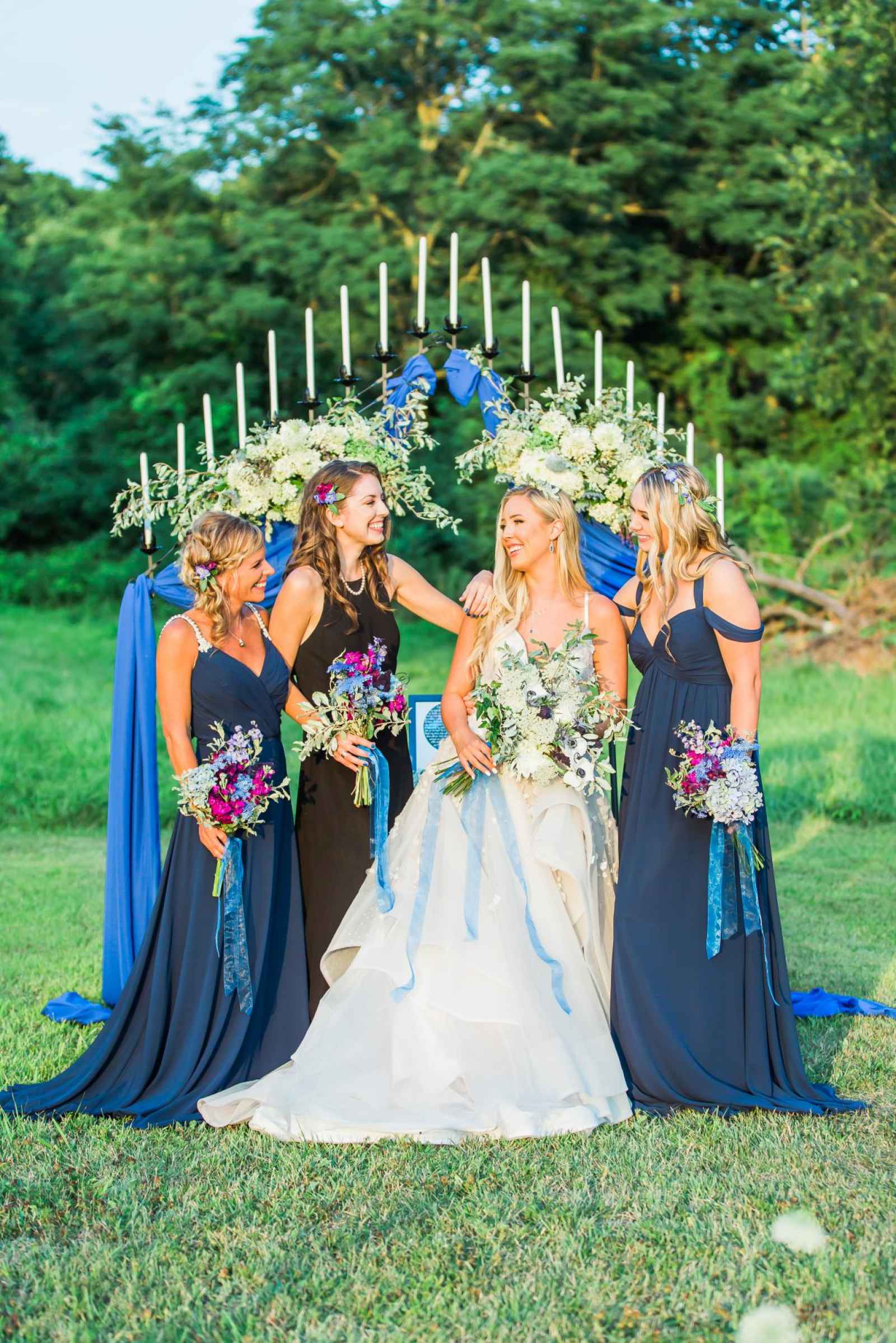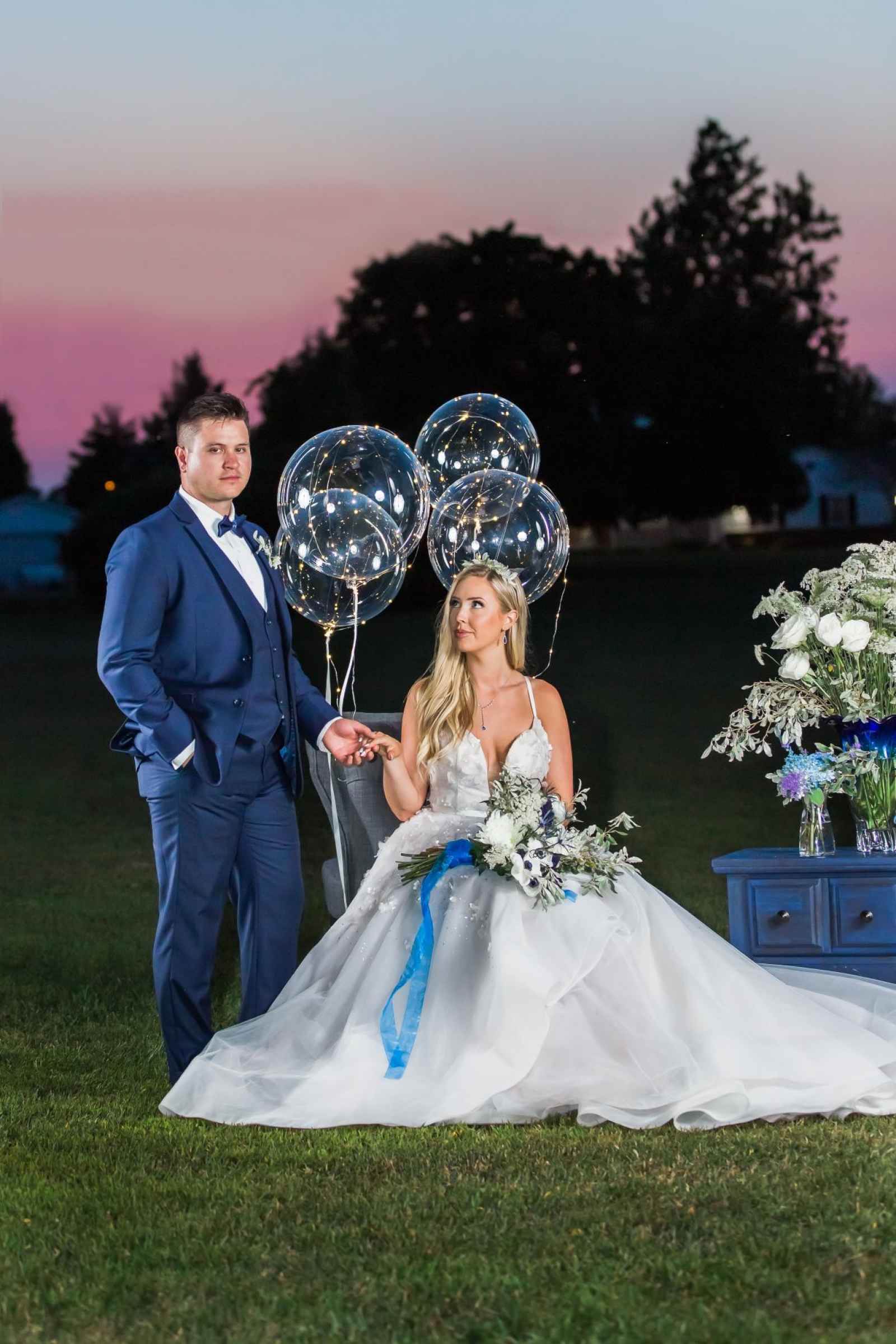 The shoot’s ombre color scheme utilized multiple shades of black, deep blue and Classic Blue, the 2020 Pantone Color of the Year. “The look was meant to reflect the blue hour of the night sky,” Lisa notes. “We wanted it to feel like the bride was in the clouds with twinkly lights all around.”