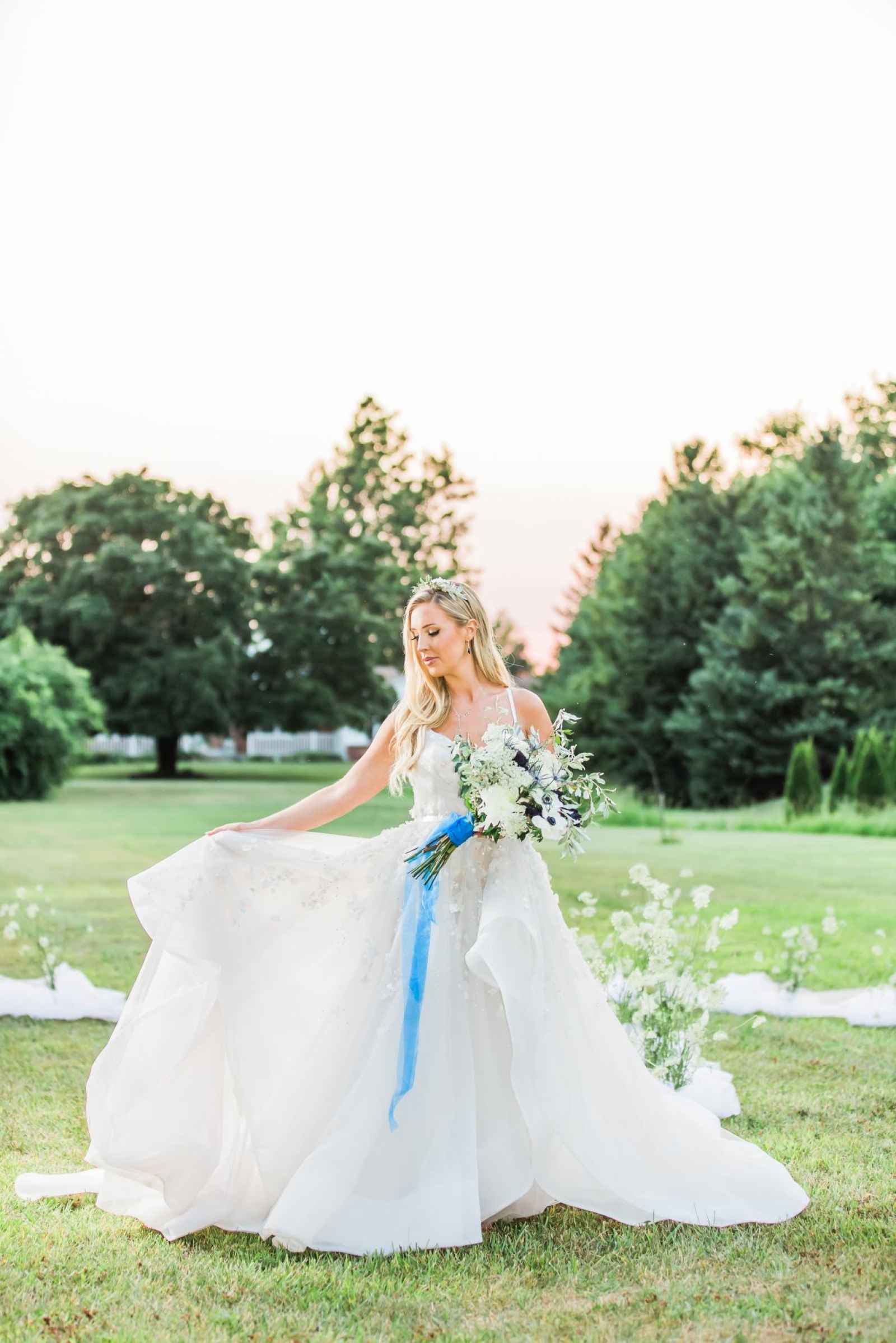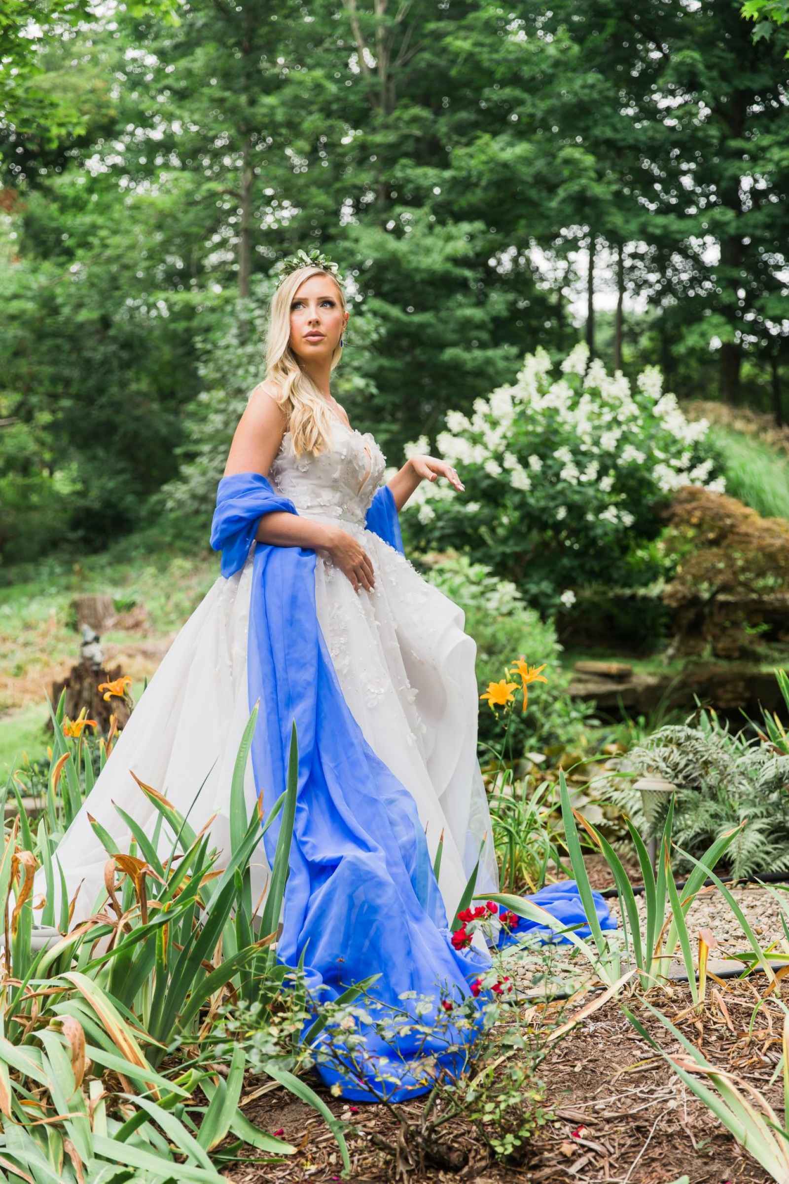 We’re here for this bride living out her celestial Cinderella fantasy! The stunning movement of this BIANKA Bridal gown leaves us wanting more. Paired with a Classic Blue tulle sash, this look is beautifully elevated to another world. The model’s hair was kept down for a classic feel, crowned with a tiara for a modern, floral twist.