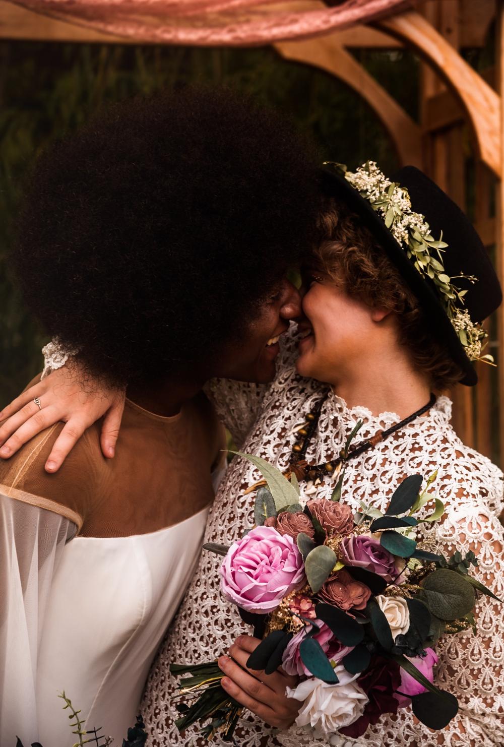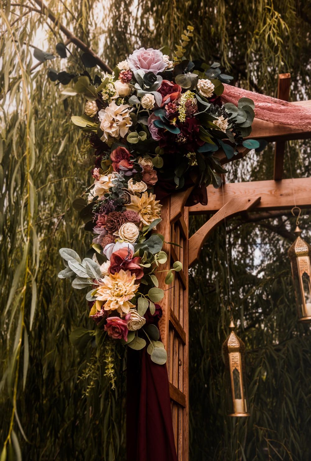 The venue has plenty of beauty to it already, so the team didn't want to distract from the natural beauty with too much décor. As a styled elopement, the team included a wooden arbor adorned with flowers as the backdrop to the ceremony. At the reception scene, they had a sweetheart table for our happy couple that was decorated with flowers and pink chiffon.