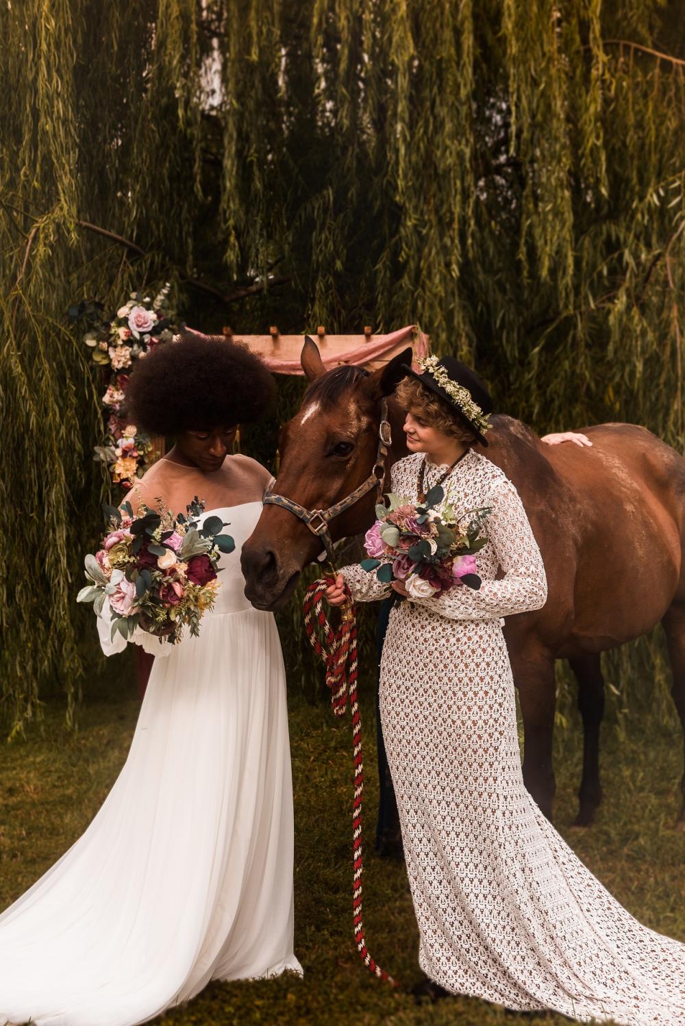 This talented vendor team felt like this was the best representation of weddings today. When choosing their venue, they decided on one that had a serene feel. They got lucky and even had the option to include horses in their shoot! "We wanted to play up on our wonderful venue by emphasizing the calm surroundings that feature horses and equestrian-related details throughout the property," Kelly shares.
