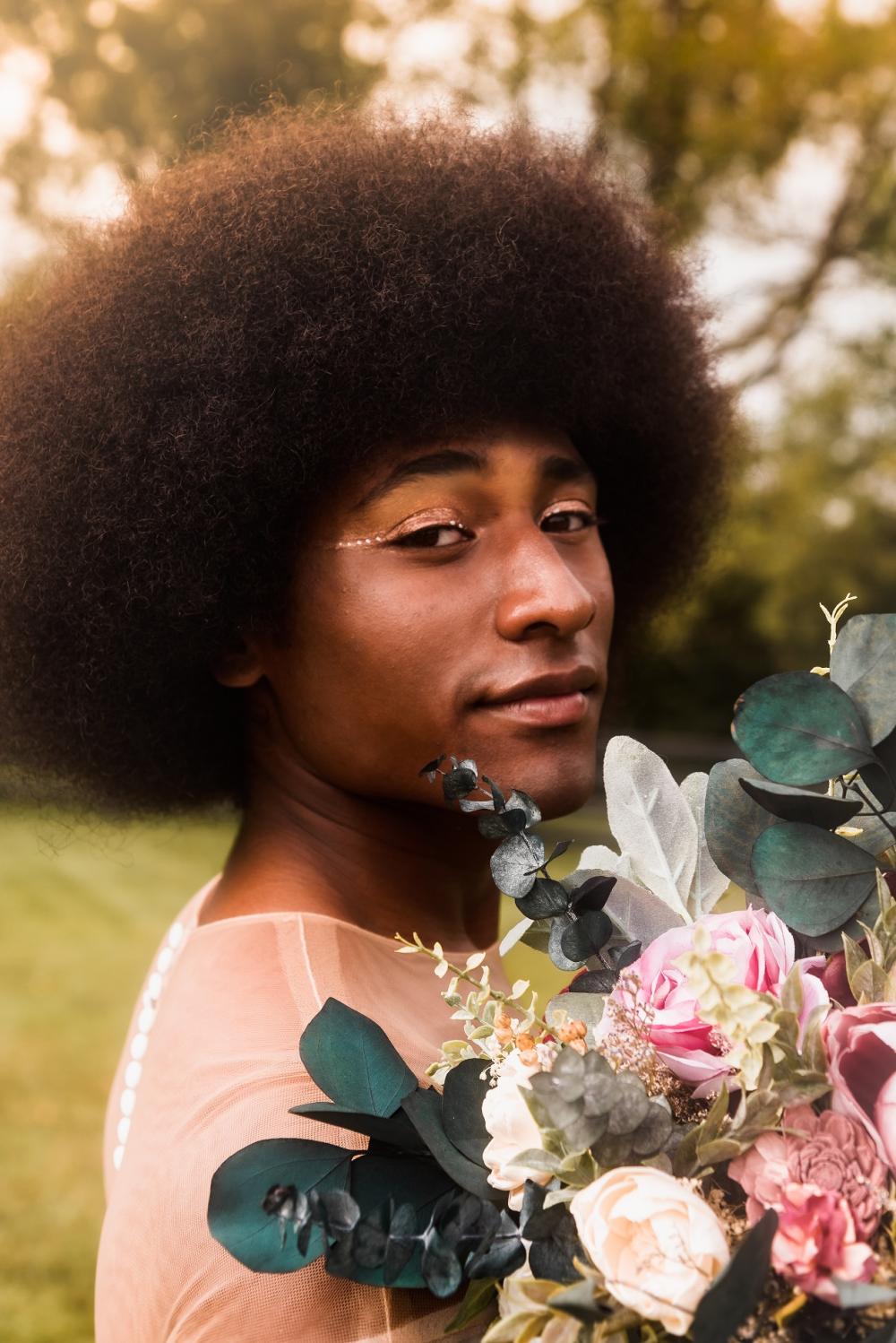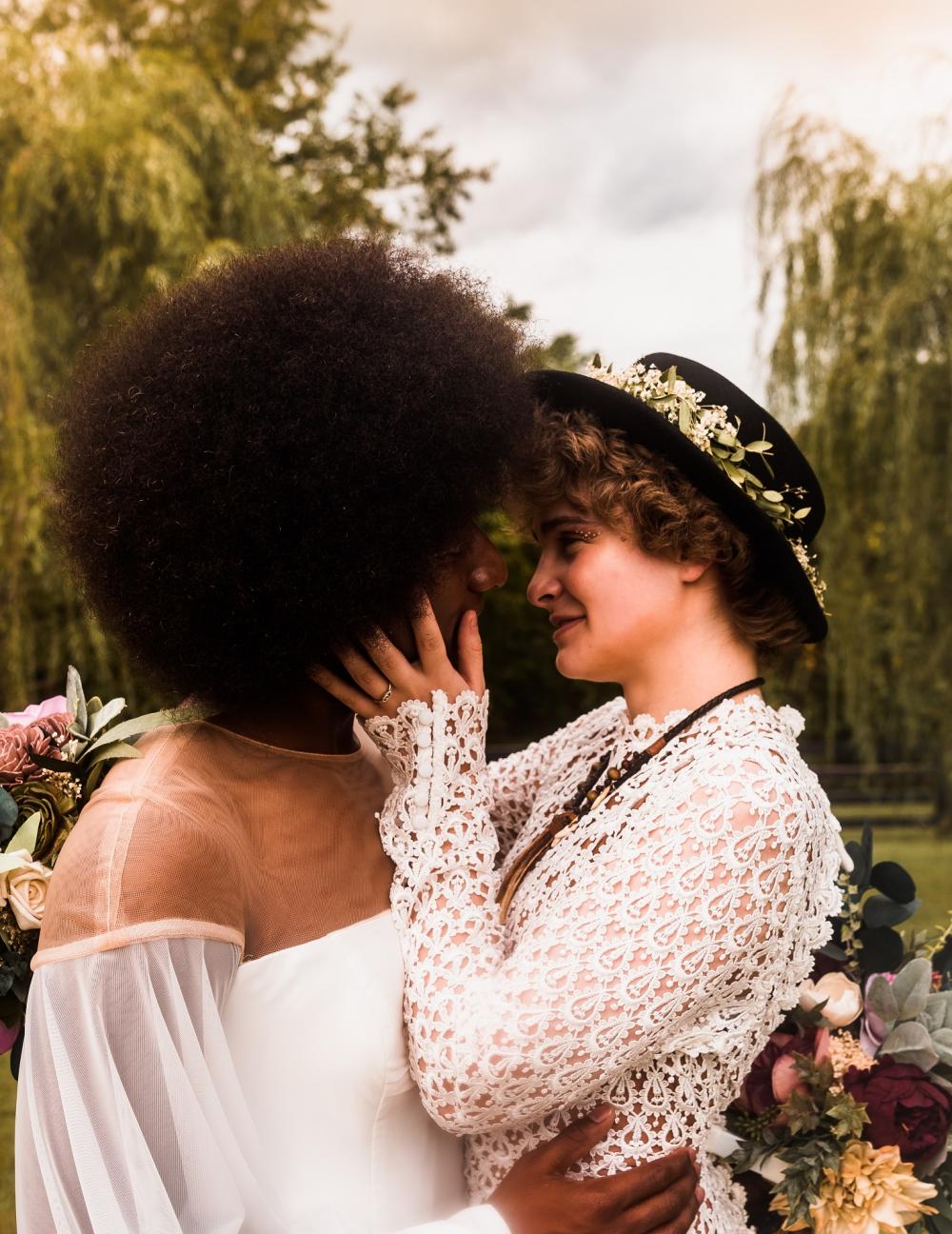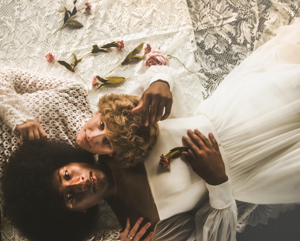 Two vintage-looking gowns were selected for this fairytale shoot. The Frock Bridal House brought an array of dresses and jumpsuits for the models to choose from so they could be as comfortable as possible while shooting. The first dress is very classic and vintage with a sleek satin look. However, we love the modernization of it with its lace neckline and sleeves! The second gown is vintage-patterned lace on a sheath dress that looks like it came right out of a 1920s magazine! We love the addition of the fedora to this look, too. For both looks, the eye makeup is the statement piece with unique designs on a shimmering lid.