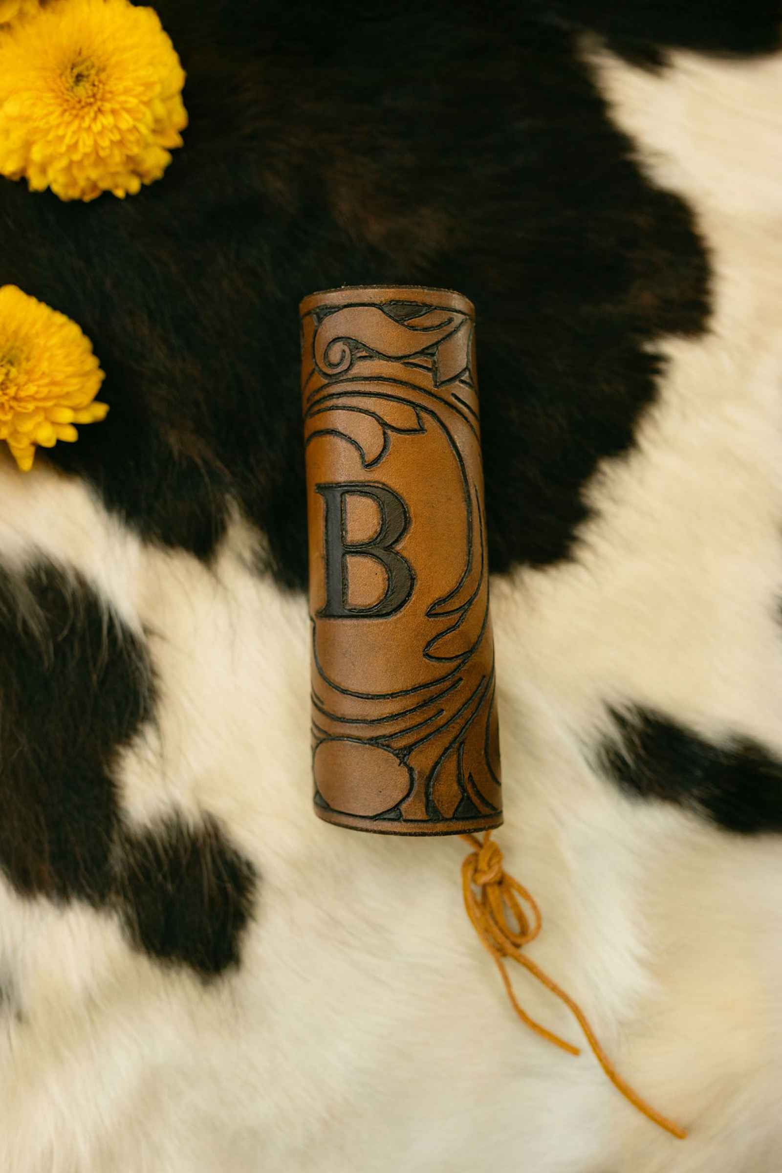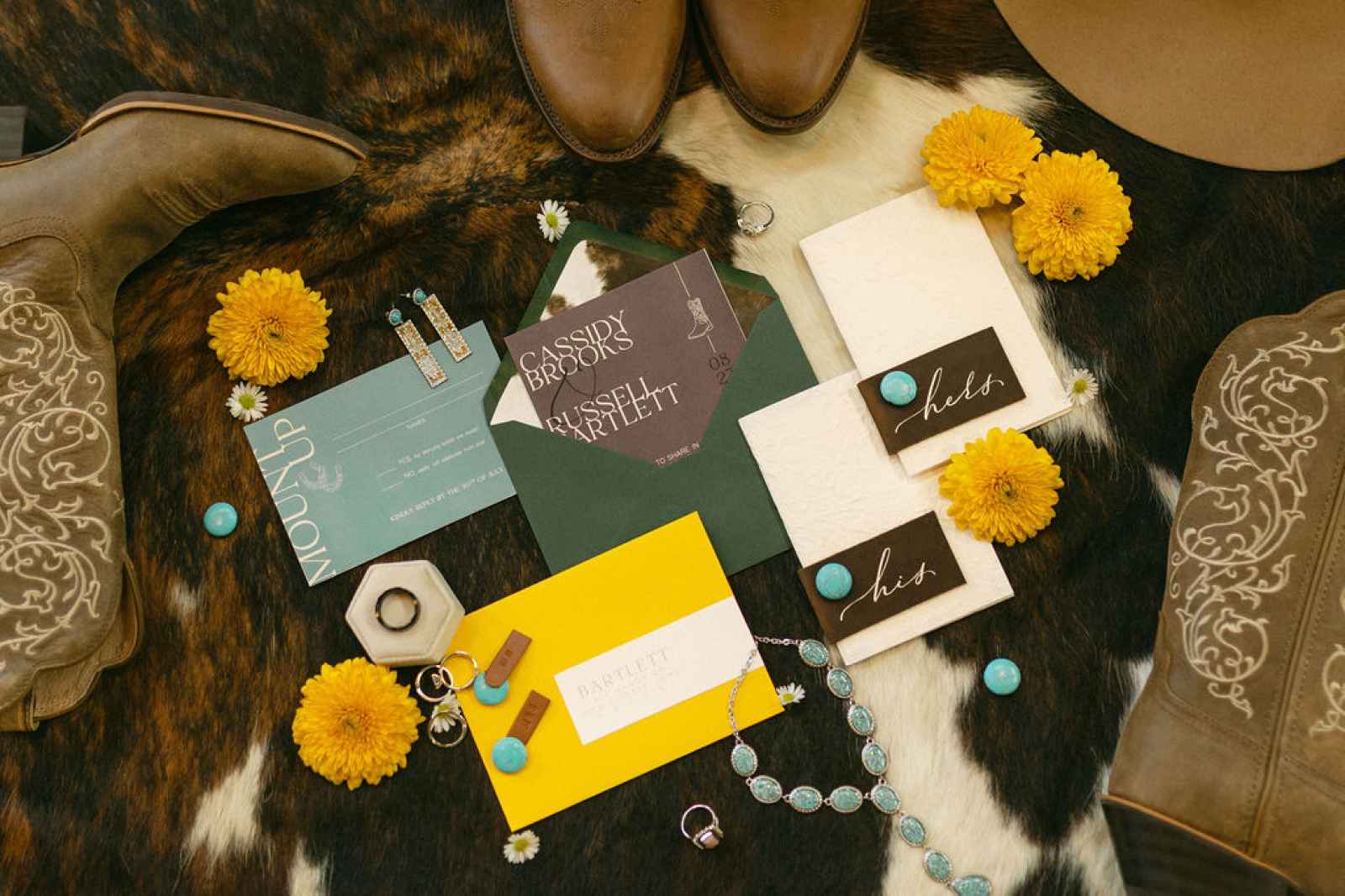Rentals played a key role in grounding the aesthetic. A cozy couch, cowhide rugs and a cake stand helped create a western-yet-homey atmosphere. The tablescape embraced neutral tones layered with meaningful accents, allowing the bold florals and turquoise details to shine without overwhelming the design.