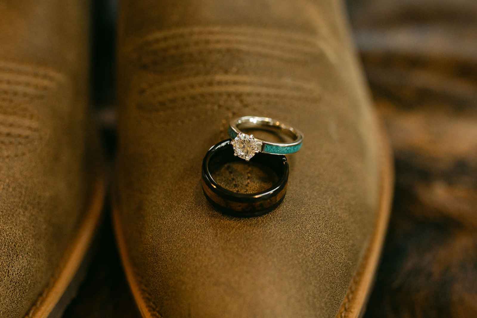 Pantone’s 2025 Color of the Year, Mocha Mousse, was thoughtfully woven throughout the shoot, adding warmth and cohesion to the overall design. The groom's suit incorporated rich mocha tones, grounding the look in earthy sophistication. In the stationery, subtle mocha hues appeared, complementing the turquoise accents beautifully. Decor details—including table accents and the ceremony rug—featured soft brown undertones that added depth without overpowering the palette. Even the cake embraced the trend, with textured mocha-inspired frosting details that enhanced its neutral base and tied seamlessly into the surrounding florals and tablescape.