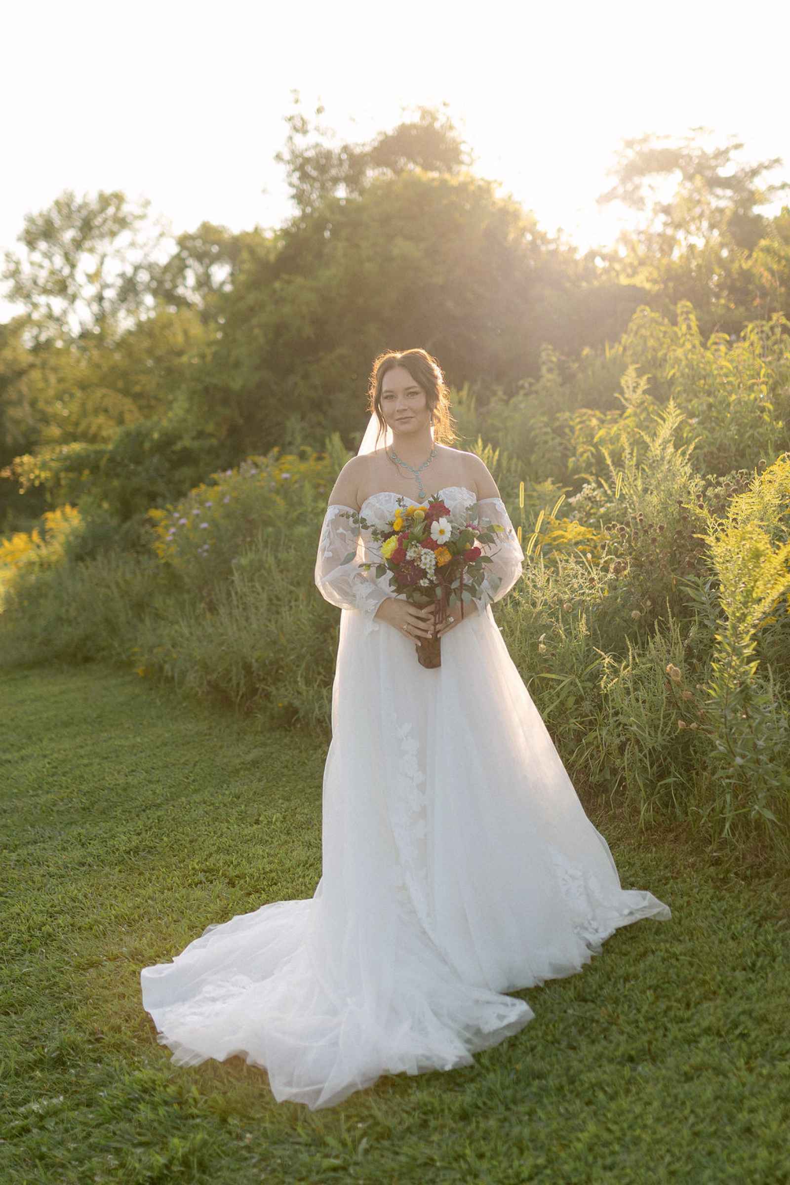 The bridal fashion told its own story of transition from ceremony to celebration. Two gowns were selected to showcase versatility and style. The ceremony dress was flowy and whimsical, complete with detachable sleeves that added romance and movement. For the reception, the bride changed into a sparkly, playful gown that embraced the joy of the evening. A classic veil, bouquet holder and garter added timeless touches, while the dual-look concept aligned perfectly with today’s trend of outfit changes for the reception. Hair and makeup remained soft and natural to complement the theme. The bride began with an elegant updo for the ceremony before transitioning to a relaxed half-up, half-down style for reception portraits. Neutral makeup enhanced her natural beauty without overpowering the organic feel of the shoot.