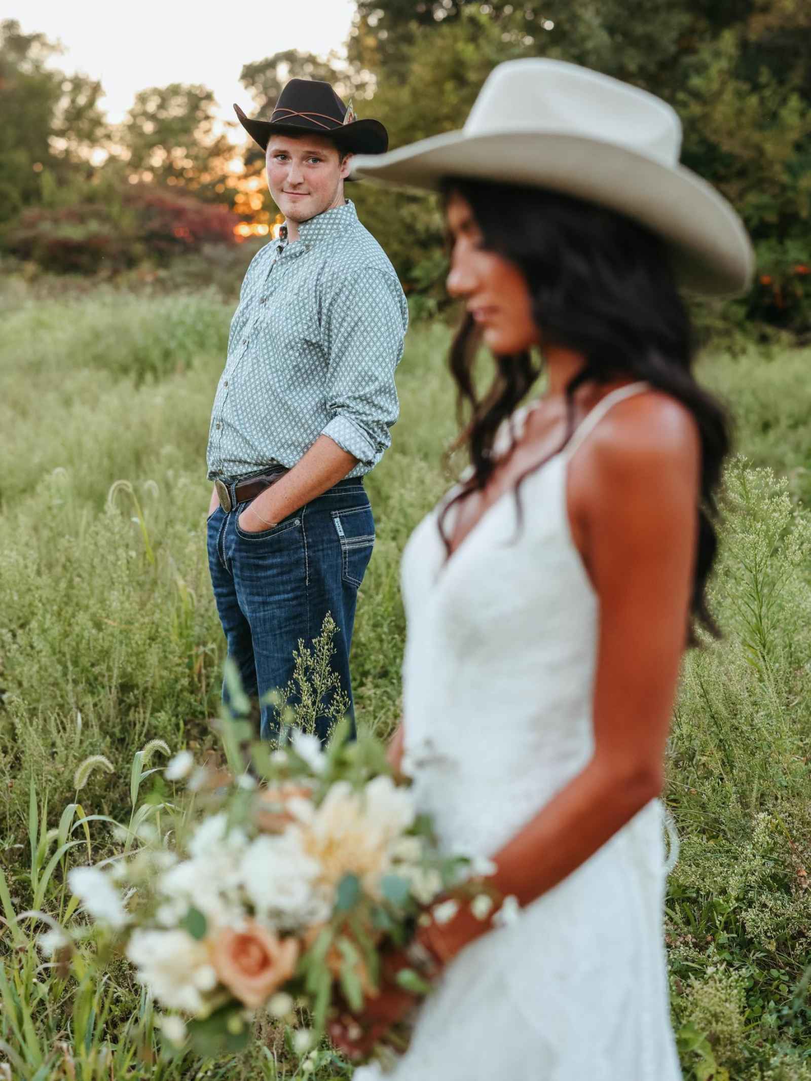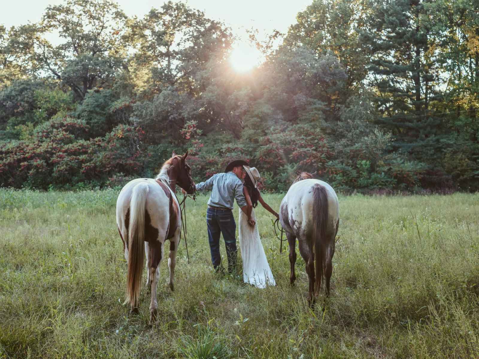Of course, no ranch shoot comes without its surprises. “Animals have a mind of their own,” Mary Beth laughs. Their sweet horse took a particular interest in the bride’s bouquet, making for a memorable (and slightly chaotic!) moment on set. But those unscripted interactions only added authenticity and charm to the story unfolding in front of the lens.