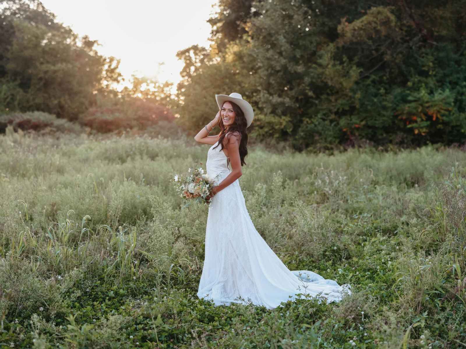 To incorporate current trends, the team embraced motion blur photography, relaxed hairstyles, effortless gowns, denim details and natural makeup. The bride wore soft curls with minimal fuss, allowing her natural beauty to take center stage. Neutral makeup tones enhanced her features while keeping the look low-key and radiant—perfect for a ranch setting!