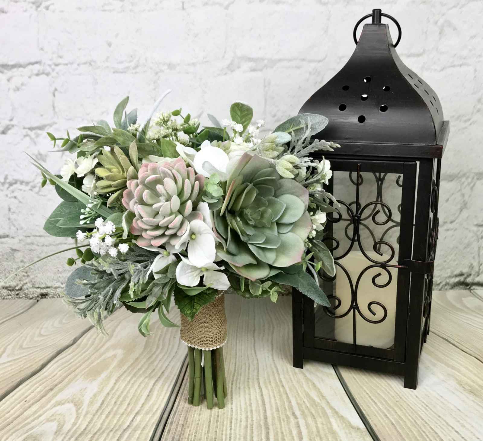 About the Product: This bouquet is designed with high-quality faux succulents in varying shades of green, with lush greenery, accents of white and a dusting of mauve-pink. The stems are wrapped in burlap ribbon with pearl edging.
