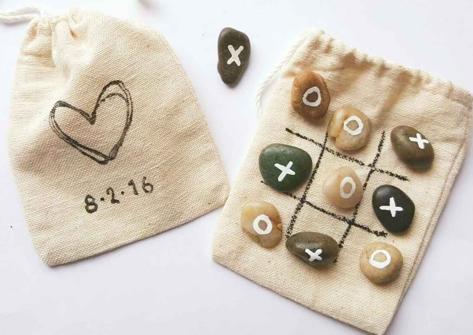 About the Product: This fun Tic-Tac-Toe table game comes in drawstring, muslin bags. The game board can be found on one side, and the other side can host unlimited possibilities like a heart with your wedding date, names or initials inside of it. This item will entertain guests and can be kept as a one-of-a-kind keepsake.