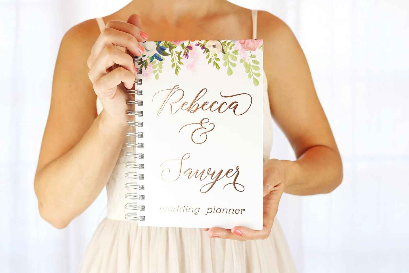 About the Product: This metallic wedding planner is an essential gift for the bride-to-be. It has all the information she will need for planning, along with a twelve-month calendar! Paper Peach can customize the color of the foil to rose gold, gold or silver.