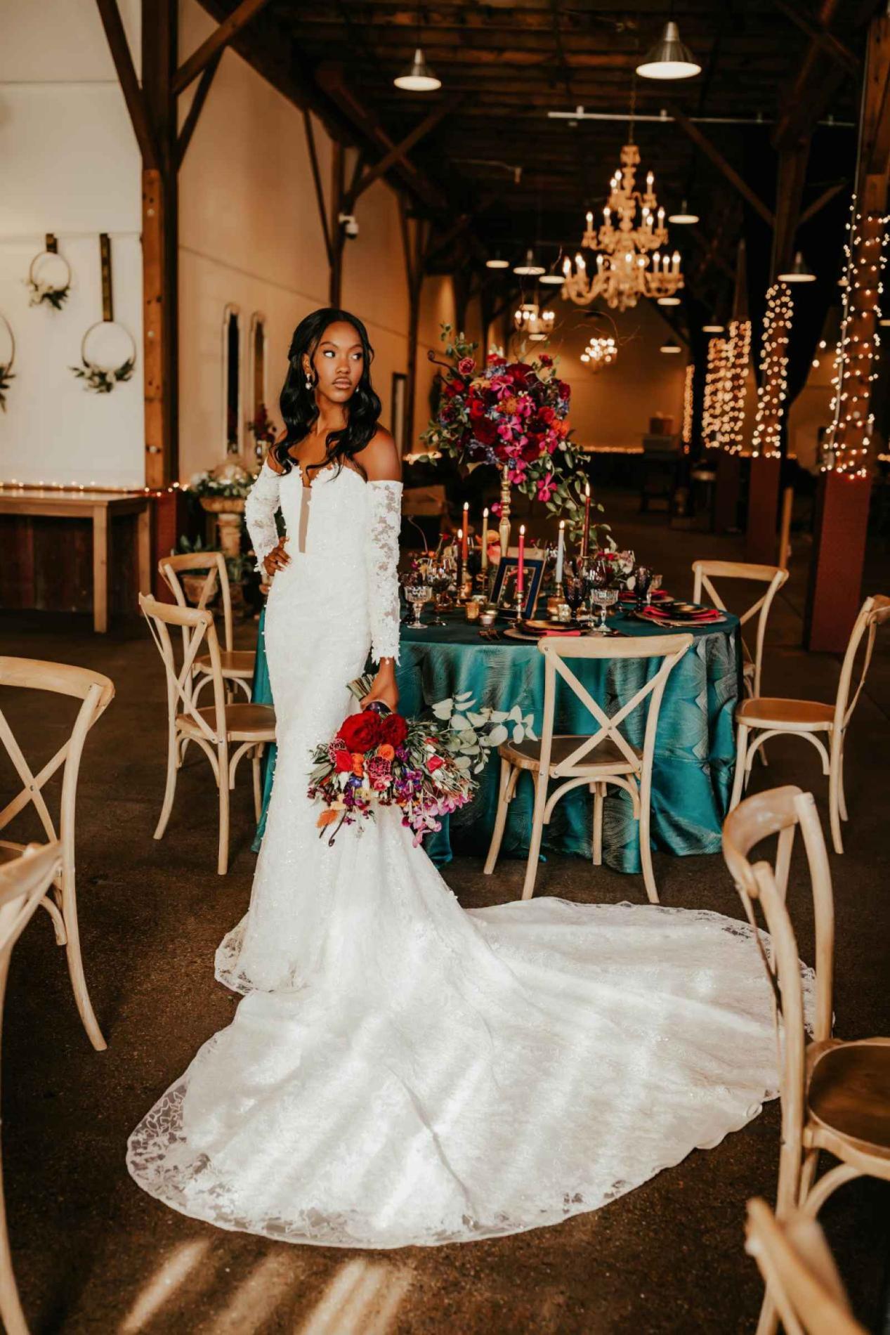 Our 2026 March Madness runner-up gown was also designed by CBTKbridal and is a romantic, off-the-shoulder lace look that effortlessly blends timeless elegance with dramatic detail. Featuring long sleeves and a flowing train, this gown creates a graceful, statement-making silhouette—perfect for brides dreaming of a classic yet unforgettable wedding day look.