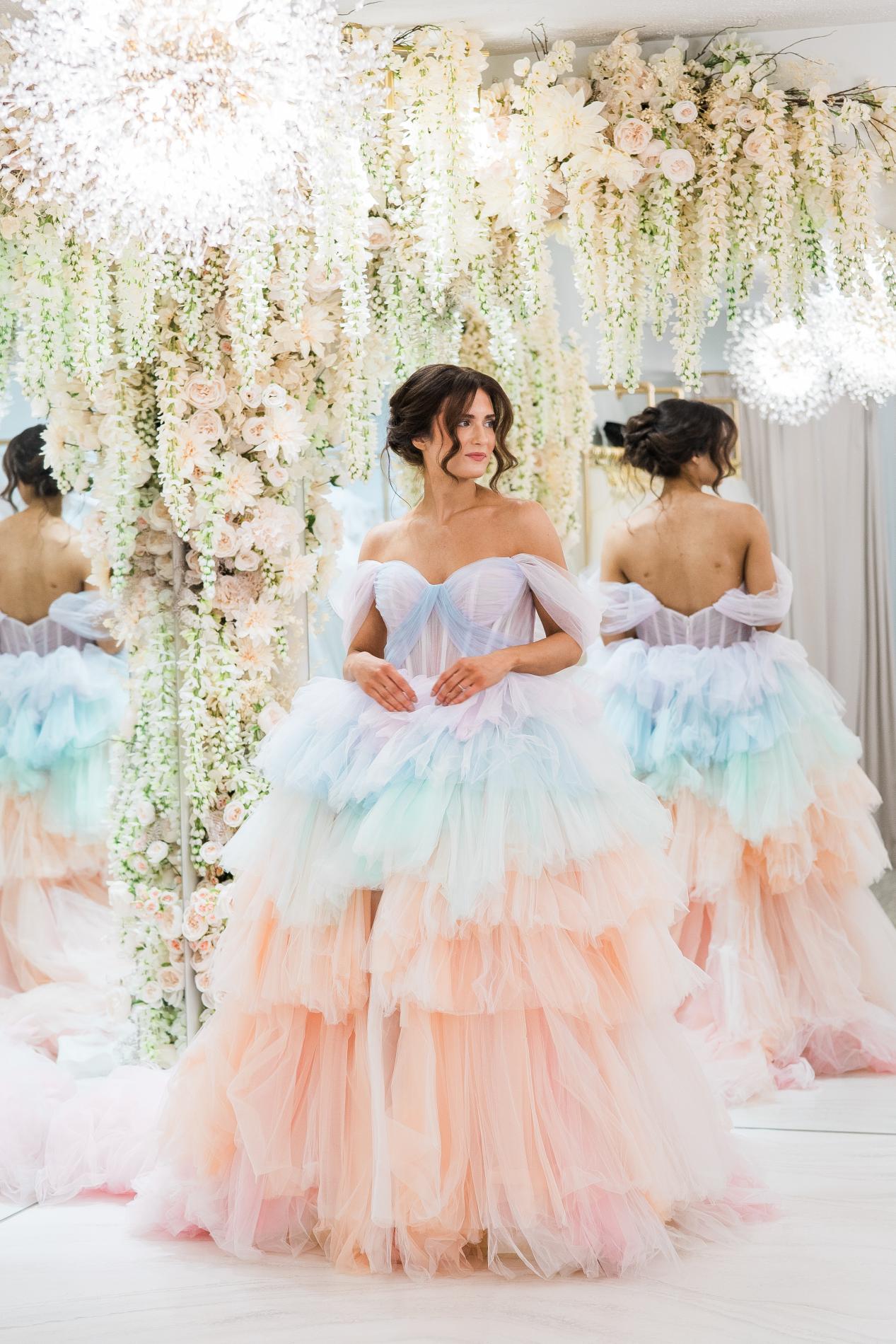 Becker’s Bridal brought bold beauty to our March Madness tournament with the Hayley Paige “After the Storm” gown—a true showstopper! Featuring a stunning cascade of rainbow hues in a tiered waterfall design, this dress is full of movement, color and personality, perfect for the bride who wants to make a vibrant, unforgettable statement!