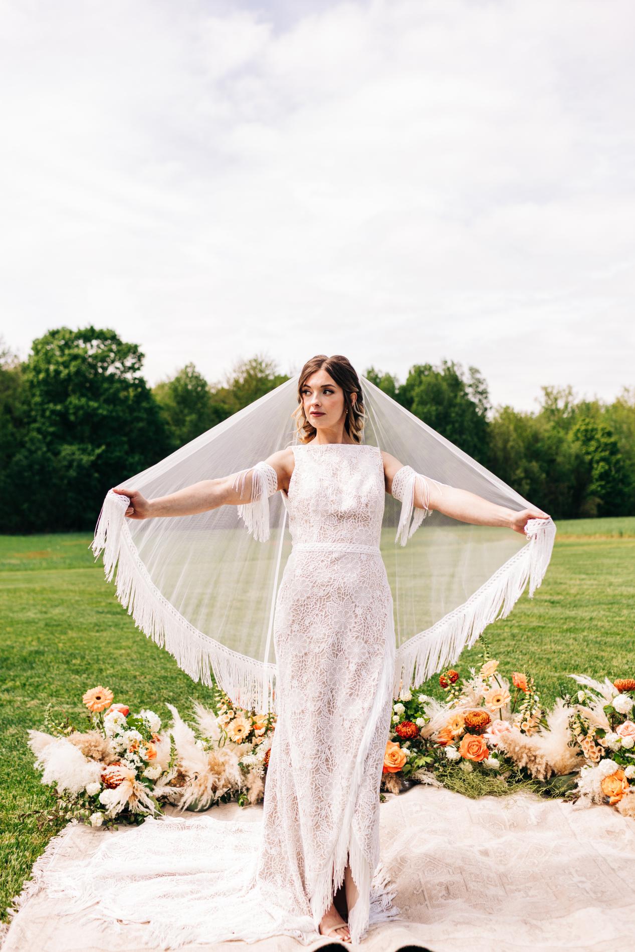 La Bridal Loft brought a fashion-forward edge with this high-neck lace gown featuring statement fringe detailing. With removable fringe sleeve cuffs and the option to pair it with a fringe-lined veil, this look is perfect for the bride who wants to boast a rustic or modern flair!
