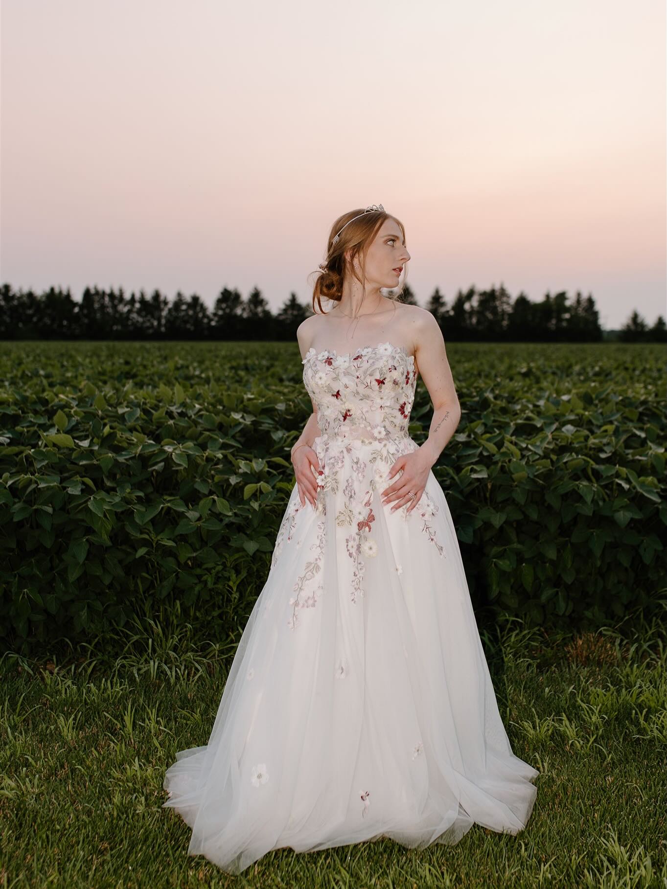 Belle Amour Bridal showcases romantic elegance with this floral-adorned A-line gown, designed to feel both soft and timeless. Delicate blooms add texture and charm to the flowing silhouette, creating a dreamy look that’s perfect for the bride drawn to nature-inspired beauty!