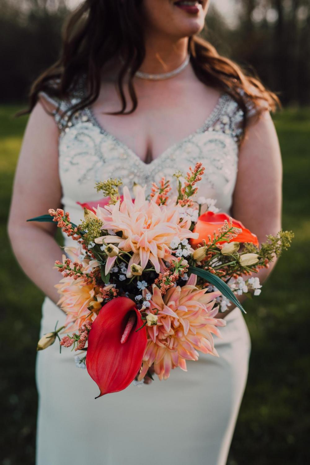 For this wedding, the couple went D.I.Y. ...with the whole family! Kelly says, “My mother-in-law made all of our bouquets. My husband’s best man also served as the DJ. My father-in-law made the sides for dinner and appetizers for the cocktail hour. We had family friends roast a pig for us and run the kitchen. One of my really good friends is a bartender at our favorite local pub, and she absolutely killed it serving solo at our open bar. Our family and friends easily were the ones who made the wedding go so wonderfully.”