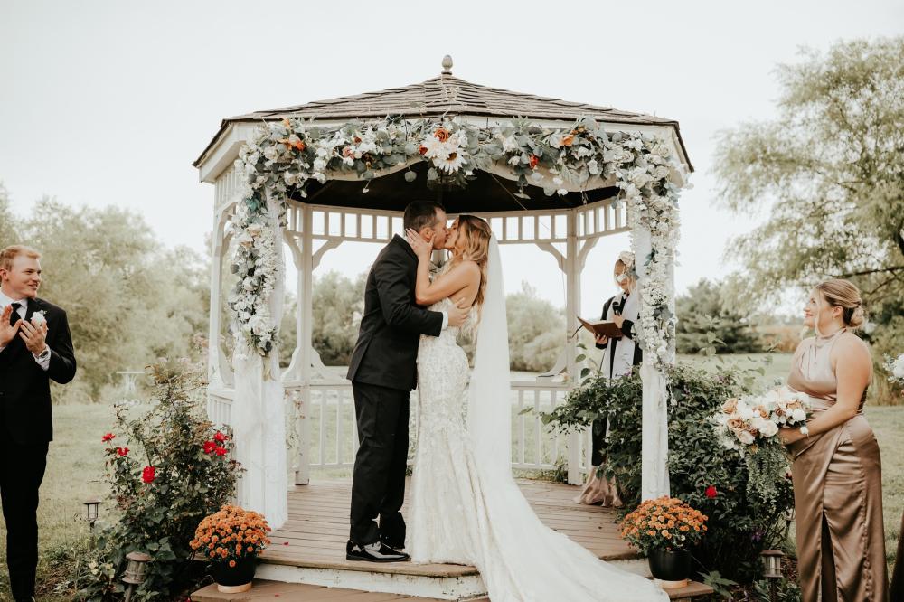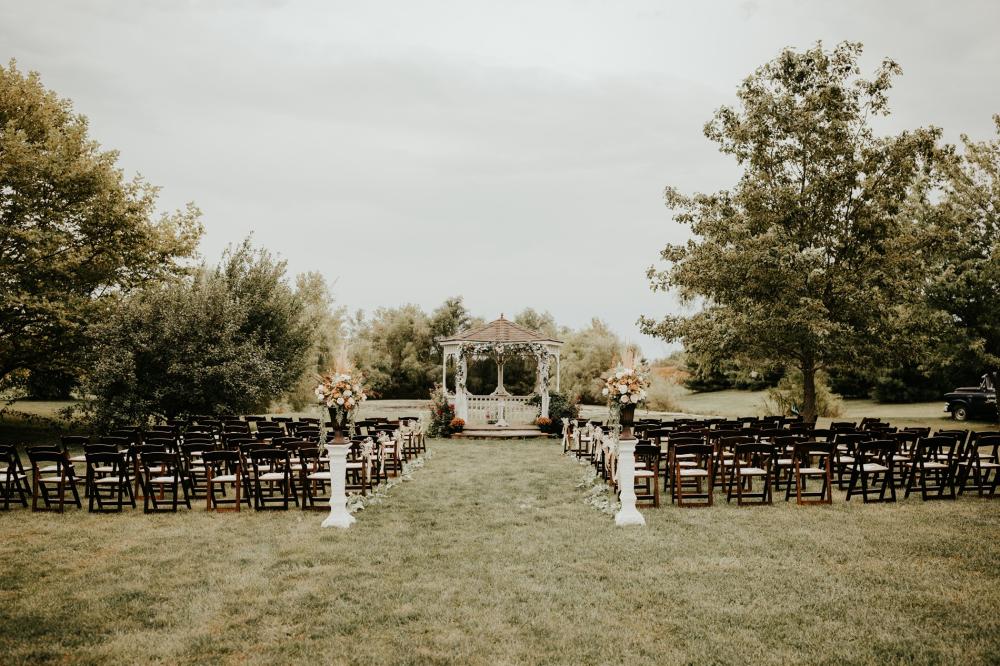Since they were going to get married in the fall, Maddie and Ben wanted to create a rustic and fall-inspired ceremony. We love the way this wedding came together! The unique door entrance and gazebo in the ceremony space are so cute and charming and there are so many natural elements that make the reception even more rustic. The florals help fill the space and add more texture to the beautiful space. They also mixed in some vintage vibes with the antique goblets, distressed mirror and a vinyl guestbook!