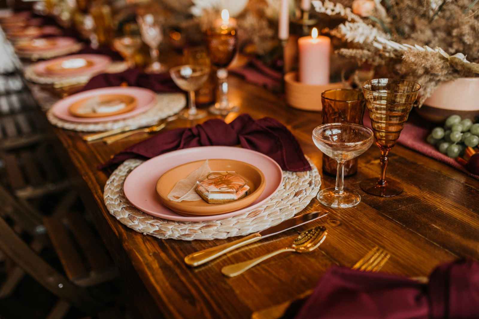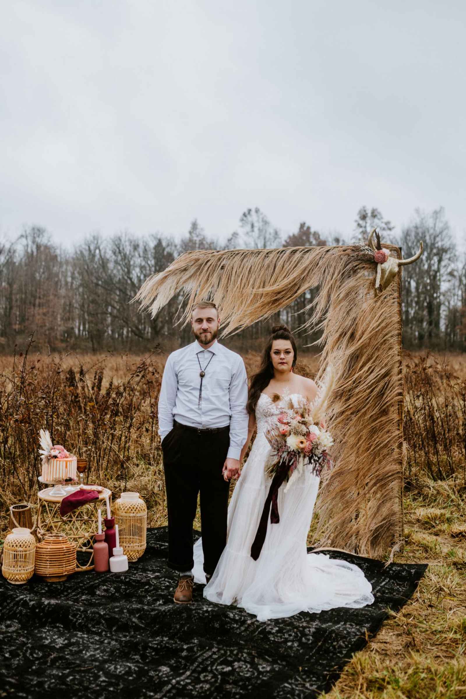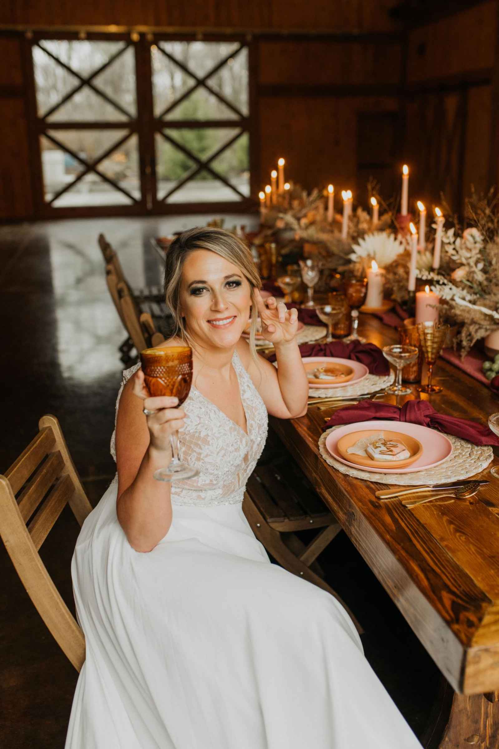 From light blush plates and modern golden flatware, this table setting holds classic elegance with a touch of whimsy. The small details—such as the tinted glasses, colored candles, and overflowing dried bouquets—provide the perfect intimate atmosphere for any reception. Looking to add a little local love to your lunch? The charcuterie display incorporated into the tablescape by Crawfordsville wedding caterer, The Juniper Spoon, was entirely Indiana grown. The rentals and linens, provided by Copper Jade Events, make the ideal boho wedding, indoors or out!