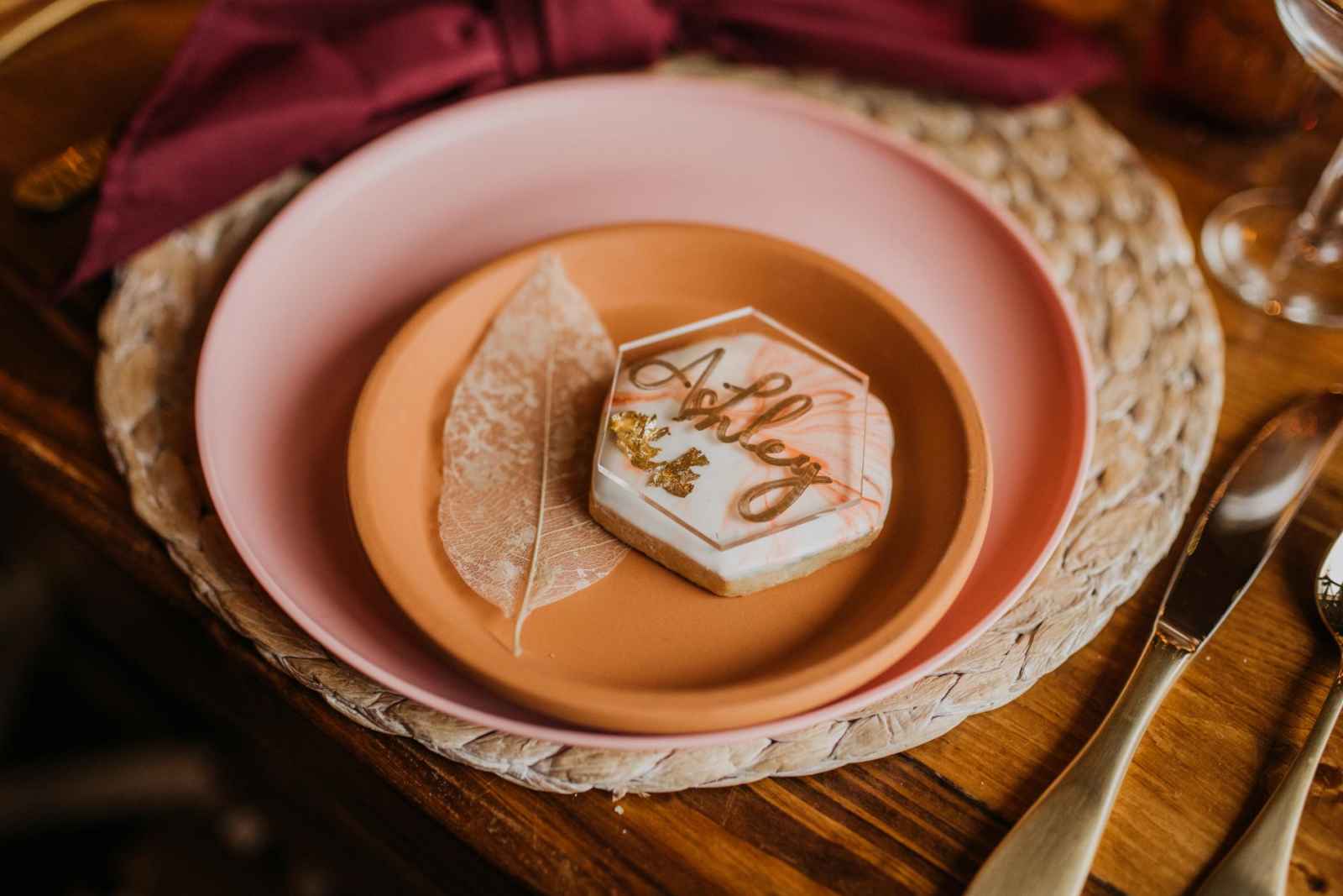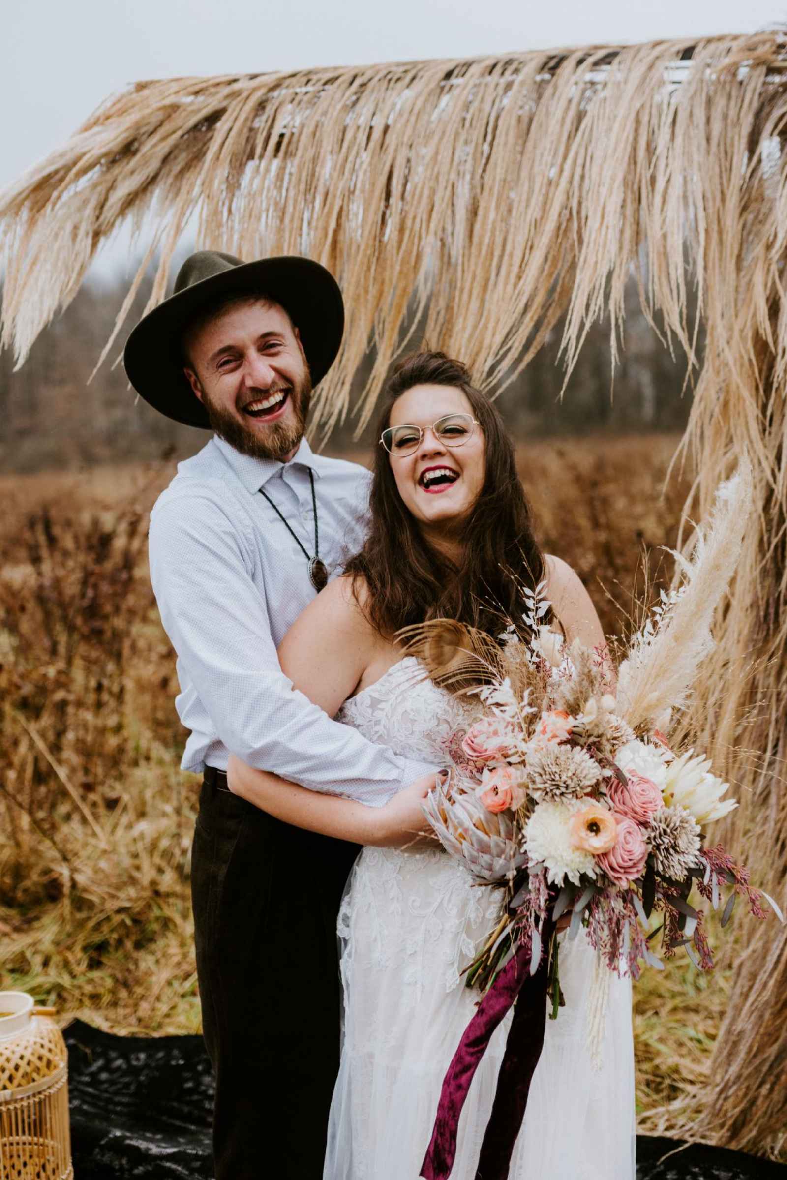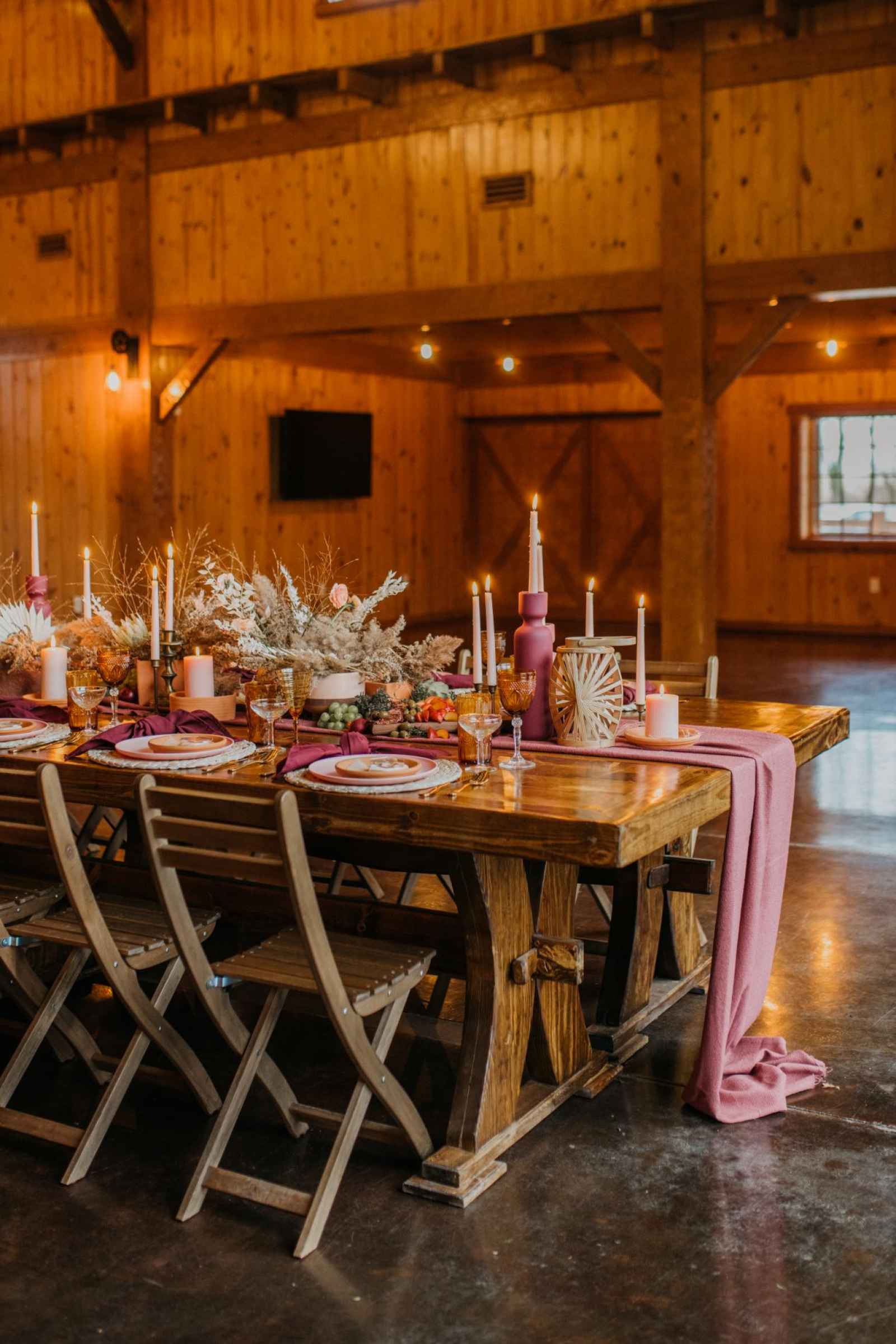 From light blush plates and modern golden flatware, this table setting holds classic elegance with a touch of whimsy. The small details—such as the tinted glasses, colored candles, and overflowing dried bouquets—provide the perfect intimate atmosphere for any reception. Looking to add a little local love to your lunch? The charcuterie display incorporated into the tablescape by Crawfordsville wedding caterer, The Juniper Spoon, was entirely Indiana grown. The rentals and linens, provided by Copper Jade Events, make the ideal boho wedding, indoors or out!