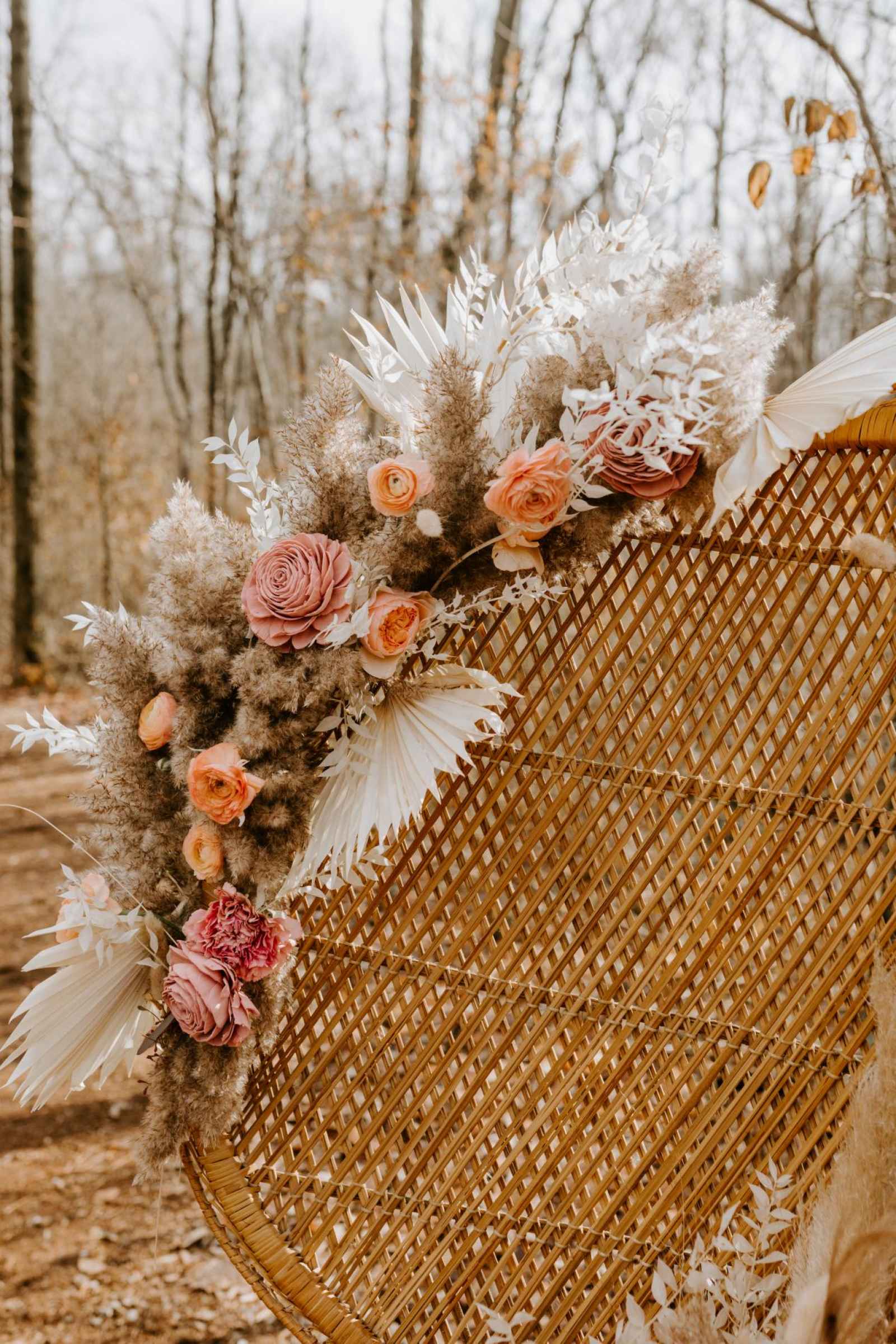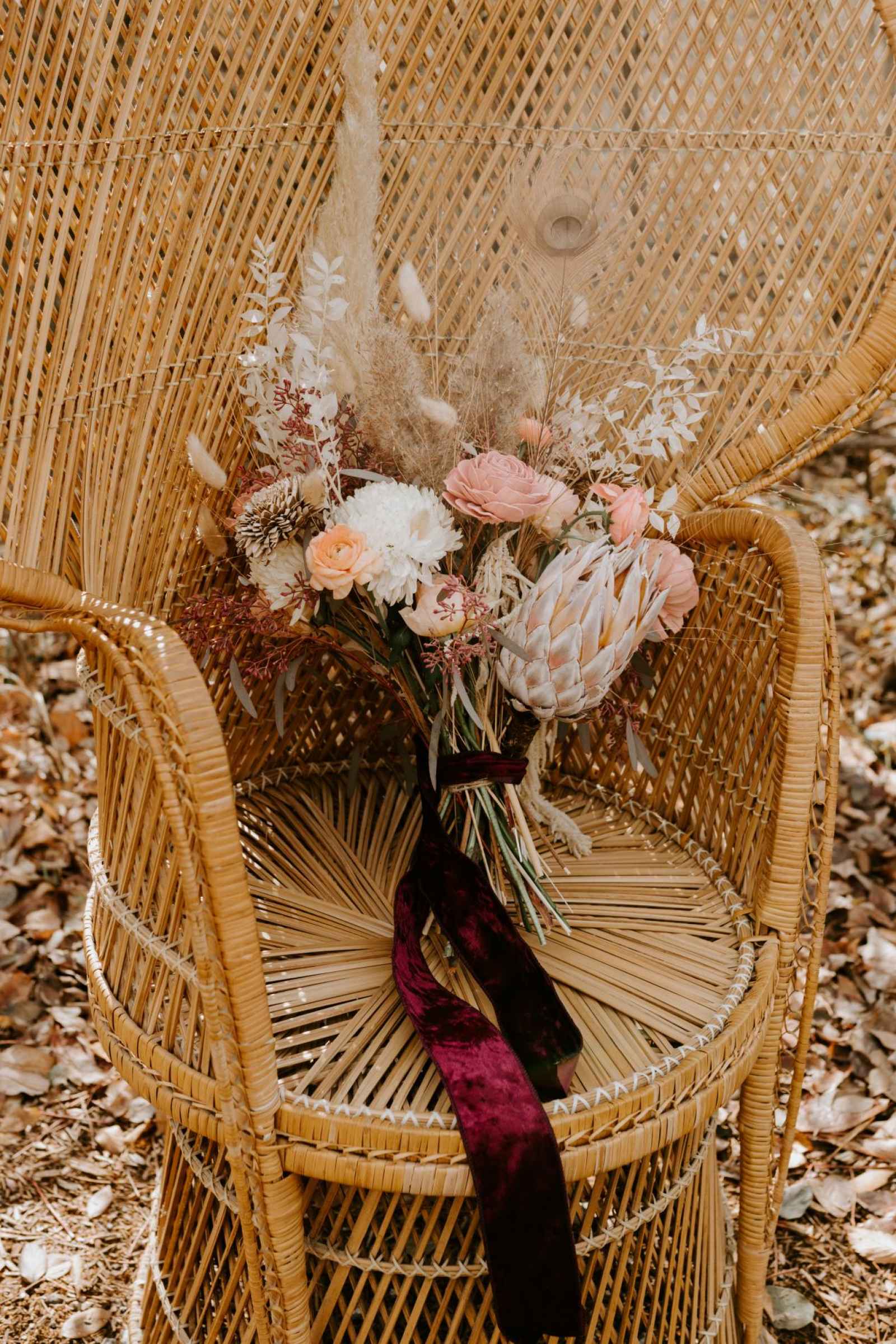 The muted tones of these blooms, created by Copper Jade Events, draw on the delicate side of rustic romance. The aesthetic totally captures an organic Southwestern vibe. Vanessa explains, “We based the color palette around the barn and the natural beauty of the surrounding nature. I used a lot of dried florals like pampas grass and palm fans to get the bohemian feel we were going for.”