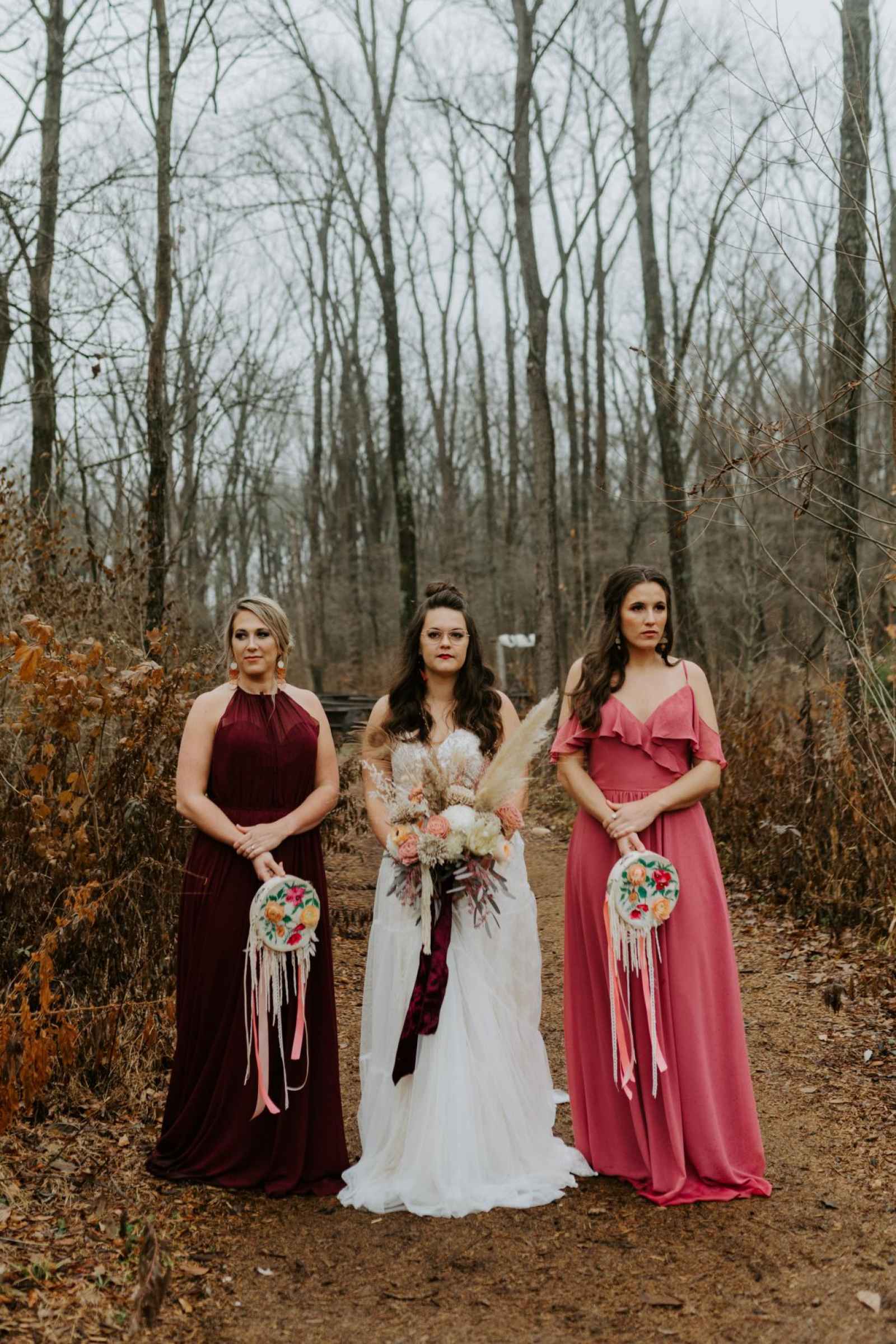 These models flash a humble romantic look that is perfect for a small town with a big heart. Vanessa says, “We wanted to echo the effortless feel of bohemian in the brides’ hair and makeup.” From soft curls to elegant updos, Crawfordsville area wedding hair and makeup salon, Lavender & Hops Style Lounge, showcases an enchanting variety of boho styles. Local bridal salon, Jessica’s on Main, perfectly paired these models with a wide variety of dresses and styles, showcasing the diversity of boho and body types. The moody bridesmaids’ dresses tie into the shoot’s color scheme for one whole, bohemian bridal look.