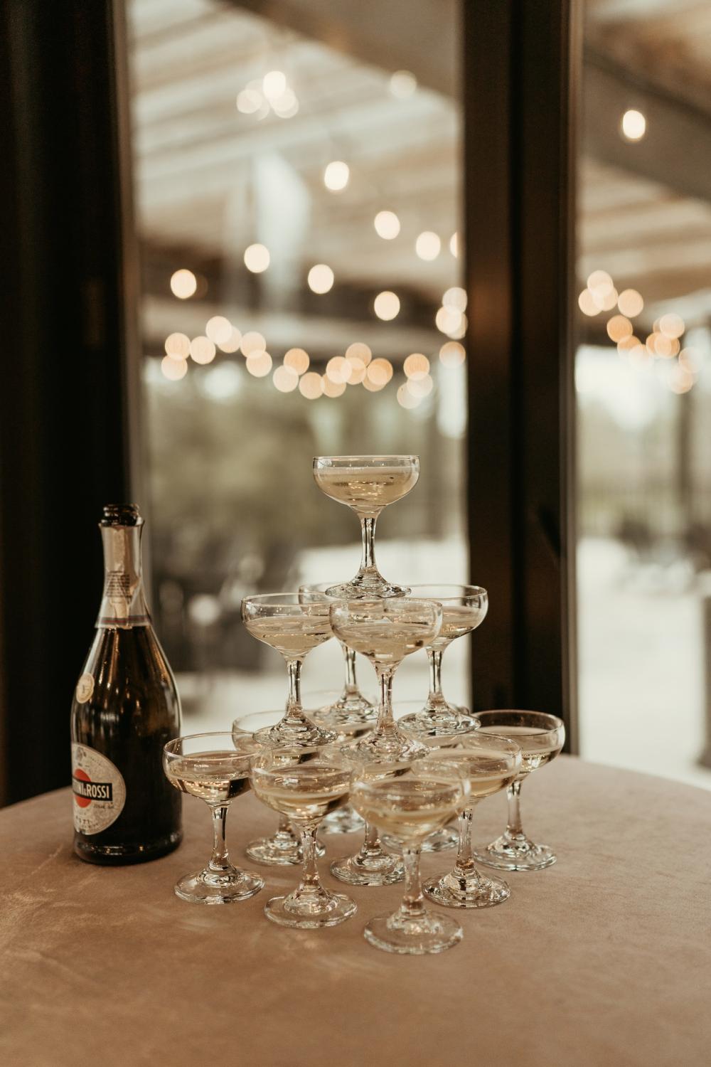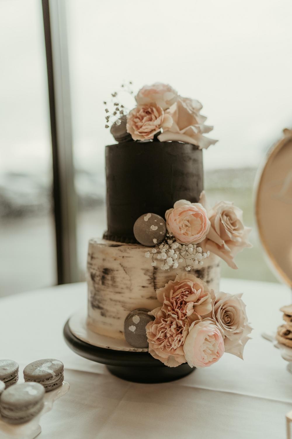 We have to talk about those desserts! Not only did the baker for this photo shoot come up with a stunning cake that is equal parts dark and light like the rest of this shoot, they also curated chocolate chip cookies and macarons for the couple to enjoy. The addition of white dots on the macarons was the perfect touch for this shoot. Everything looks so delicious! Another fun detail that the team added was a champagne tower for the happy couple to toast with.