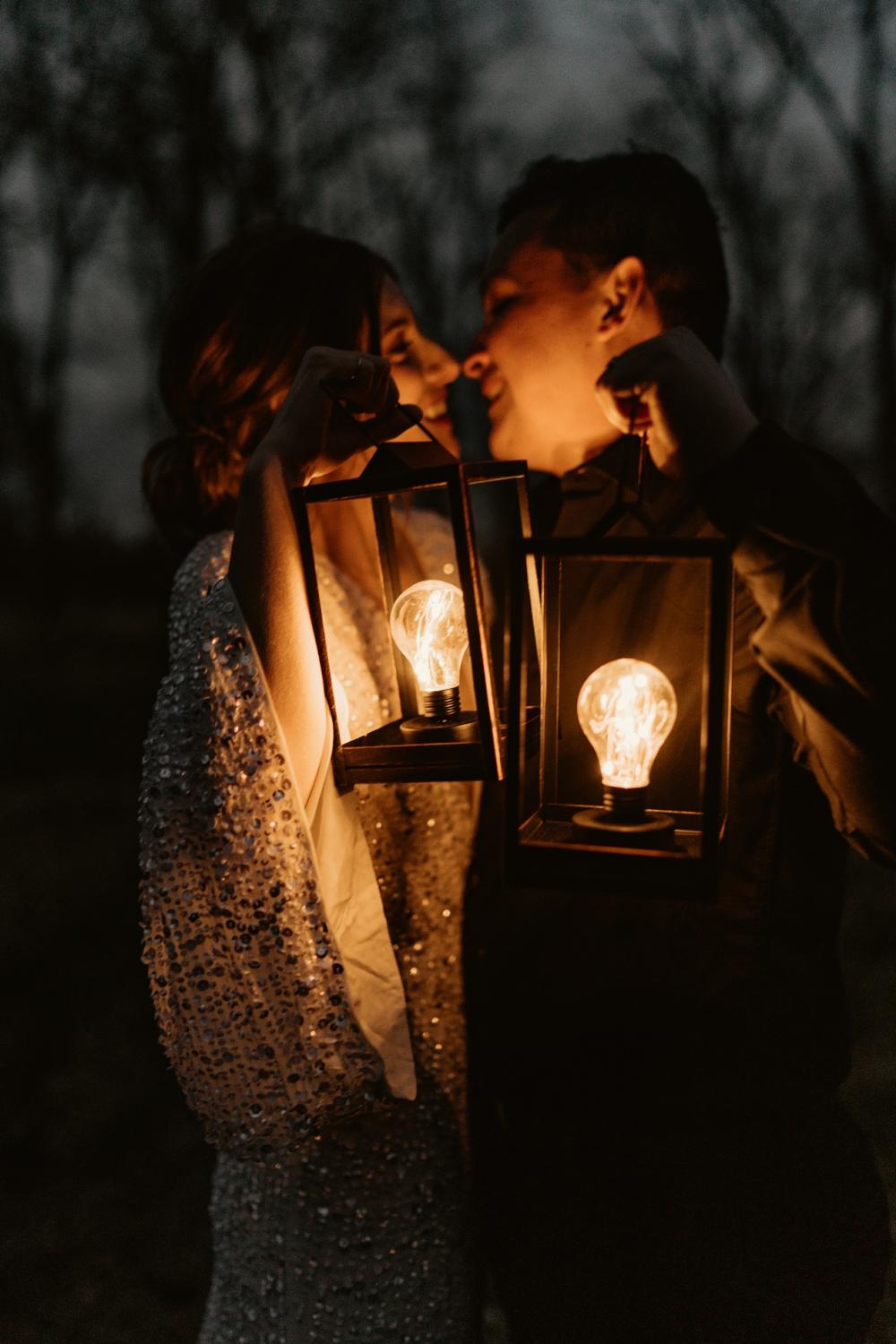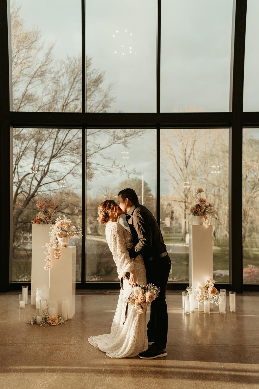 The venue offers a blank slate that can be decorated as a couple sees fit. For this shoot, being surrounded by glass creates an elegant yet ethereal feel that is perfect for a decadent celebration of love. "It offered the tall, dramatic windows from floor to ceiling and concrete floors," Gabriella raves. "The venue was a fantastic addition." Despite the rain on the day of the shoot, the team was able to utilize the area around the venue for some unique sunset photography experiences, like a lantern lit photo-op!