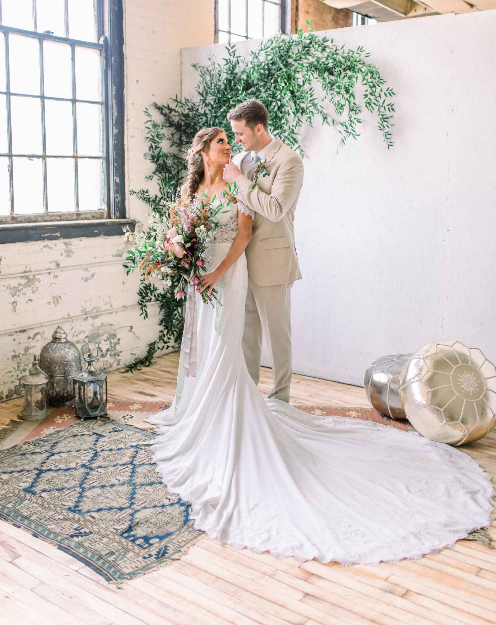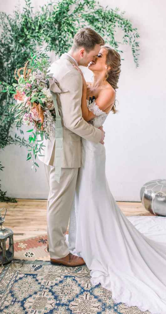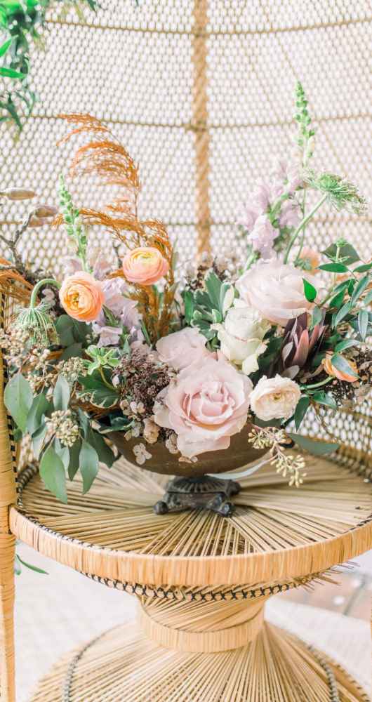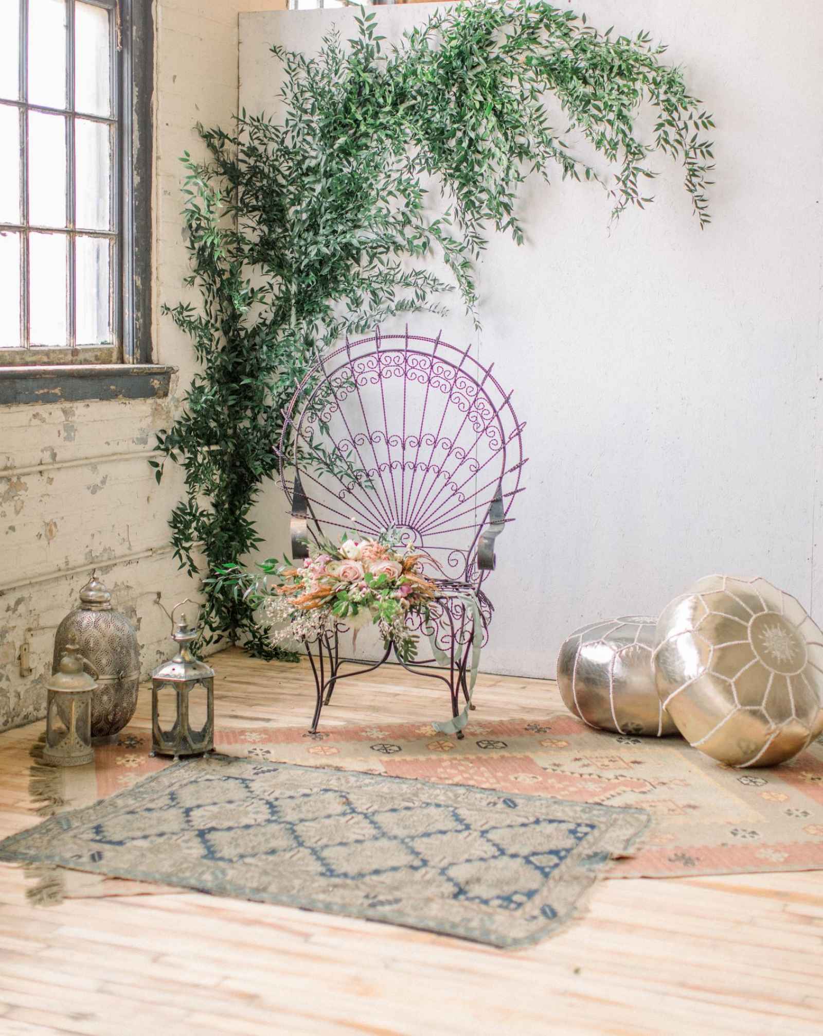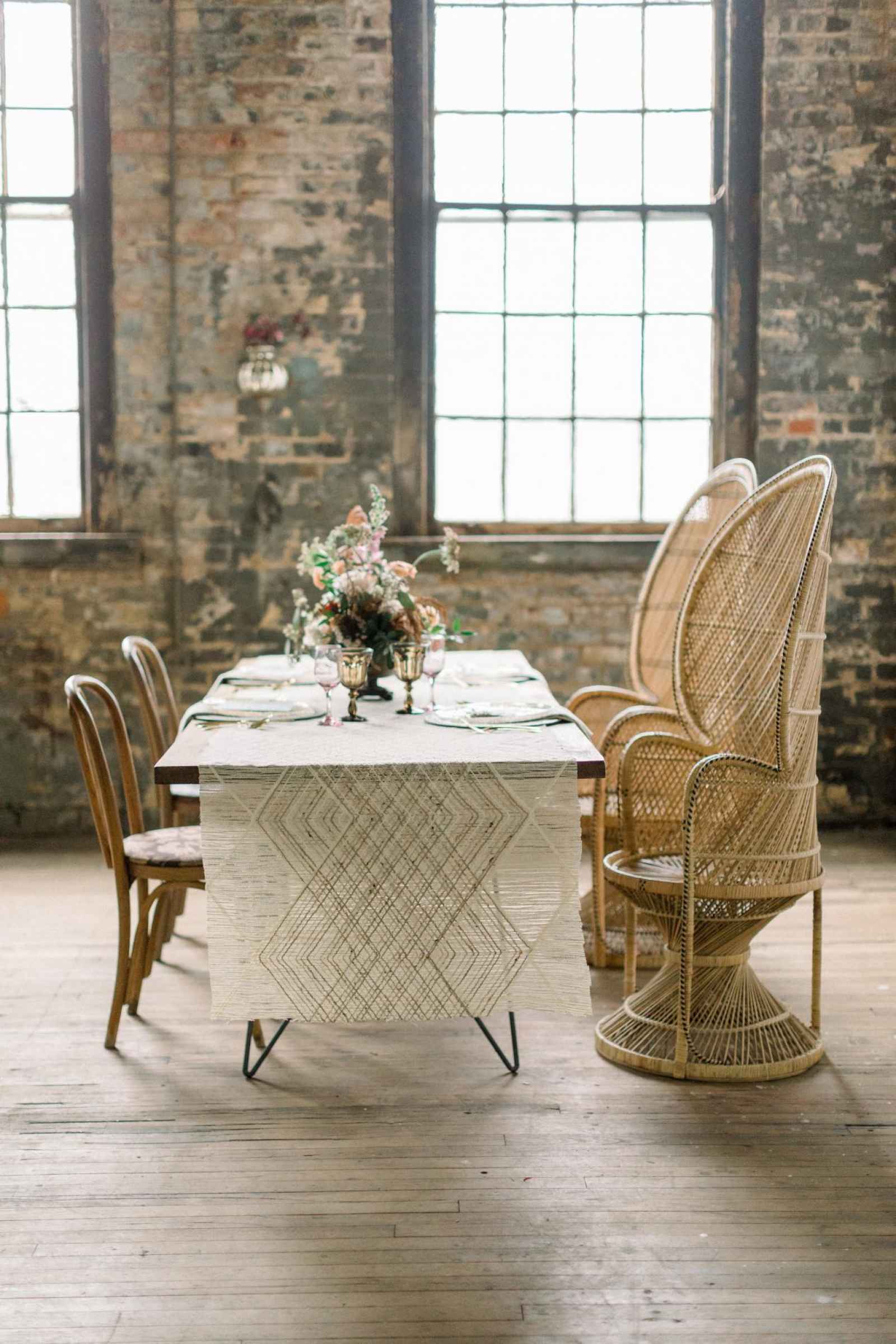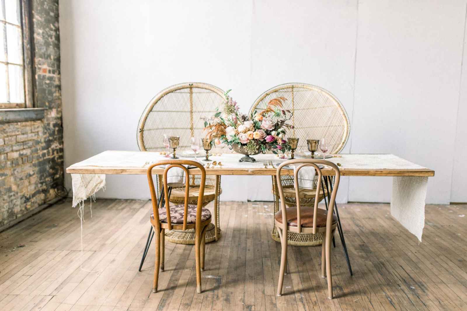 Queen City Vignette, a vintage rental company, helped to select vintage Moroccan rugs, lamps, his and hers peacock chairs and an eye-catching farmhouse table complete with handmade, iron hairpin legs.