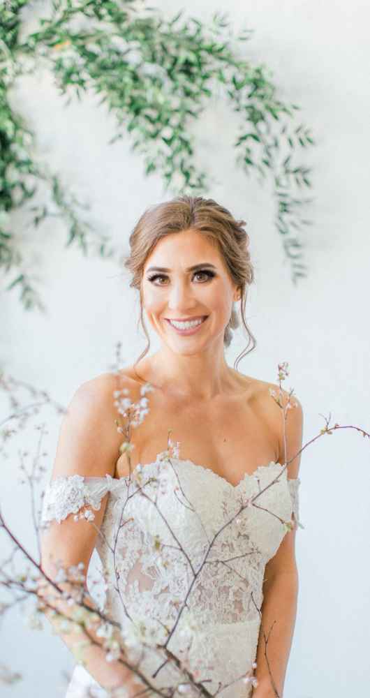 “Because we were going for more of a relaxed feel, I didn’t want a traditional princess dress,” says Christine. I knew I wanted off-the-shoulders with delicate, lace detail to make it elegant and a long train to give it that ‘wow’ factor.” The bride’s hair was kept warm and natural.