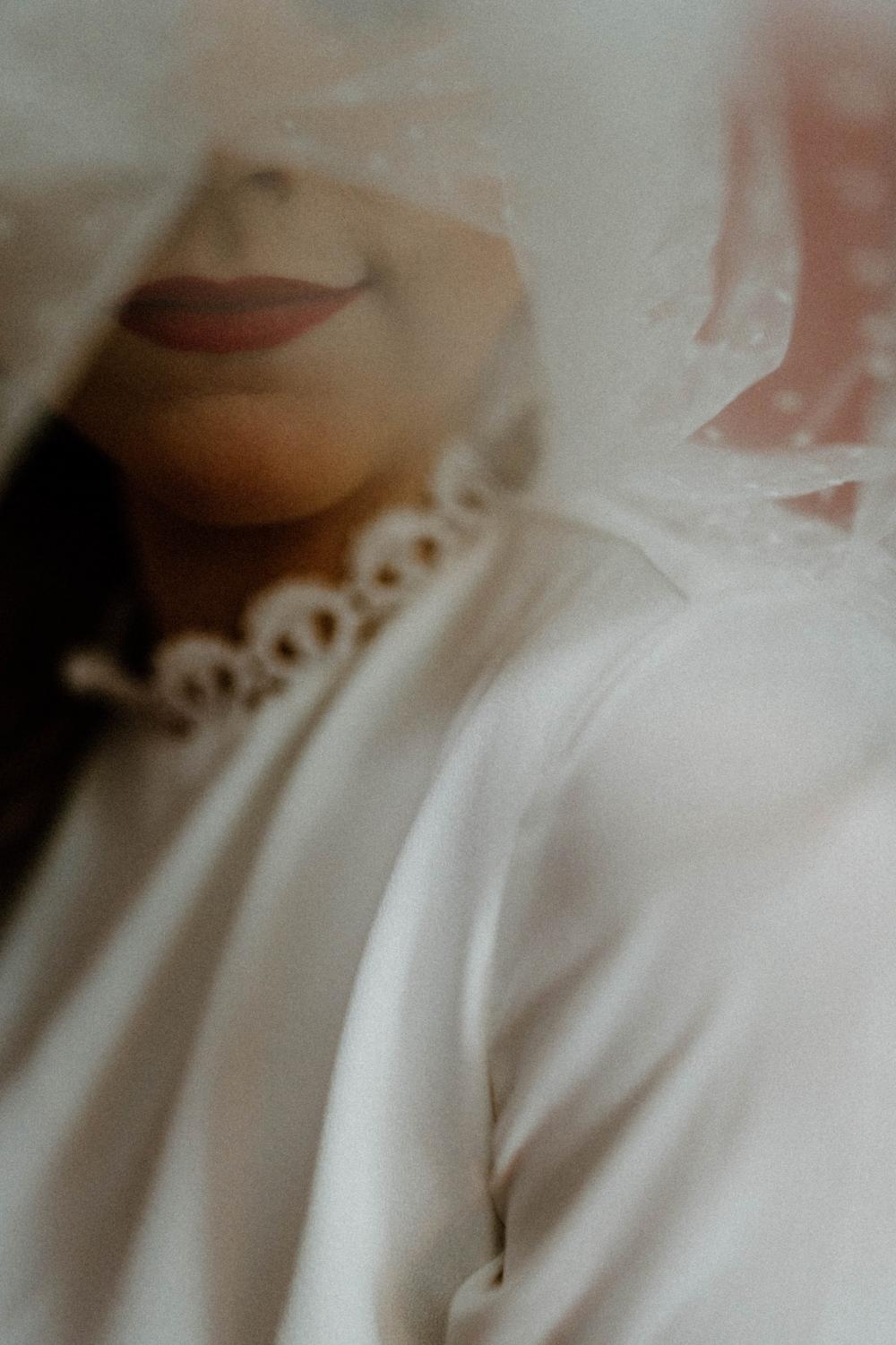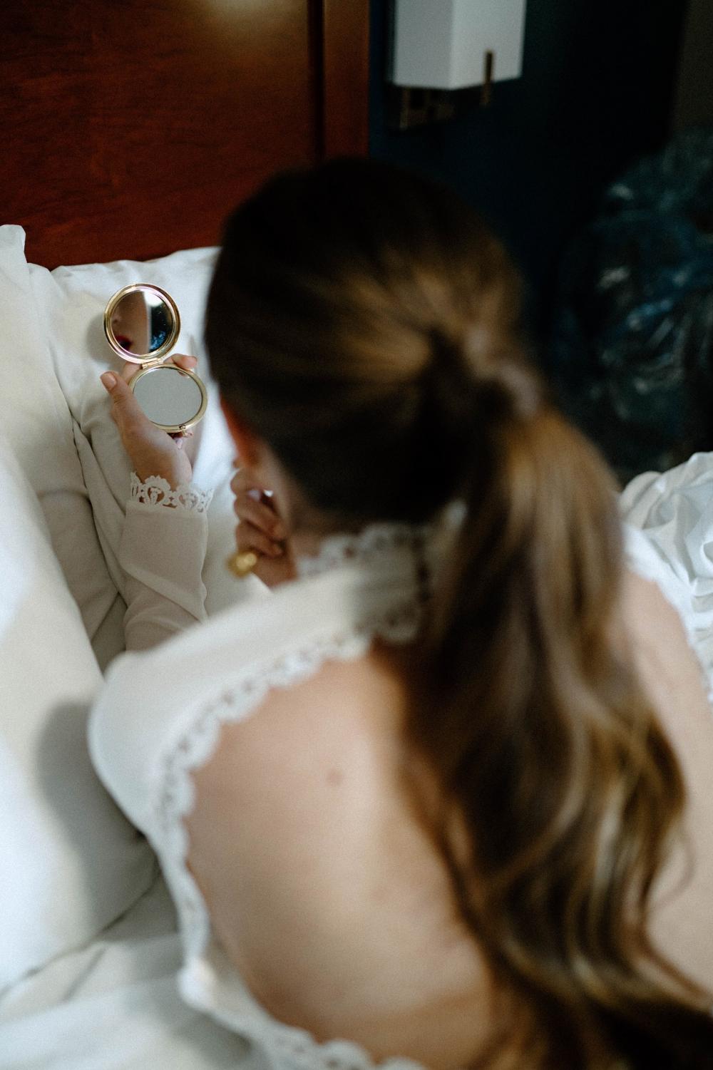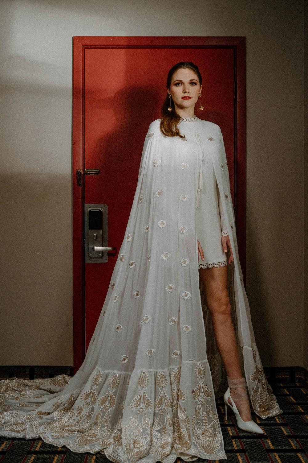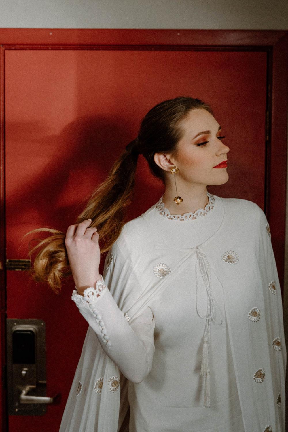Now let's look at that dress! The elegance of the cape from The Frock Bridal House and the glamorous simplicity of this dress are everything Alexis Rose would love. There's a vintage feel to the dress, especially with the addition of that bright red lip. The bridal model is actually a makeup artist, so she was able to style her whole look, which made for some fun shots with her and the compact on the bed. We love the addition of the golden headband and beautiful flower earrings. And the high ponytail is classic Alexis!