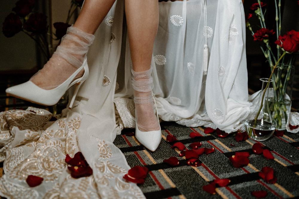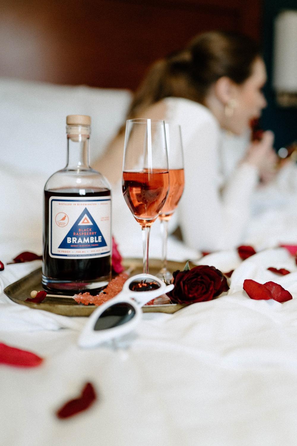 Alexis would definitely know all the hot trends in the wedding world, so this boujee-on-a-budget shoot couldn't happen without including all the popular fads right now. We love that many elements of the shoot center around the iconic last name of the main family, Rose. The abundance of roses in this shoot amp up the romanticism of the motel room while the rose colored drinks and rock candy elevate the elegance and fun.