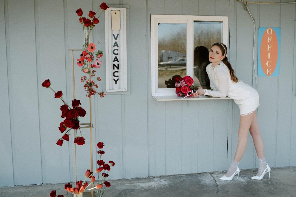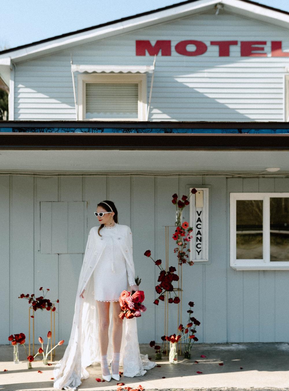 Inspired by the character Alexis Rose from Schitt's Creek, Ashlyn from Ashlyn Peters Photography wanted to create a style shoot to show what Alexis's wedding may have looked like. Ashlyn says, "I'm a fan of the show, and when I noticed a nearby look-a-like motel, I dreamed of having a solo bridal shoot there. I thought of the idea/concept and worked with an amazing small team of all-women vendors to create something that truly became my passion project."