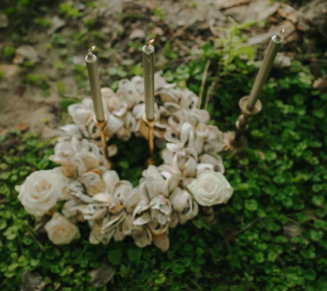 Avoiding the cliché take on nautical, the team carefully chose their color palette and floral design. Be Married Events used dark florals, inspired by the shadows of lake water. Moss, shells and sea glass were also weaved into the bouquets, highlighting their unique vision. Jeri says, ”We wanted to show people that nautical can take on many colors and styles. It doesn’t have to be navy, red and white.”