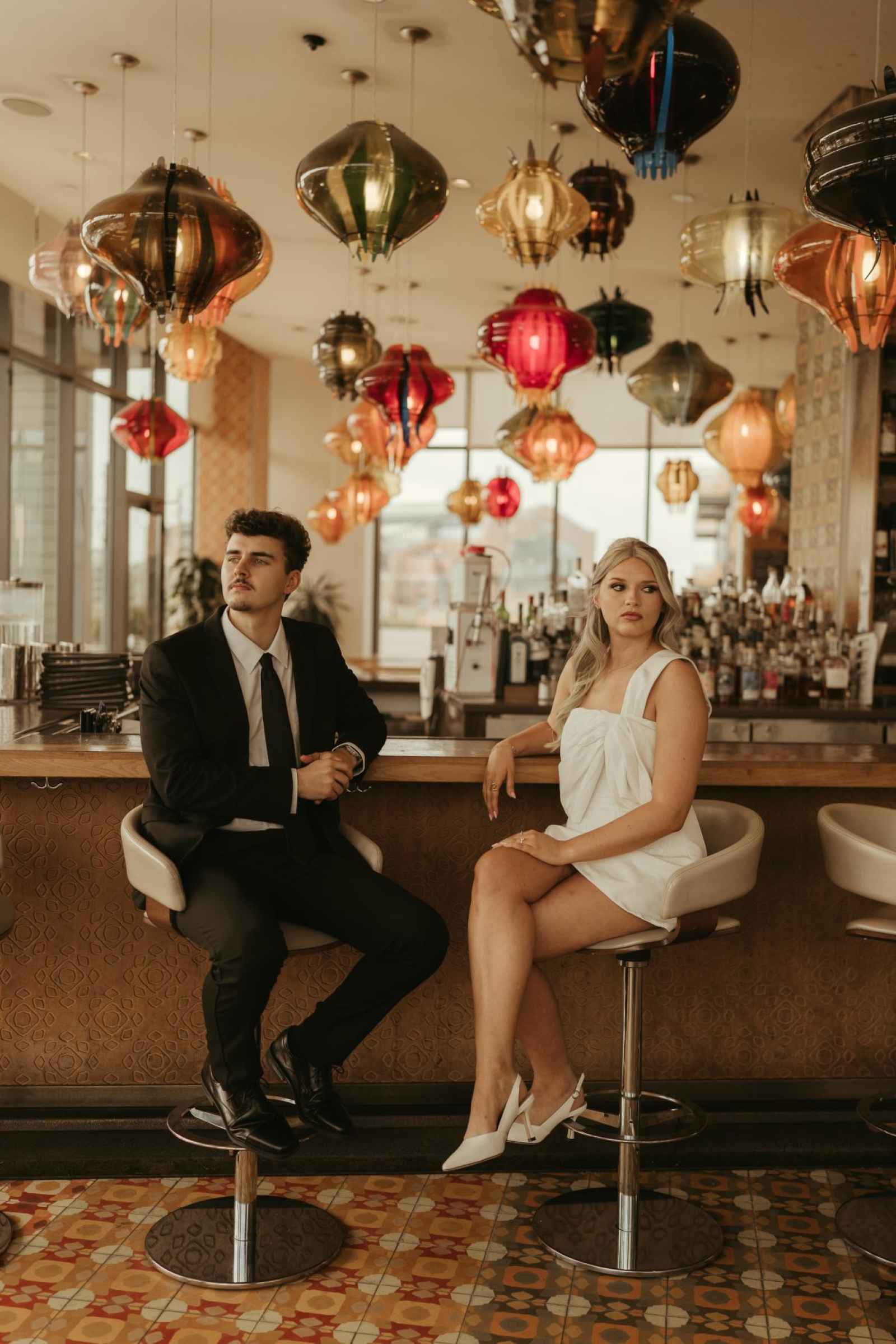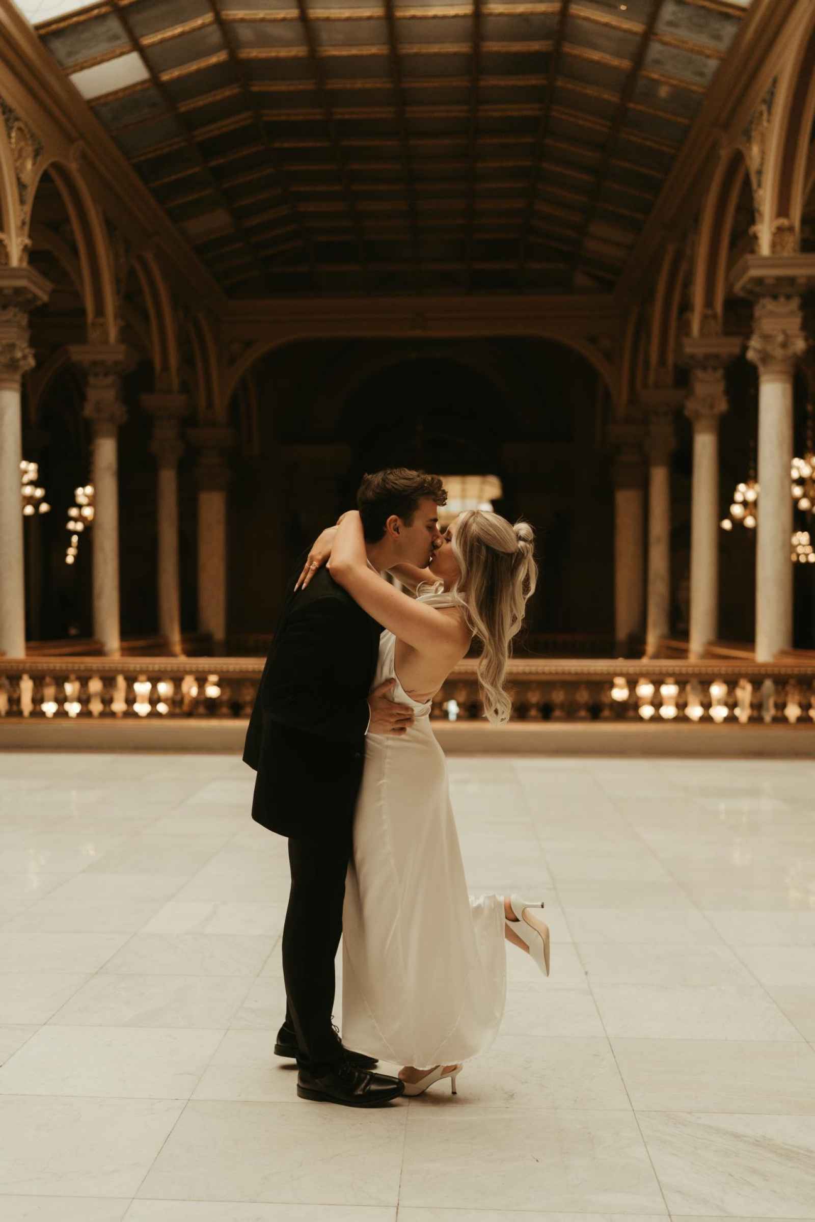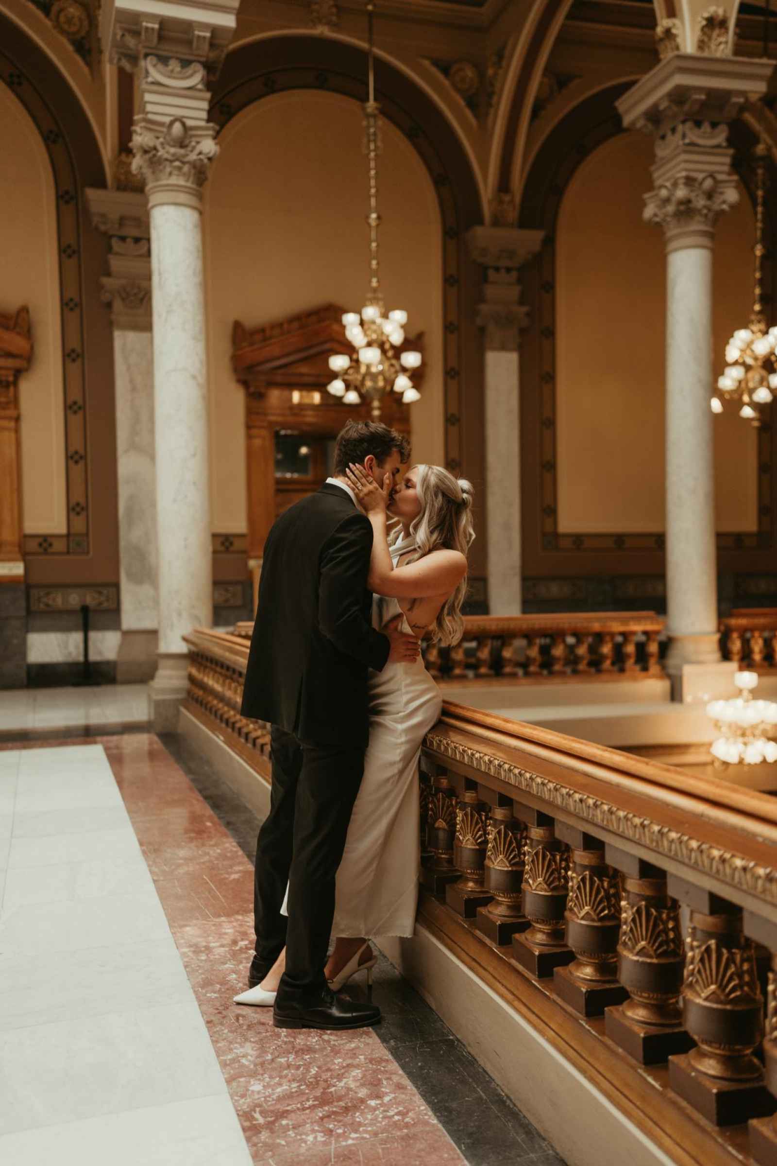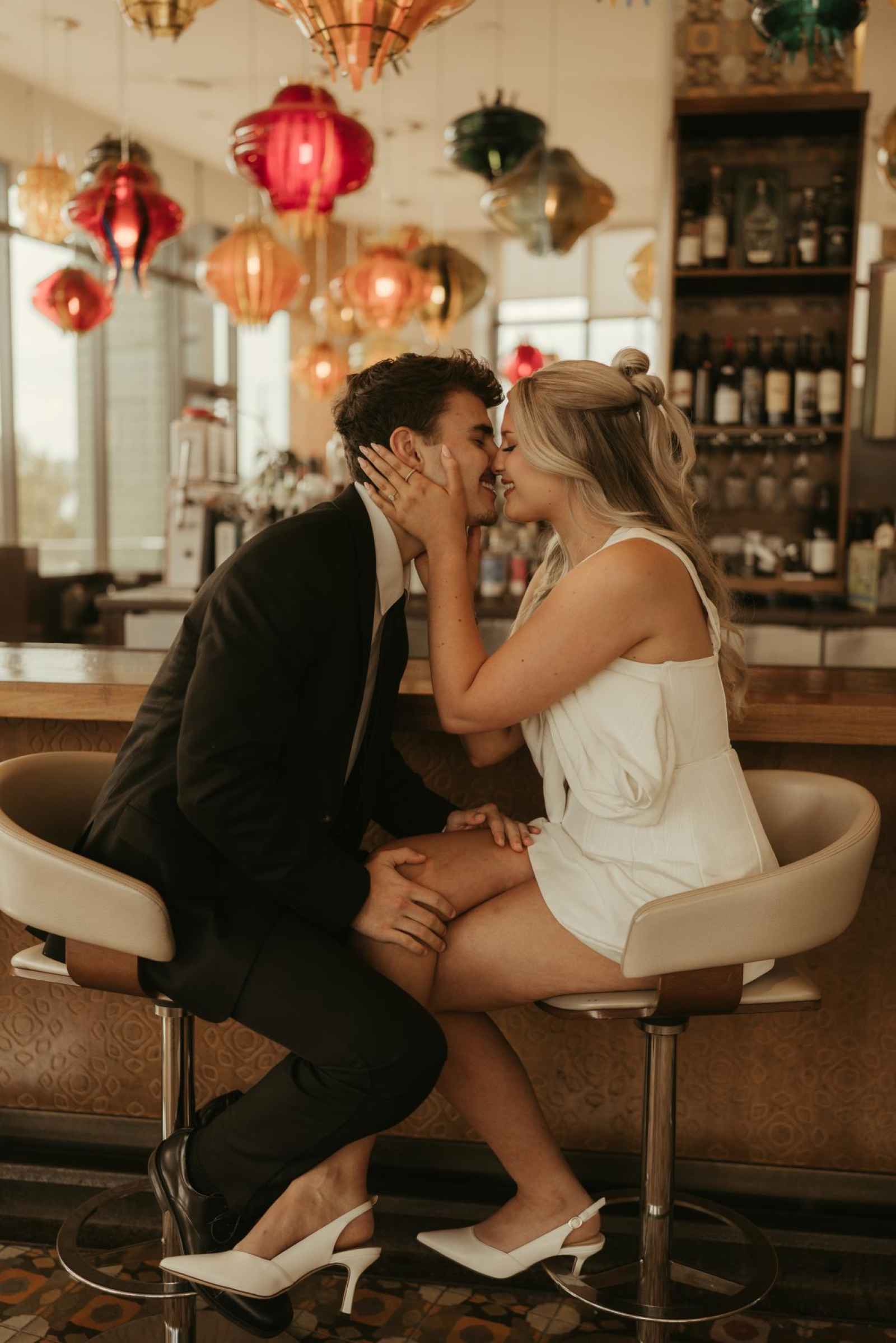 Emma and Spencer opted to shoot at two locations to reflect the different sides of their relationship. Indiana State House offered a stately, elegant backdrop—ideal for the “classy and elevated” photos they envisioned, while Plat 99 brought in a dose of personality with its creative, modern vibe, setting the stage for fun, playful images that showcase who they truly are as a couple!
