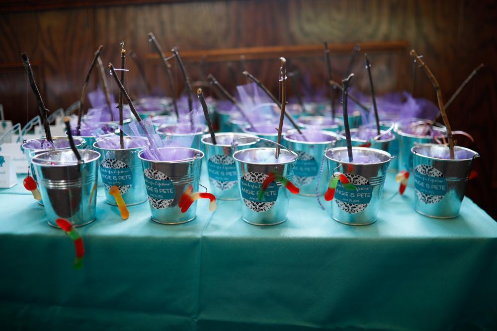 Their fishing treats pair swimmingly with this cake! The whole treat endeavor was a family effort. Angela’s sister-in-law Karen helped Angela a lot with the wedding decor. “She printed label stickers for the tin buckets I used,” Angela recalls. “I collected sticks from our fishing adventures and used those to make mini fishing poles (with real hooks) and put gummy worms on for bait.”