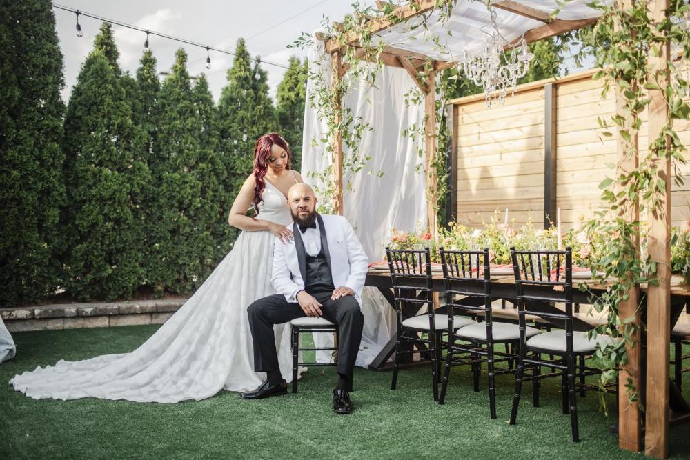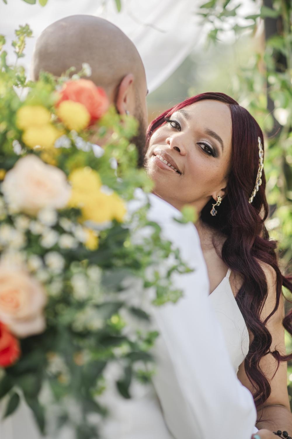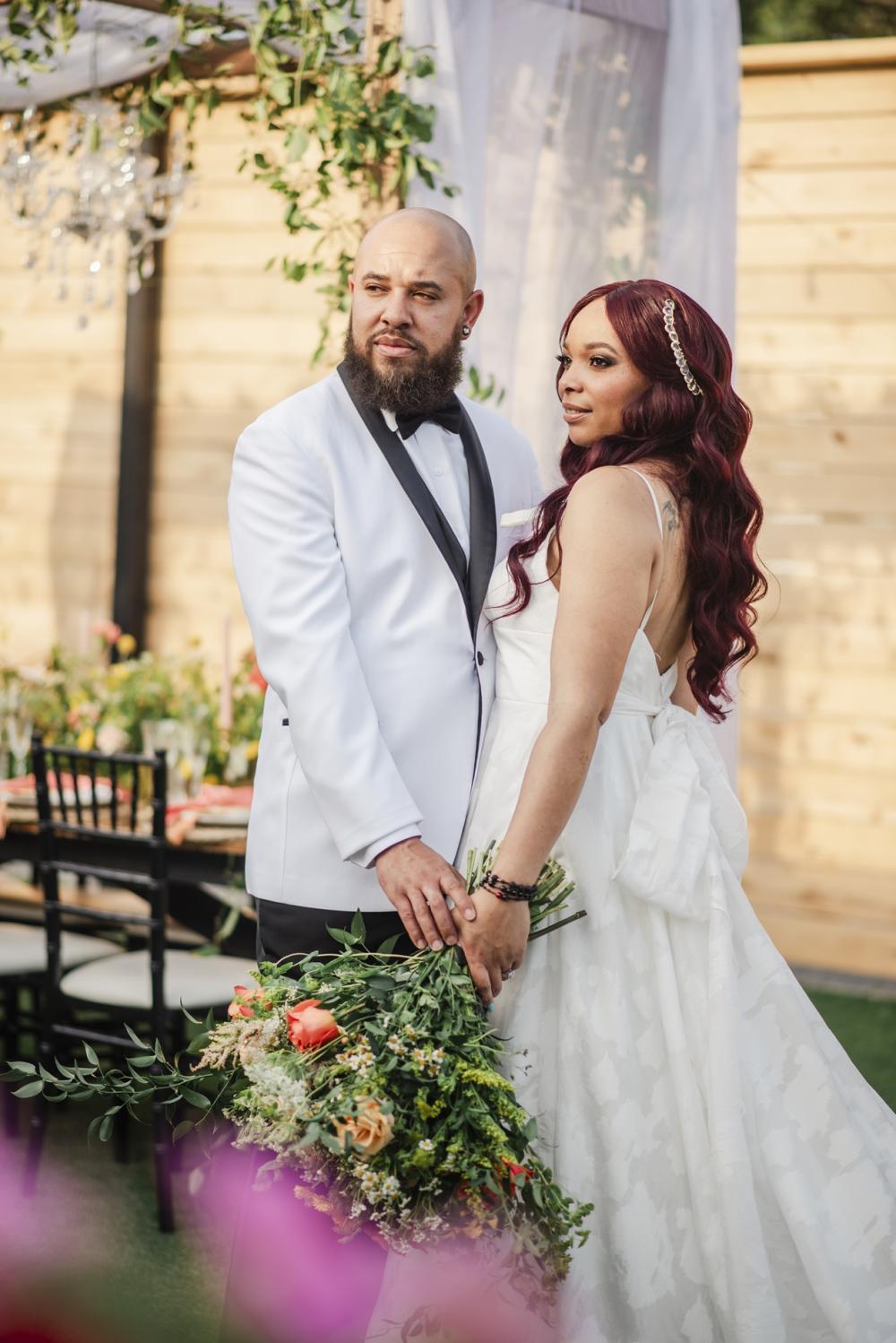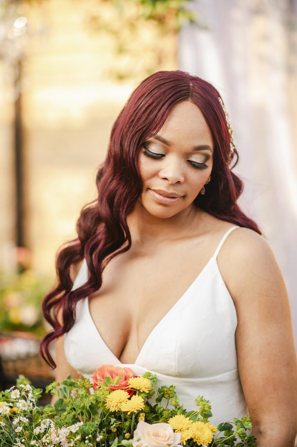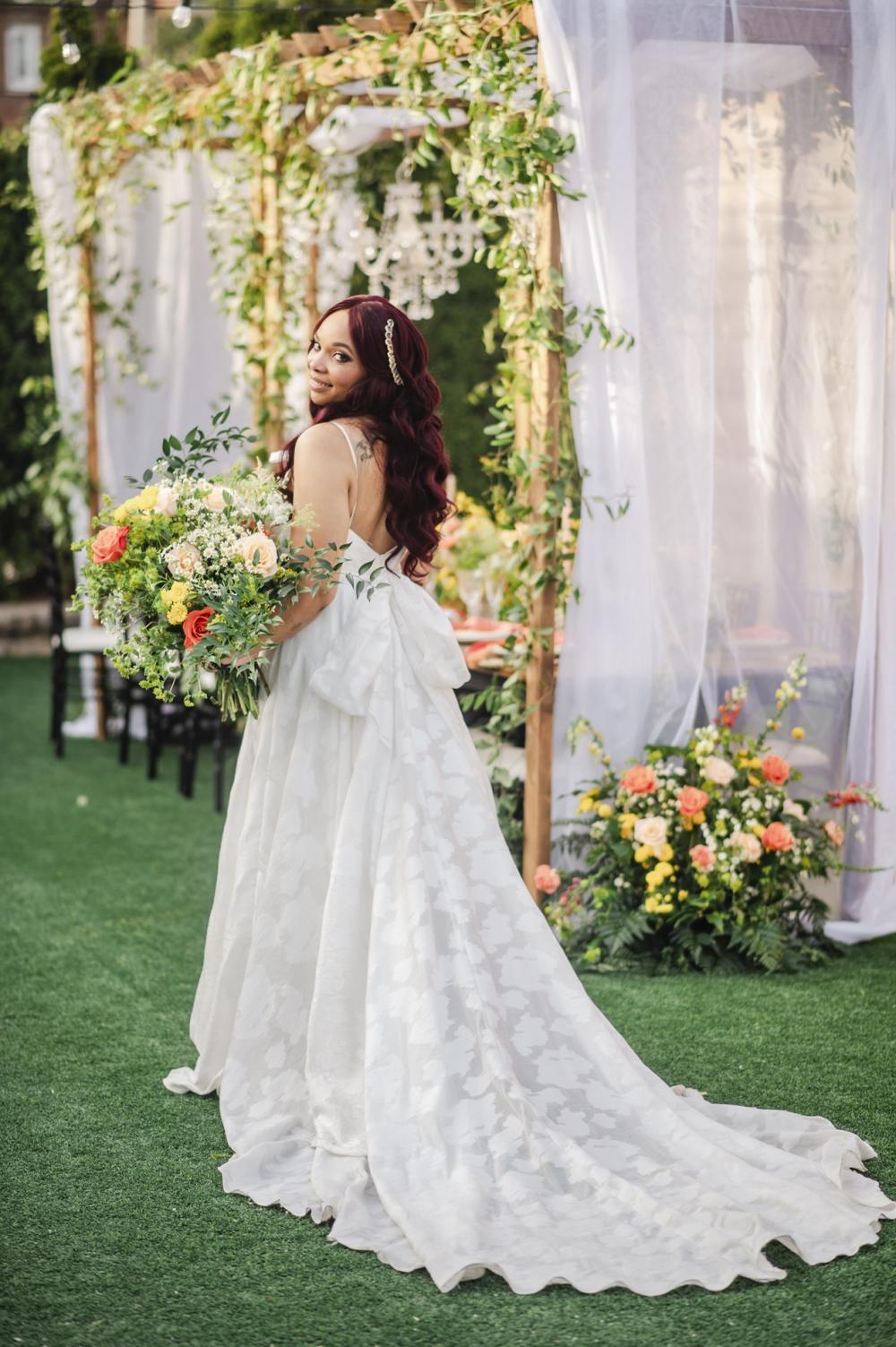 Every style shoot needs a blushing bride, and the one in this shoot is absolutely stunning! Her deep-V gown from The Frock Bridal brings an air of whimsy into this shoot. The full, floral skirt matches well with the greenery around the space as well as that flowing drape around the wooden frame in the ceremony. We think the big bow on the back is the perfect touch! As for the bride's hair and makeup, the team kept it classic to go with the elegant aspect of this shoot. We are obsessed with the smokey eye and perfect curls in the bride's hair!