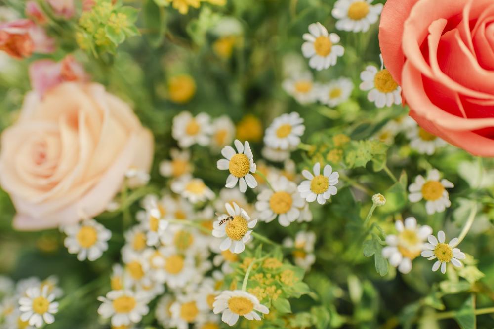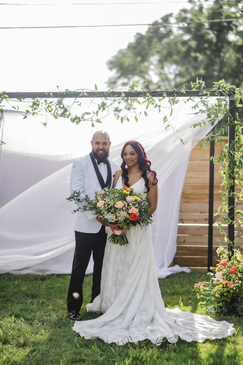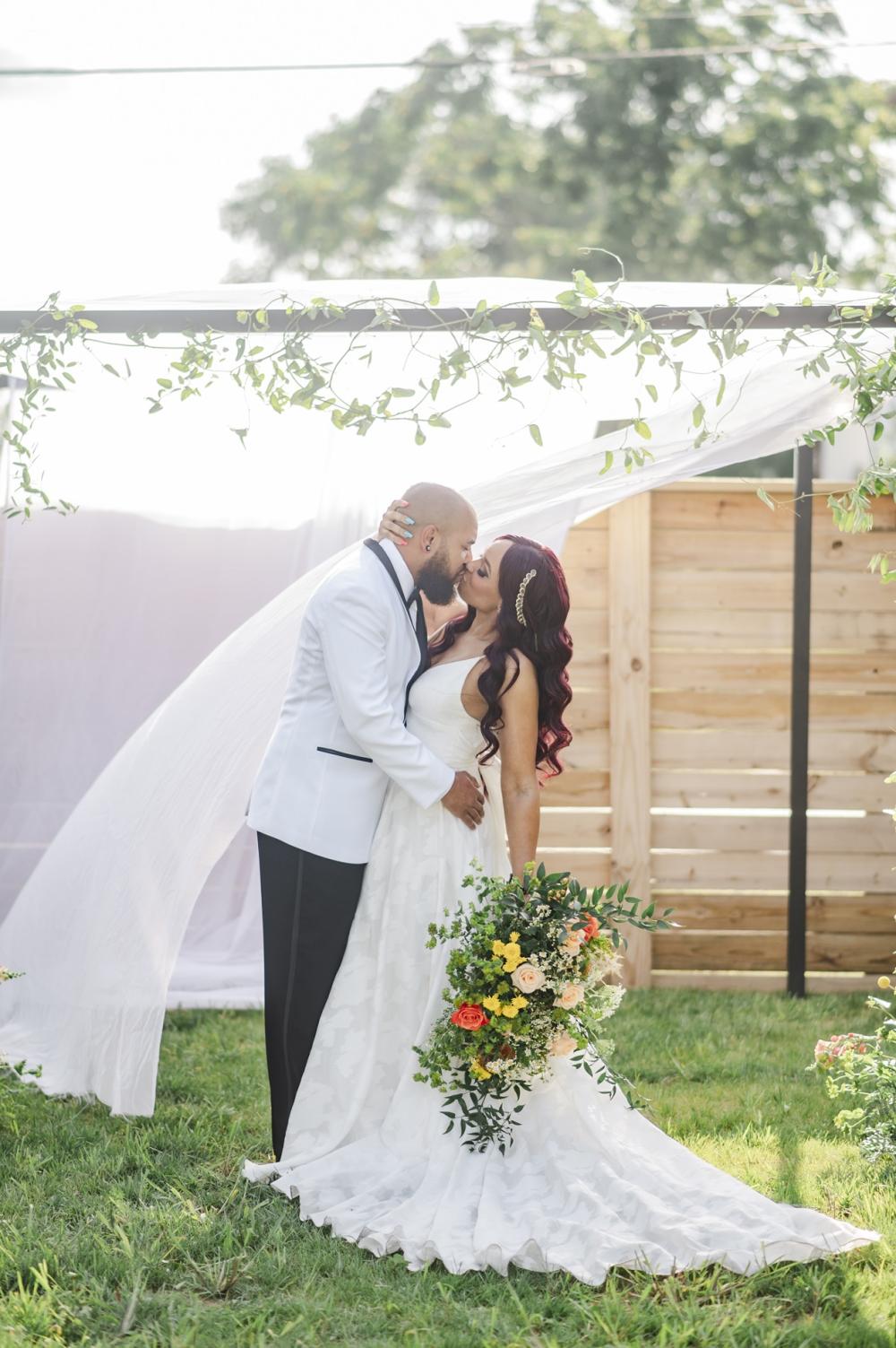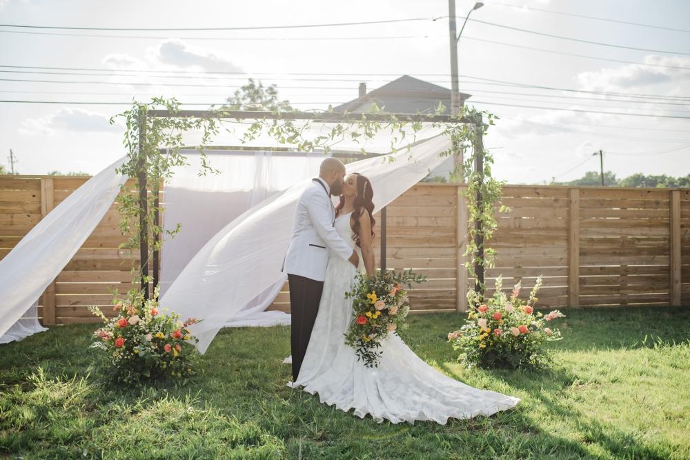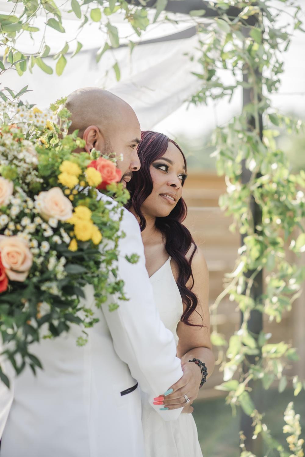 Every style shoot needs a blushing bride, and the one in this shoot is absolutely stunning! Her deep-V gown from The Frock Bridal brings an air of whimsy into this shoot. The full, floral skirt matches well with the greenery around the space as well as that flowing drape around the wooden frame in the ceremony. We think the big bow on the back is the perfect touch! As for the bride's hair and makeup, the team kept it classic to go with the elegant aspect of this shoot. We are obsessed with the smokey eye and perfect curls in the bride's hair!