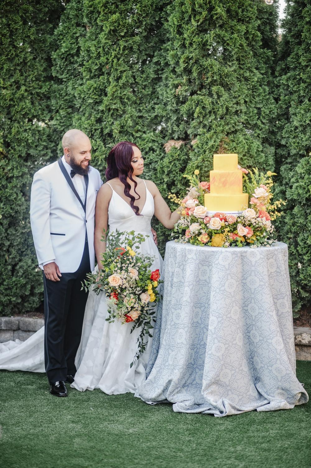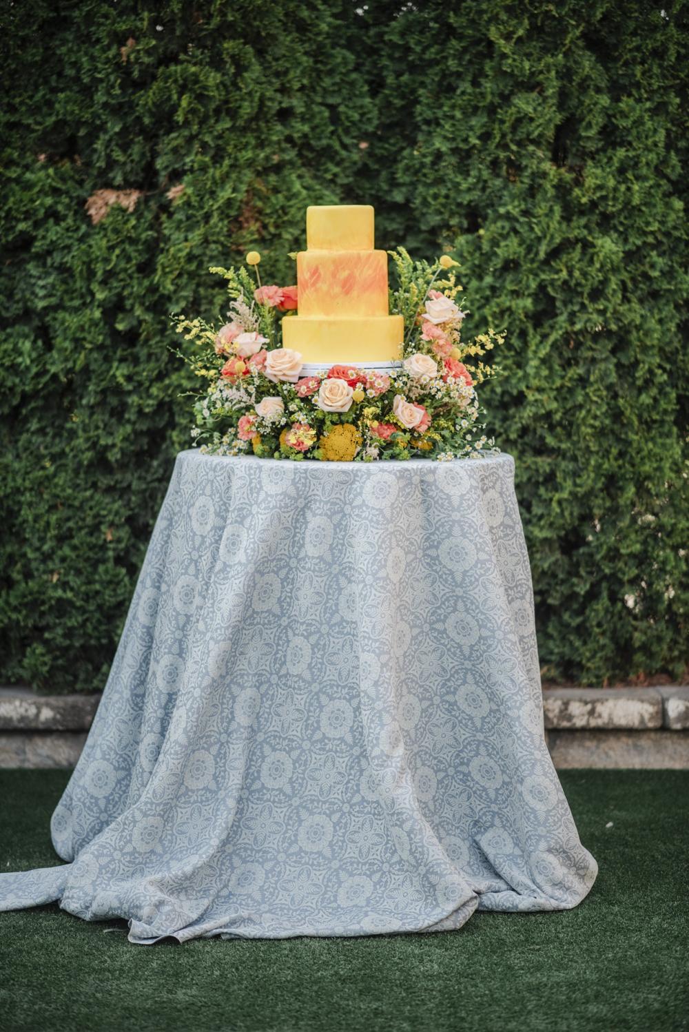 When asked about that delicious three-tiered cake, Beth exclaimed, "YUMMY!" Though the cake is rather simple in design, the colors are the perfect match for the plethora of florals that surround it. We love the blended yellow and orange that almost remind us leaves in the peak of autumn!