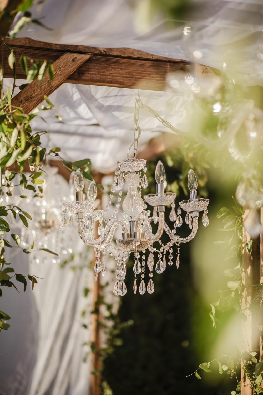 This style shoot is the epitome of understated elegance! The simplicity of the wooden frame with flowing white sheets creates such an elevated look without overwhelming anything else. What we really love are the crystal chandeliers that are mounted over the tablescape. They tie so beautifully to the crystal glasses on the table. With florals along the center of the table and greenery wrapped around the wooden frames, this dinner scene is so elegant and romantic! The golden silverware tops off this high end tablescape, and Beth Waterman Photography caught all the beautiful details flawlessly.