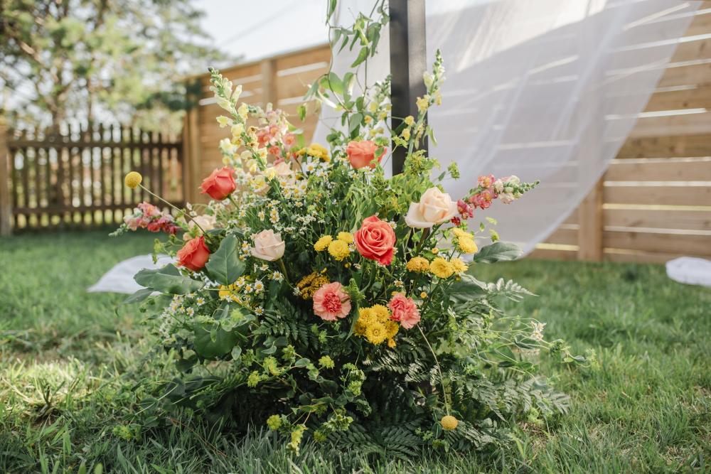 Inspired by the warmth of summer and the bright colors that dapple the trees in fall, Beth's design and floral company Flora + Flame created this elegant ceremony scene. They chose plenty of sunny florals that also remind us of the changing leaves. "We chose a mixture of roses combined in with Feverfew, button poms and Billy balls for a whimsical late summer look," Beth shares. "Not to mention the amazing smell this combination of florals provided." We love all the textures and colors found in this simple décor item!