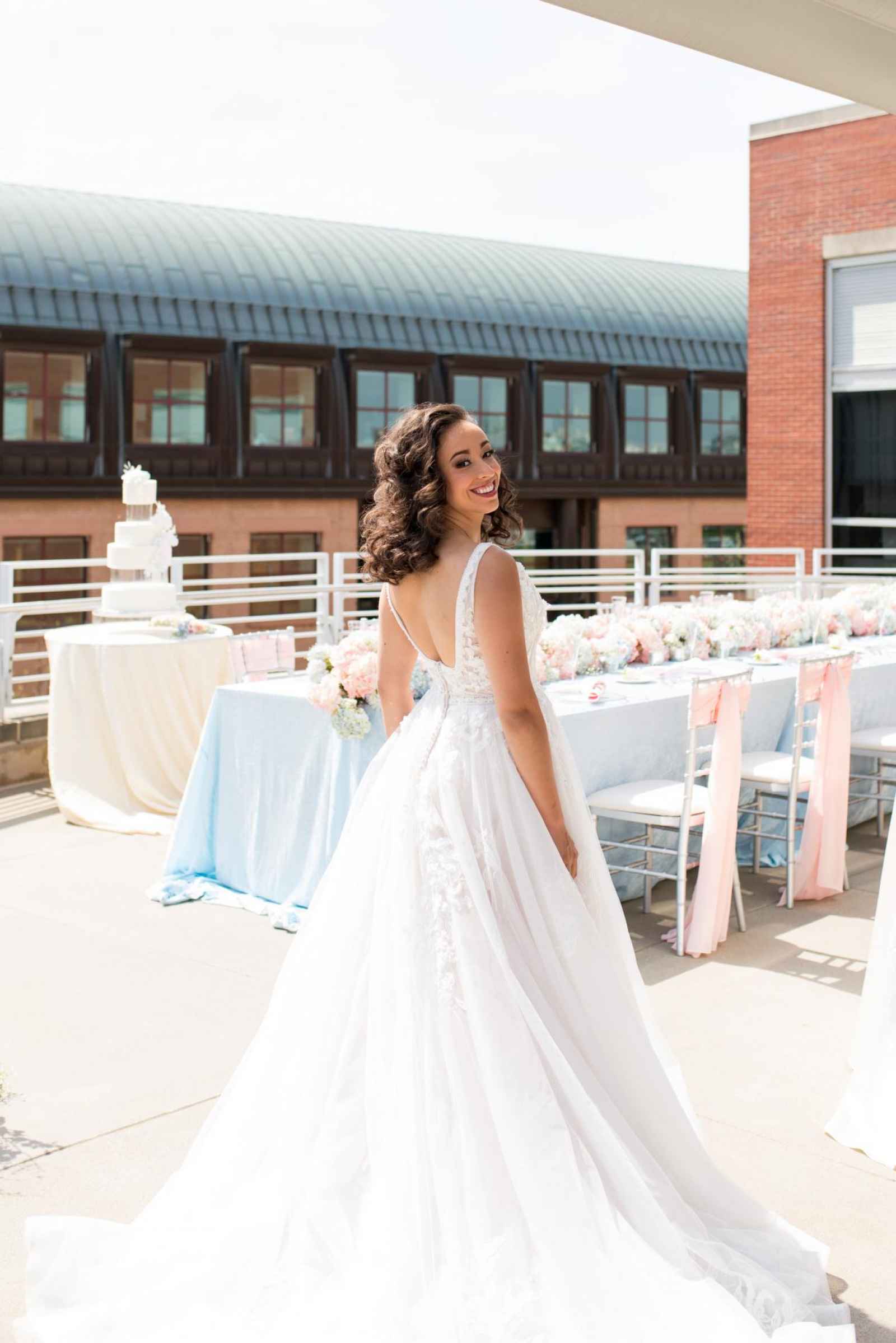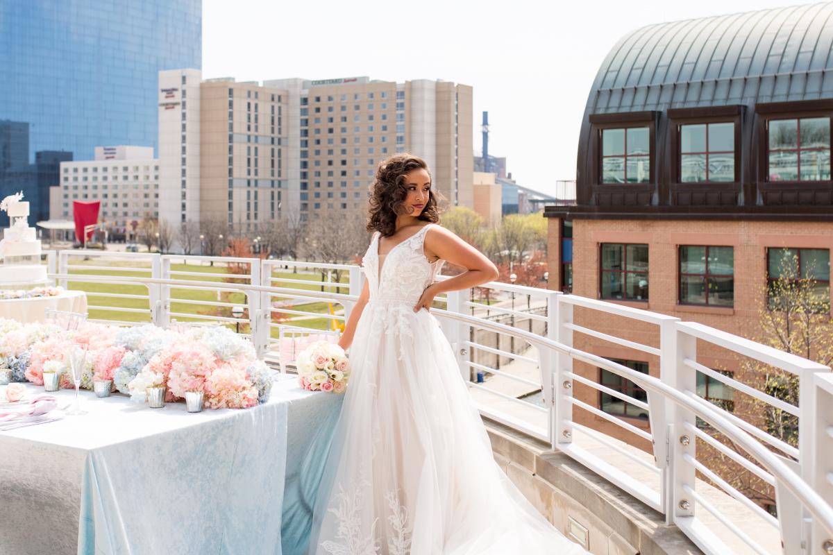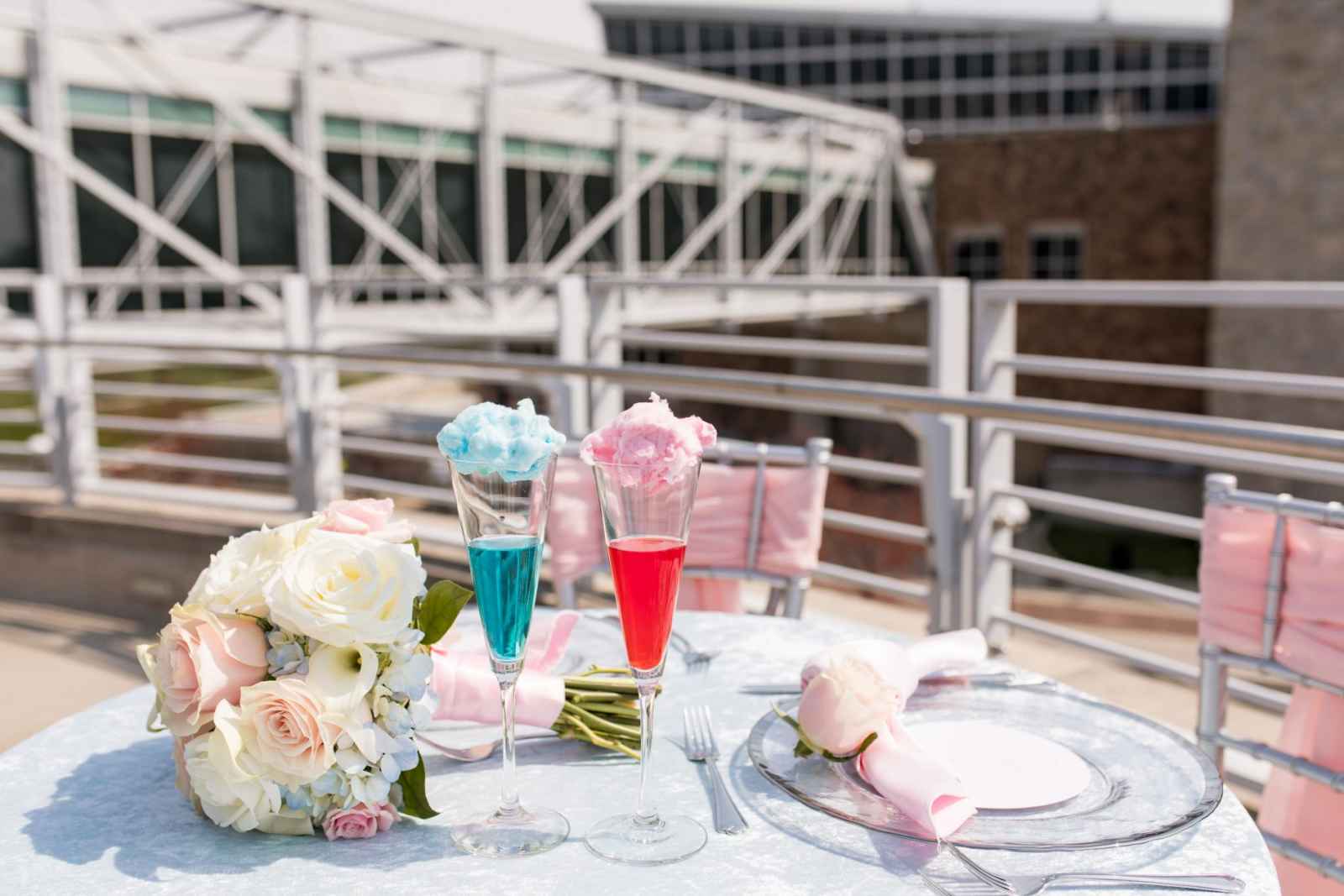 The private nature of the upper terrace not only offered a chic setting for this luxurious shoot, but also boasted views of the beautiful Indianapolis city skyline. Anna says, "We aimed for fun, dreamy and whimsical, and the terrace touched the cotton candy clouds in the sky, making for a perfect opportunity to showcase the creative lengths one can go with a small event space."