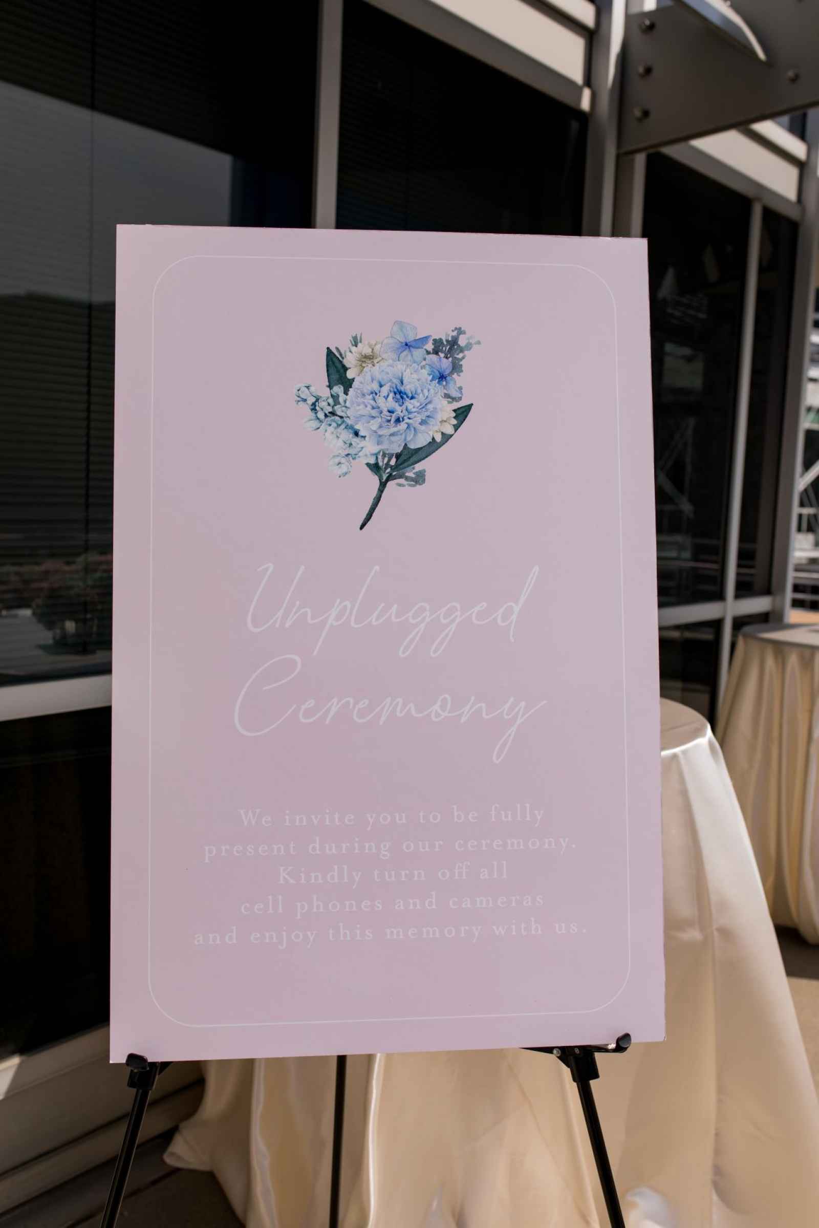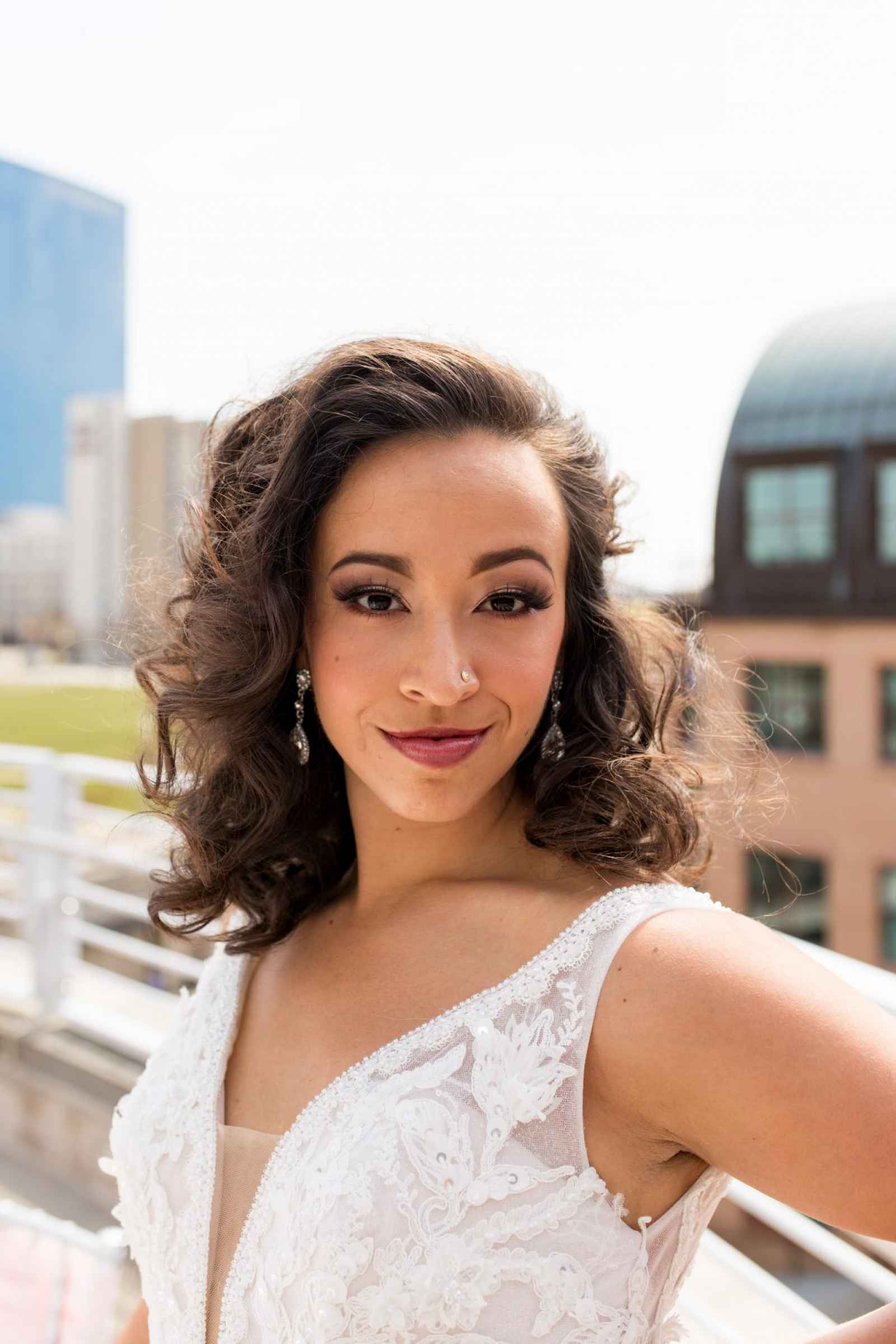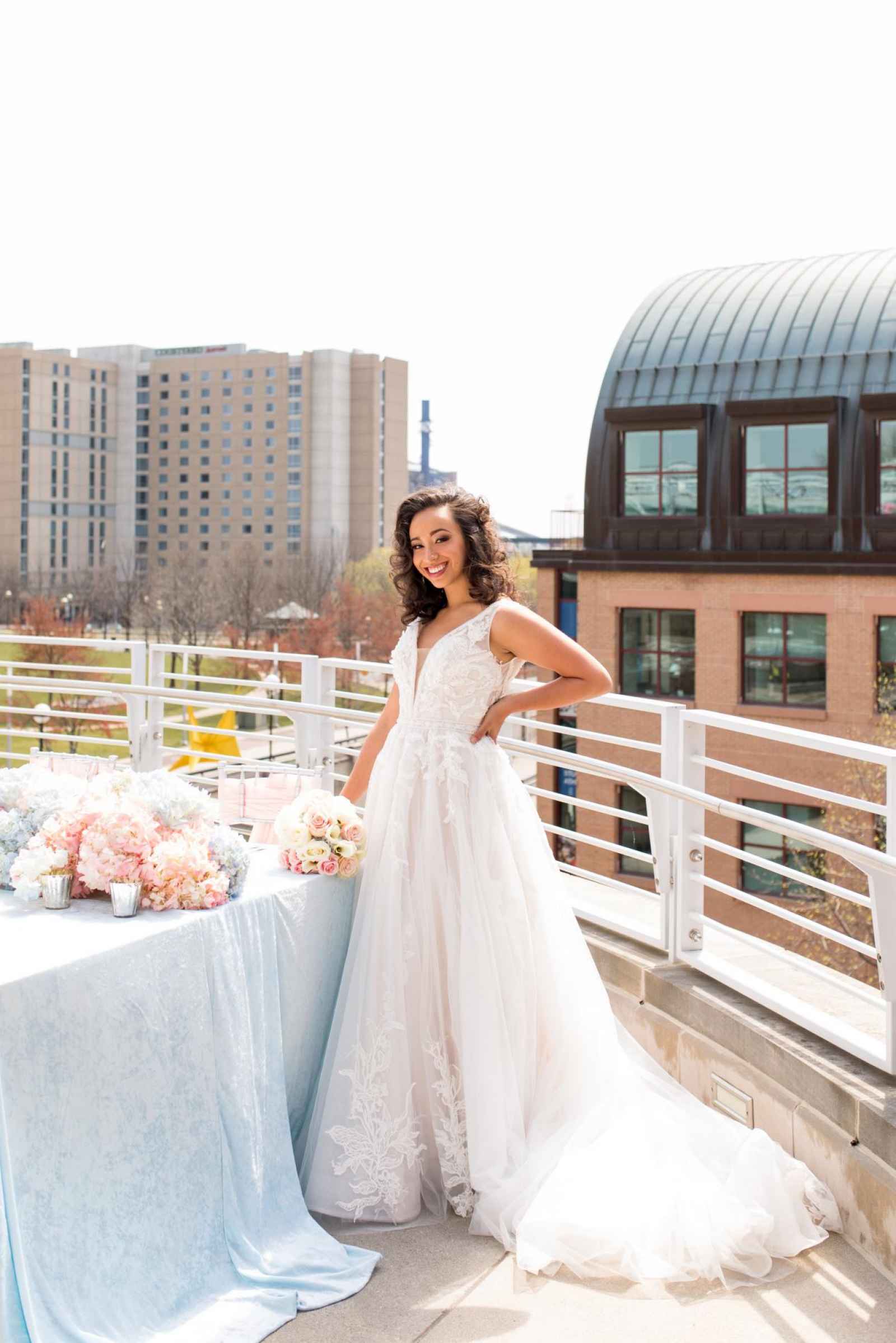 The private nature of the upper terrace not only offered a chic setting for this luxurious shoot, but also boasted views of the beautiful Indianapolis city skyline. Anna says, "We aimed for fun, dreamy and whimsical, and the terrace touched the cotton candy clouds in the sky, making for a perfect opportunity to showcase the creative lengths one can go with a small event space."