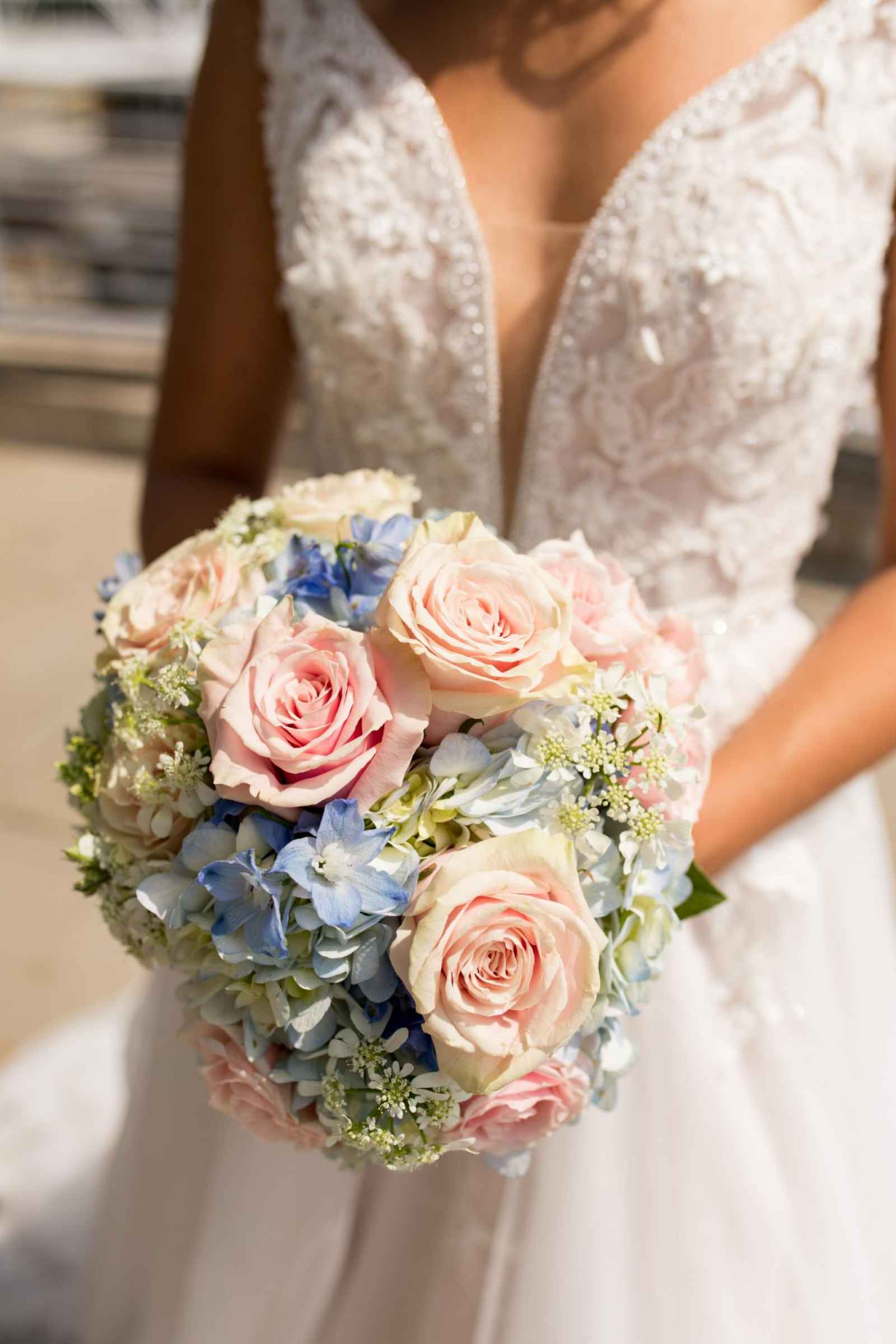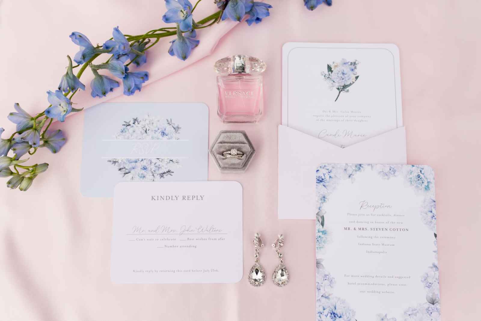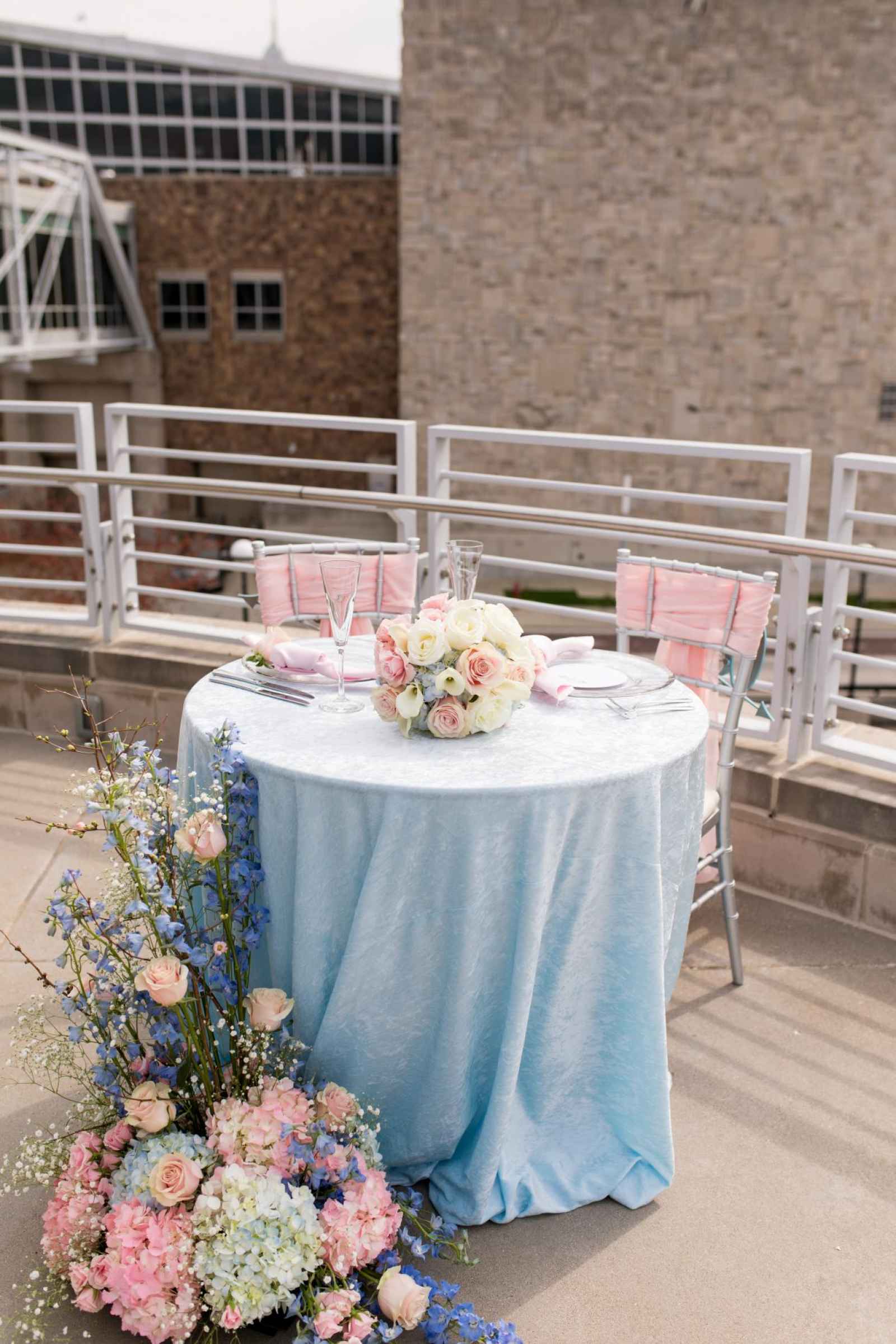 With micro weddings continuing to gain popularity, Anna Delph, intern at the Indiana State Museum, desired to show off the venue's intimate terrace space. She had a dreamy, magical vibe in mind, and selected the color palette of blush and light blue to execute that style. Teaming up with other local vendors was a must to bring this vision to life! Anna says, "I reached out to Autumn Howell Photography and JP Parker Flowers, who then brought Blue Llama Events into the mix. Autumn Howell truly spearheaded the endeavor by bringing her artistic vision to the photo shoot." Scroll on to see more of this cotton candy-inspired, whimsical style shoot!