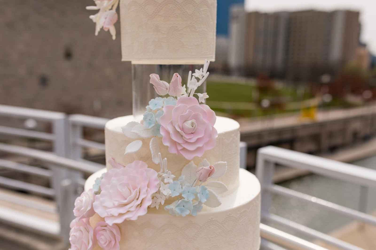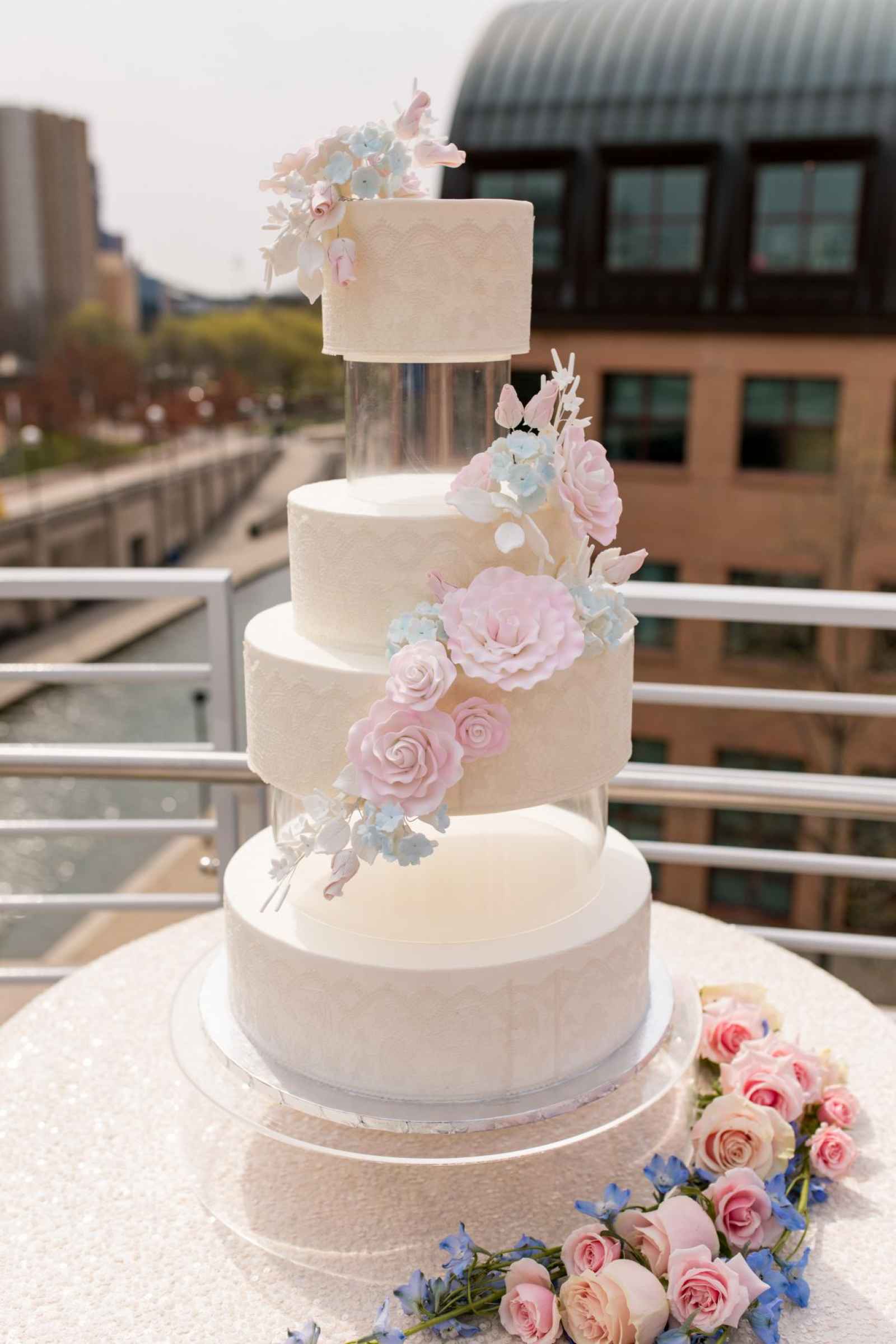 The magic continued in this enchanting dessert! The simple, four-tier cake was adorned with light blue and blush flowers cascading down its side. The addition of the clear tier separators increased the height of the cake as well as added a magical, floating effect.