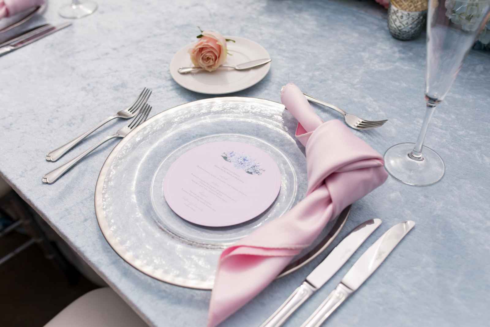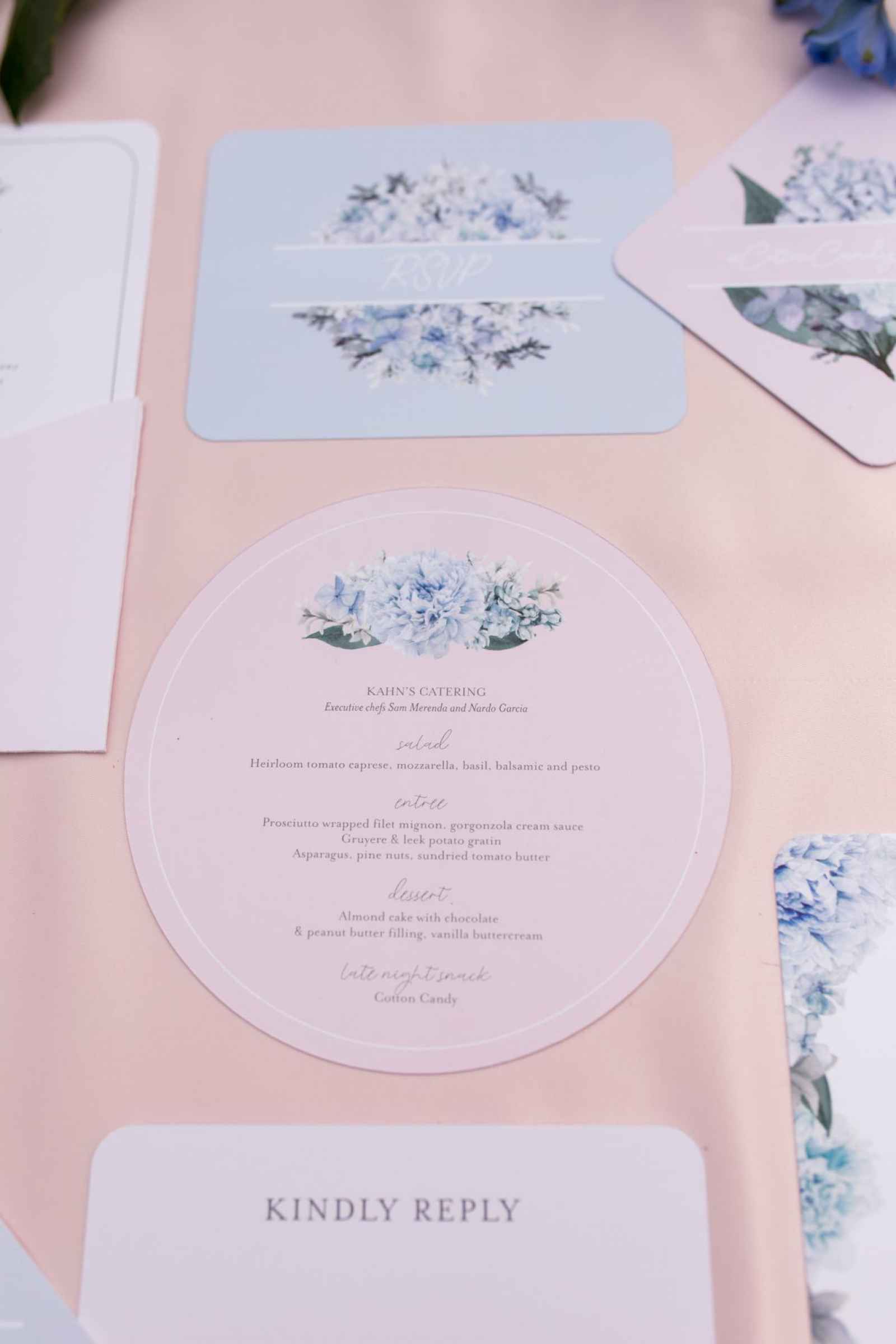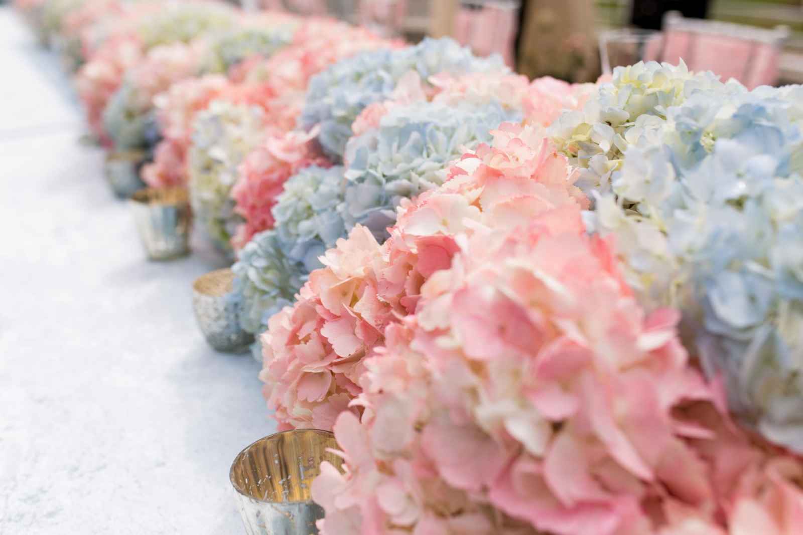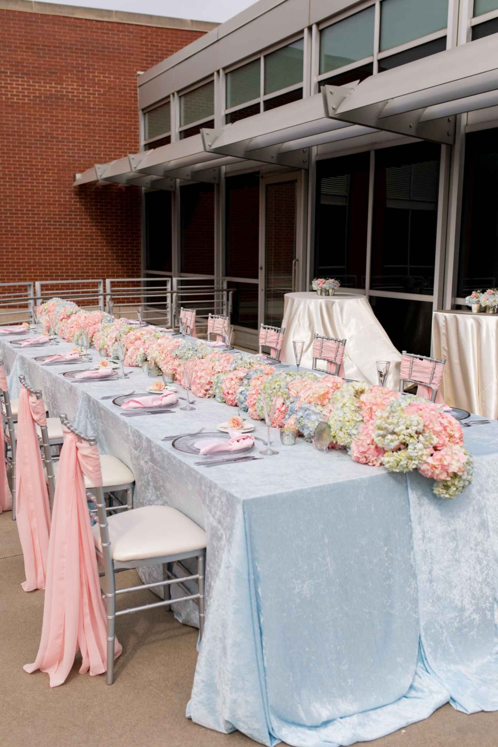 The shoot's florals complemented the cotton candy theme, while acting as several statement pieces throughout the setup. "JP Parker agreed to create an 18-foot floral runner of light blue and blush pink hydrangeas for the King’s Table, an item they had never created before. This breathtaking hydrangea runner mimicked the cloudy, airy feel of cotton candy," describes Anna.