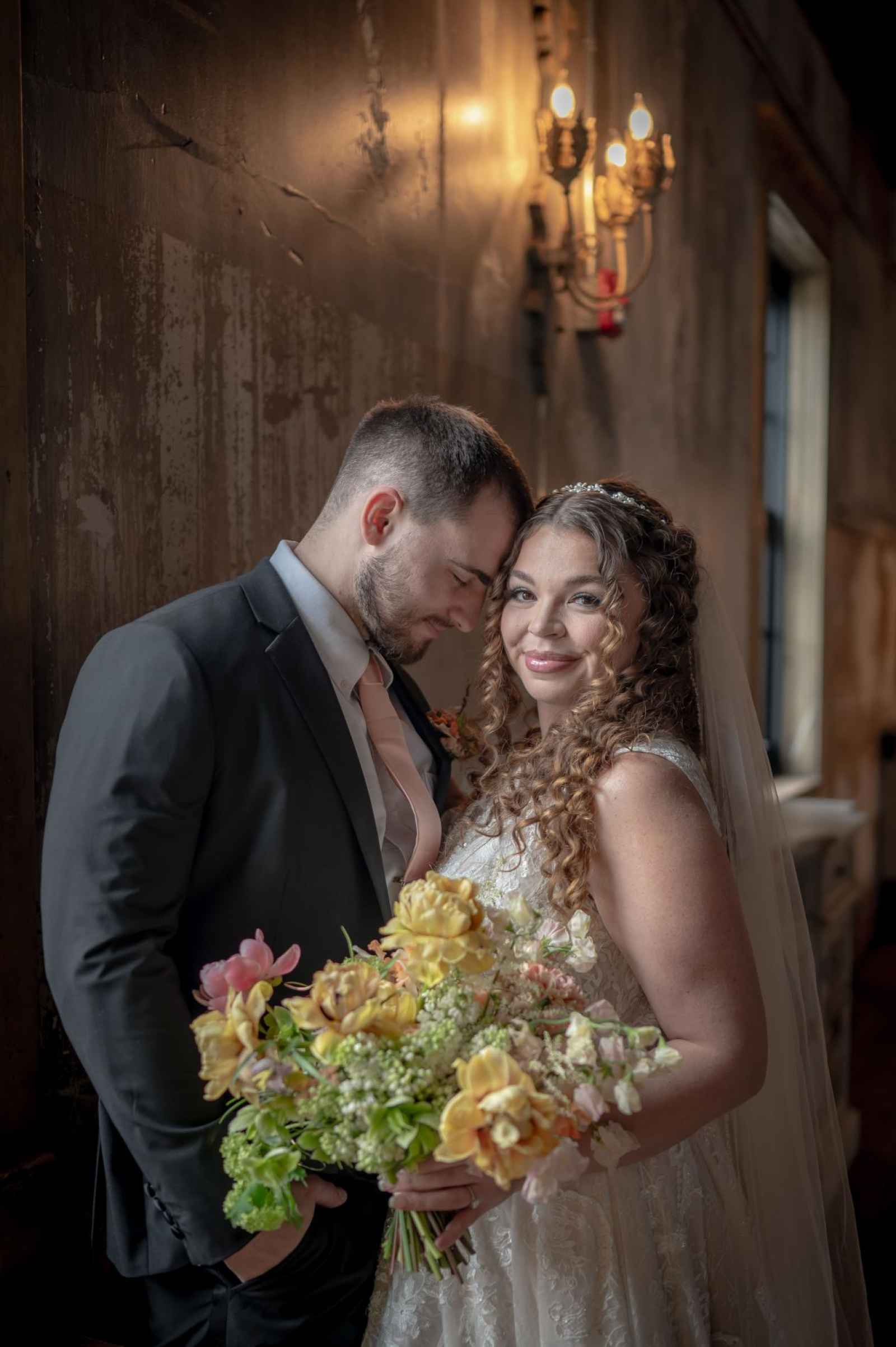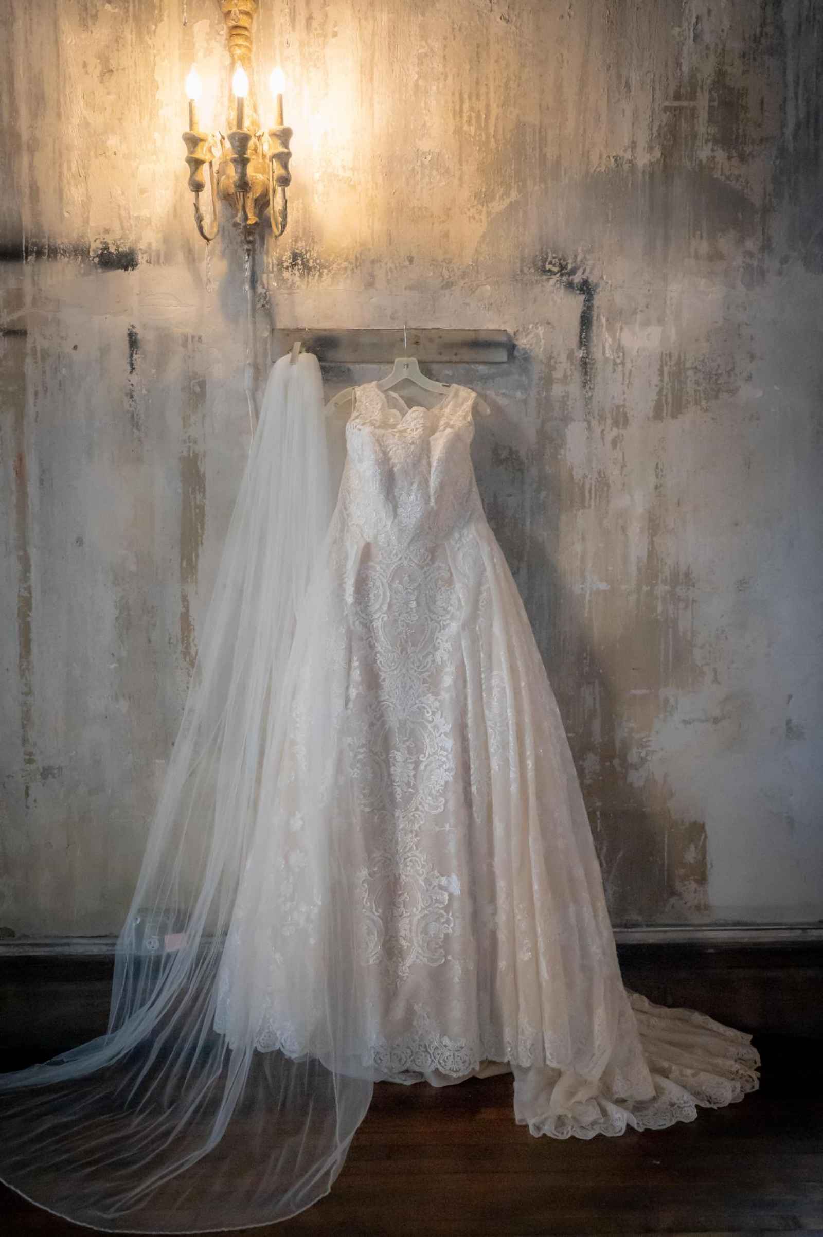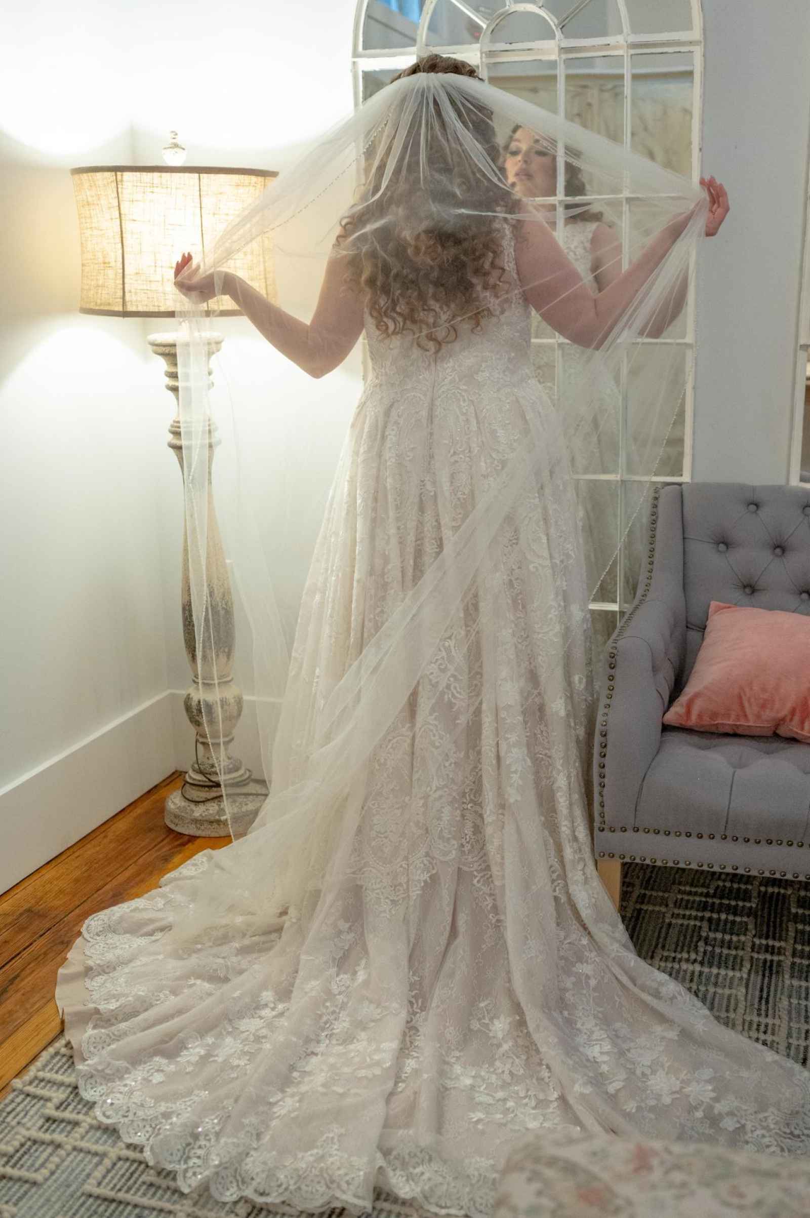 Inspired by the fairytale feel of Taylor Swift’s “Love Story”, Leigha picked a beautiful A-line gown with plenty of soft, floral lace details. Leigha explains, I wanted something with lace and slightly modest, but nothing that felt too dated. I ended up choosing a high neck, ball gown with lace detail and overskirt illusion.” When paired with Blushing Beauty and Co.’s curled half-up, half-down hairstyle, elegant hairpiece and Jenn Martz Makeup Artistry's soft makeup, this bride looks regal and gorgeous!