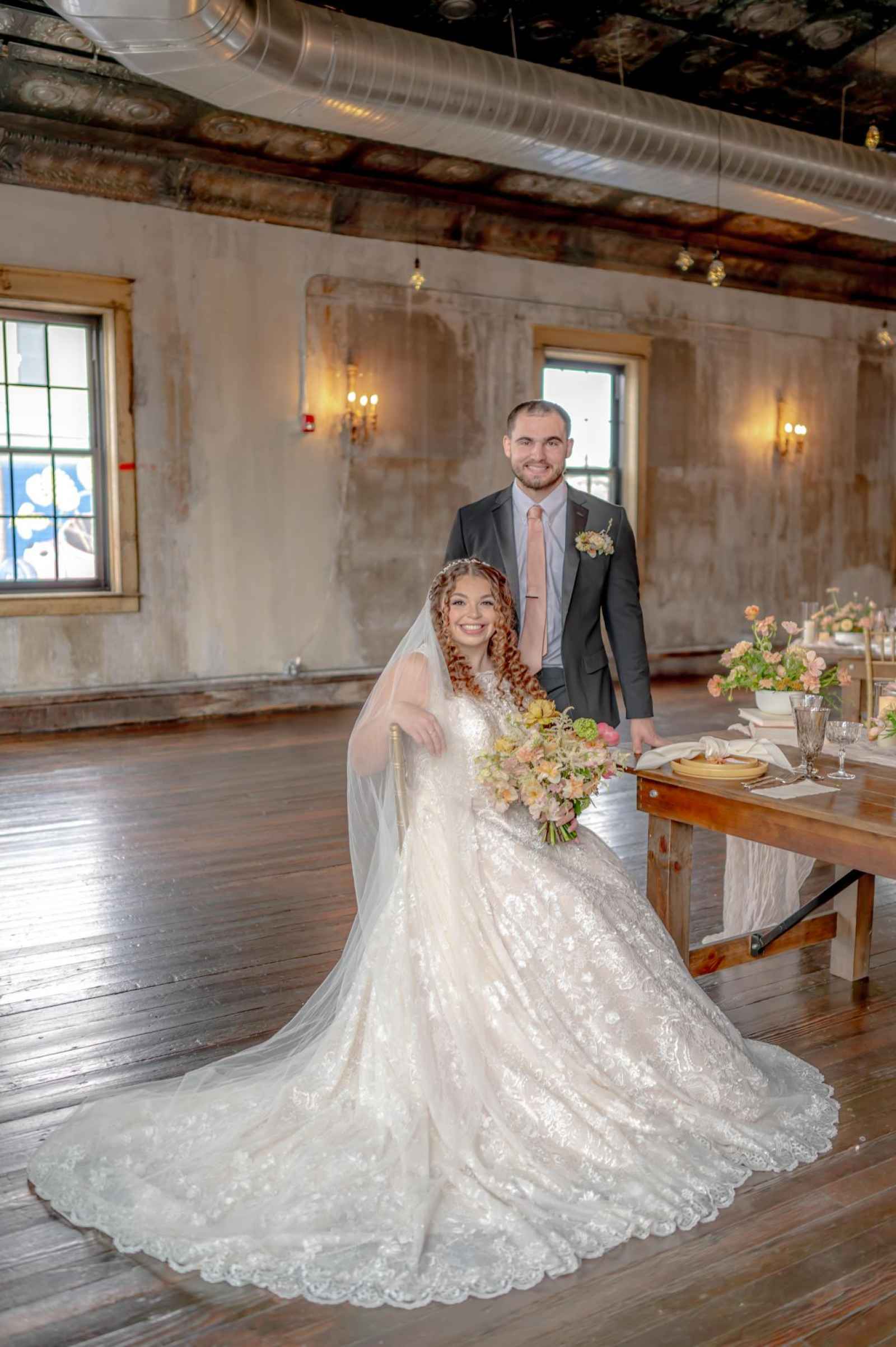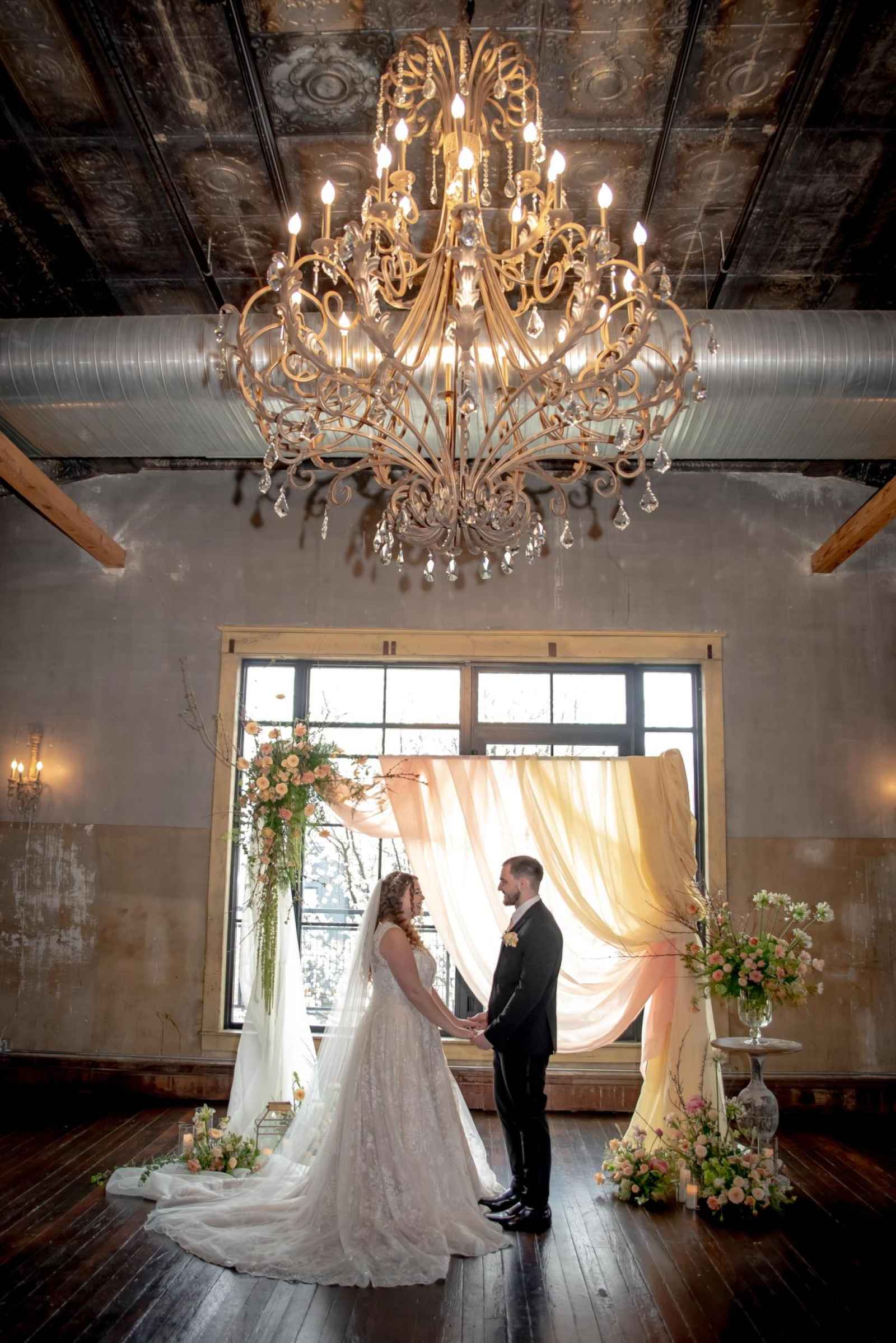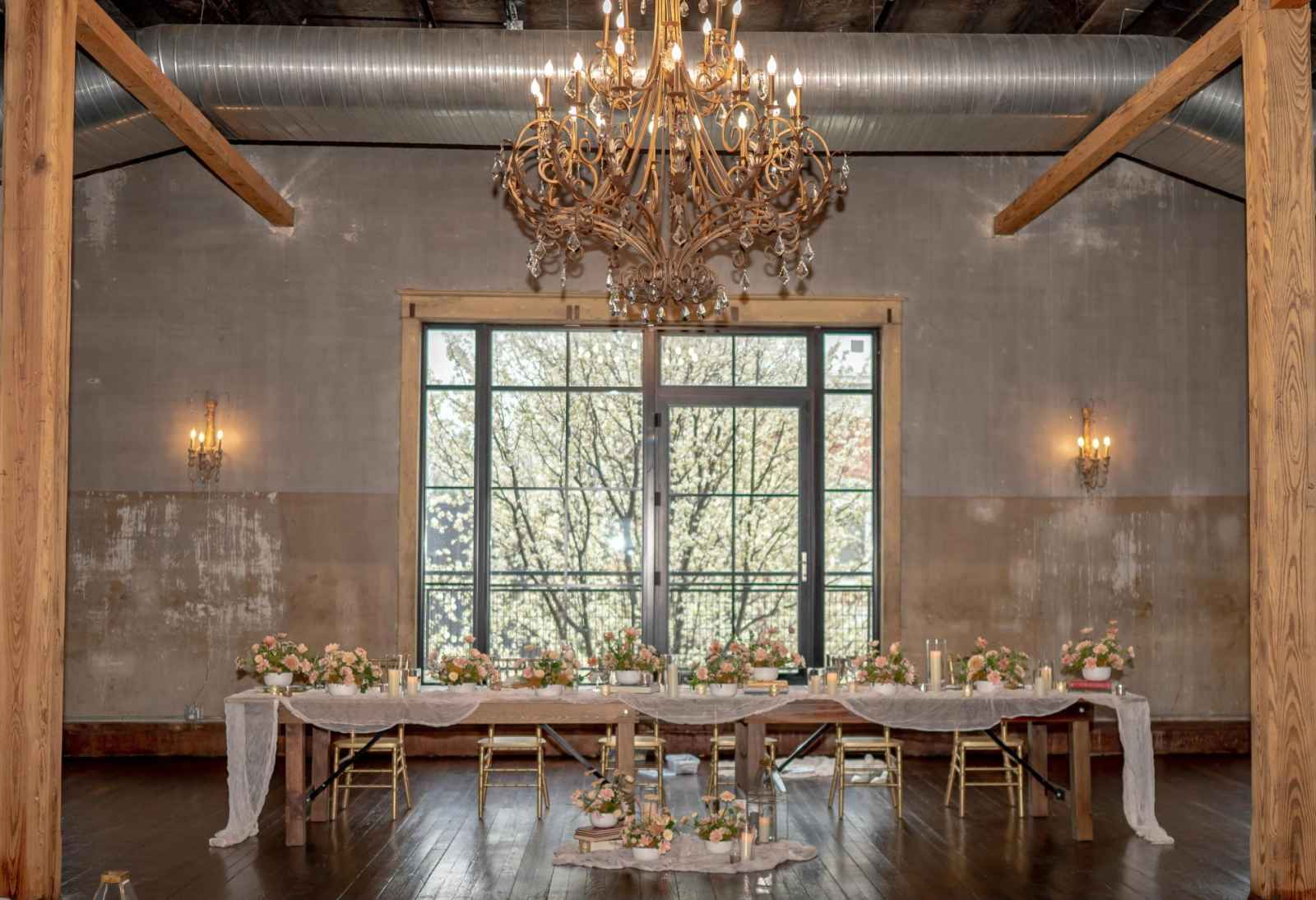 19 North by Froehlich’s ended up being the perfect space for our Victorian-inspired shoot! Leigha raves, “The original wood floors and columns paired with their antique-style furniture meshed perfectly with my design.” Originally built in 1910, this rustic yet industrial venue isn't far off from the time period of our shoot's theme. There are plenty of elegant flourishes, too—from the large black-paned windows to the grand chandelier!