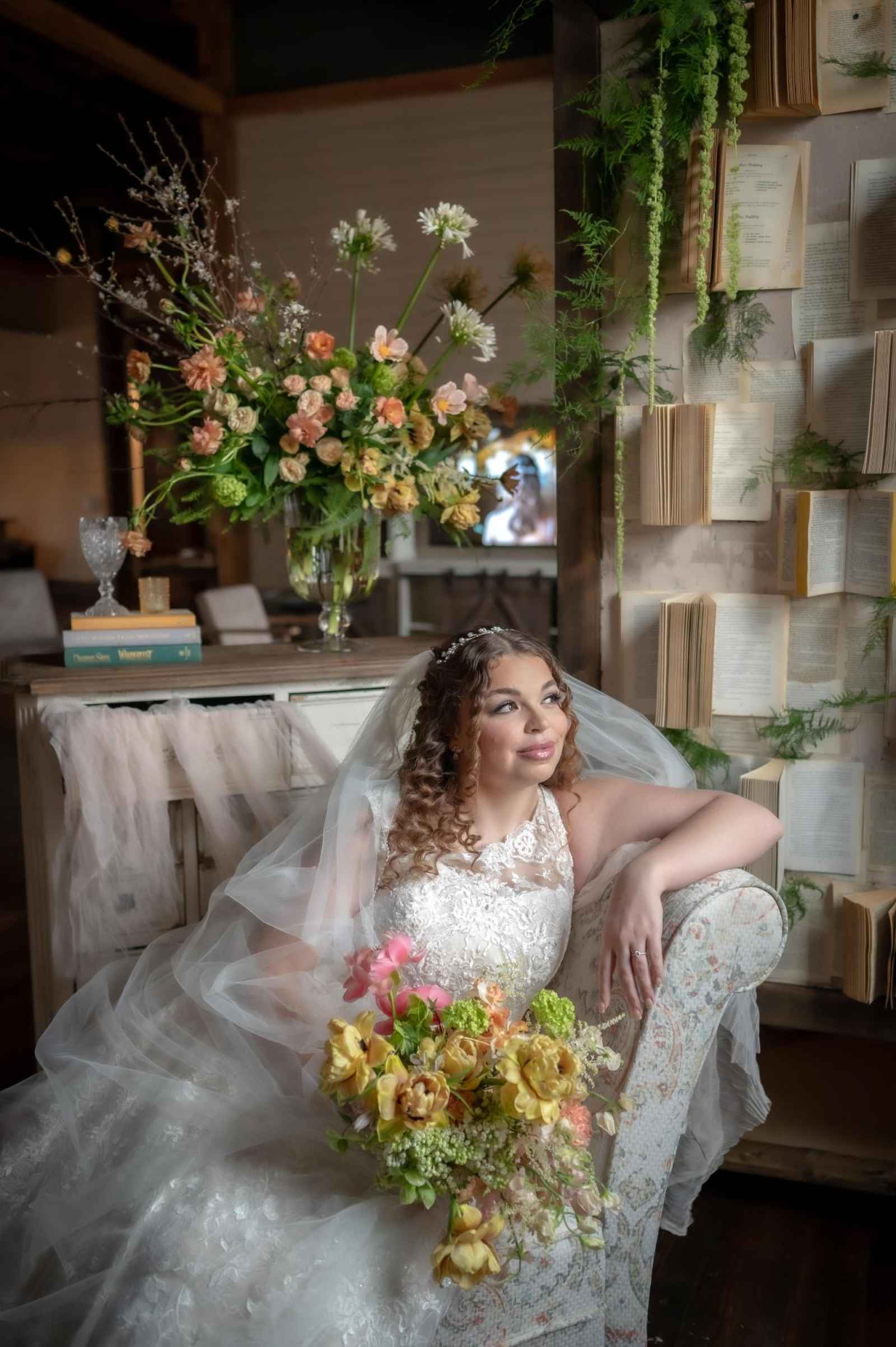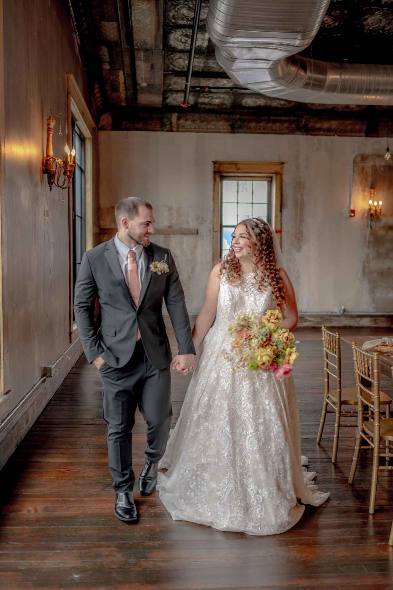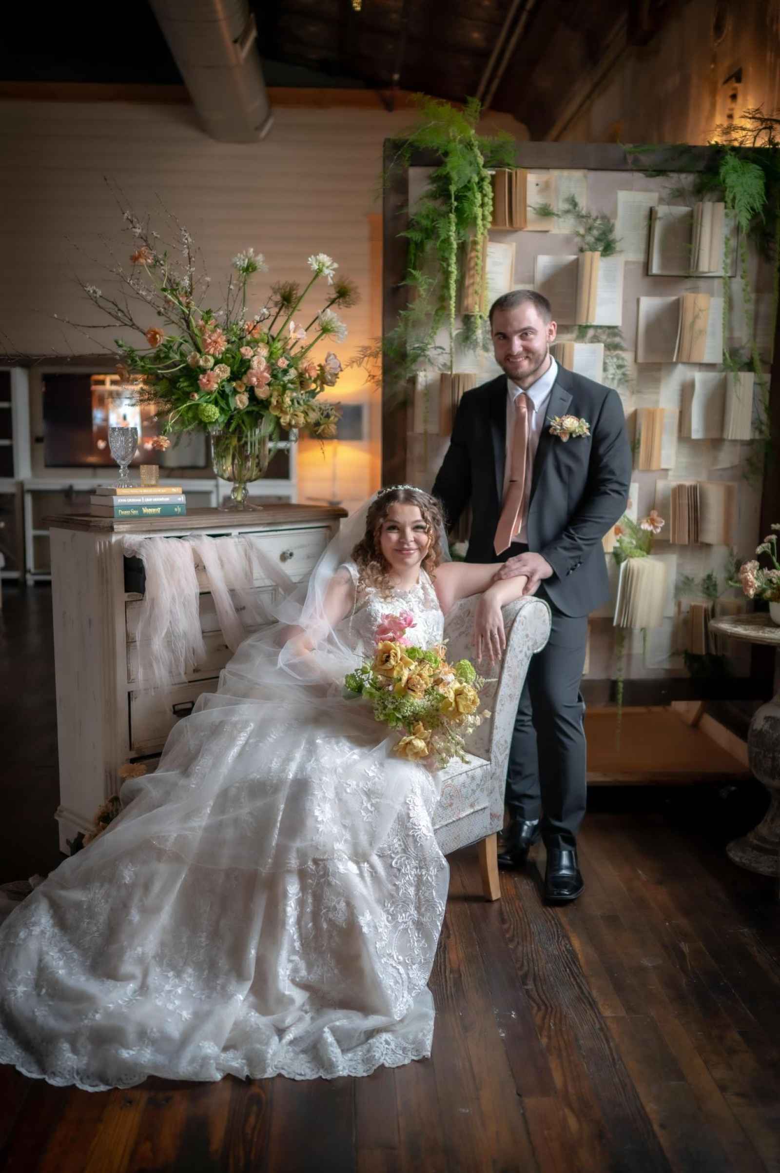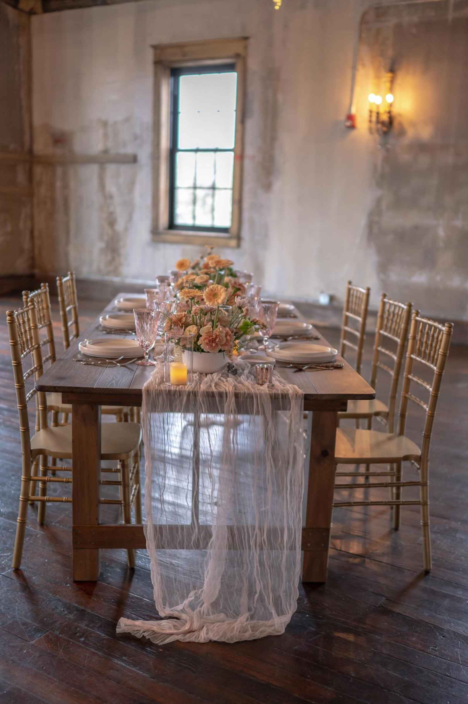 19 North by Froehlich’s ended up being the perfect space for our Victorian-inspired shoot! Leigha raves, “The original wood floors and columns paired with their antique-style furniture meshed perfectly with my design.” Originally built in 1910, this rustic yet industrial venue isn't far off from the time period of our shoot's theme. There are plenty of elegant flourishes, too—from the large black-paned windows to the grand chandelier!