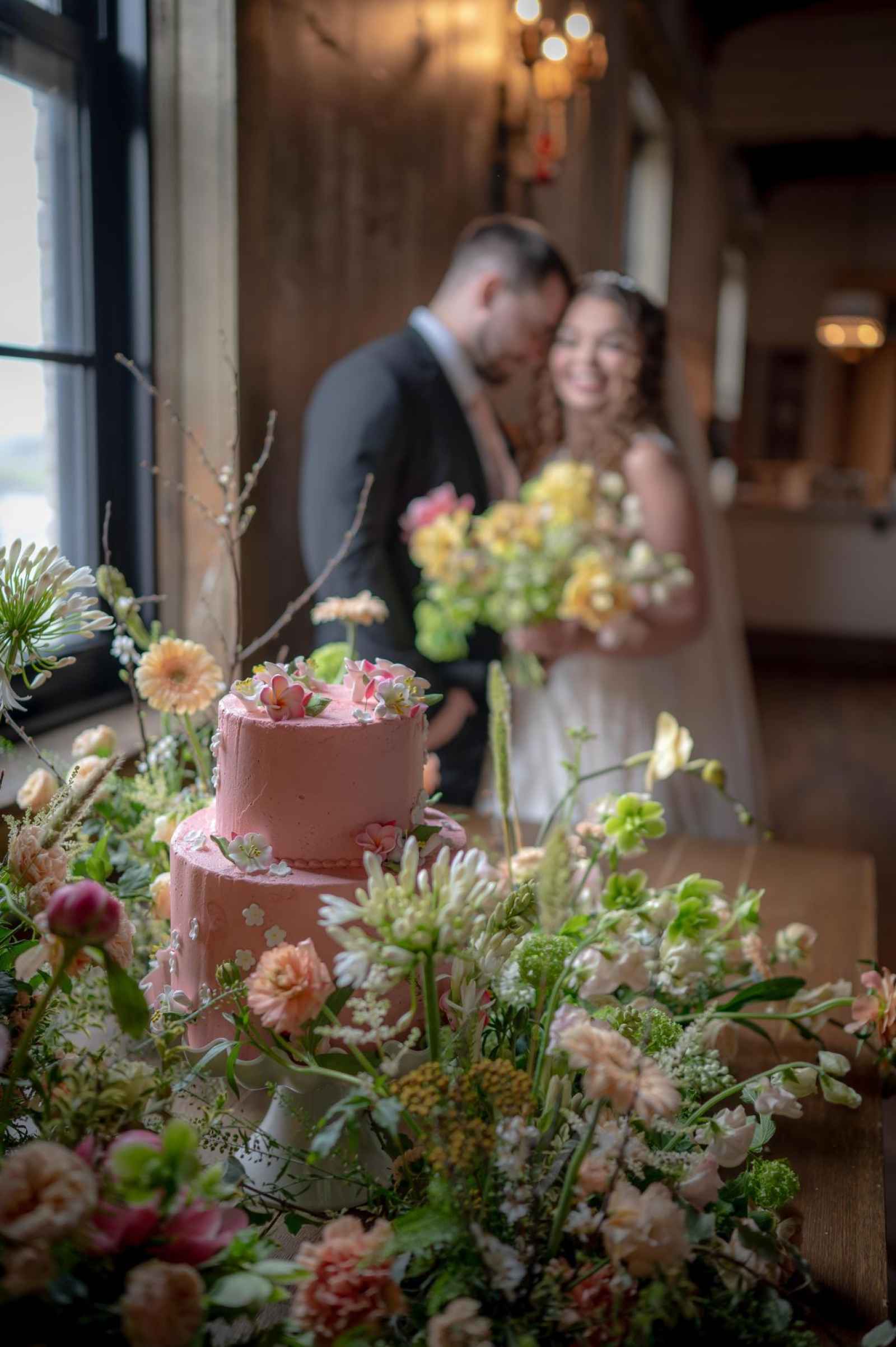 Instead of adding real flowers to the cake, Leigha wanted Chef Drew of Froehlich’s to show off everything he could do. The white flowers on the cake are completely made of icing and hand-placed. In addition to the two-tiered pink cake, Chef Drew provided plenty of delicate desserts—like macarons and crème brûlée—which make this shoot feel even more like a luxurious 19th century wedding!