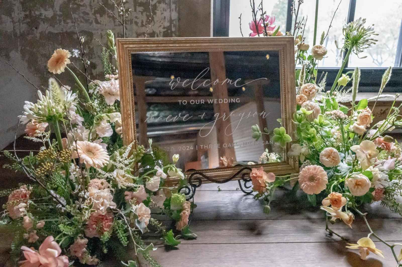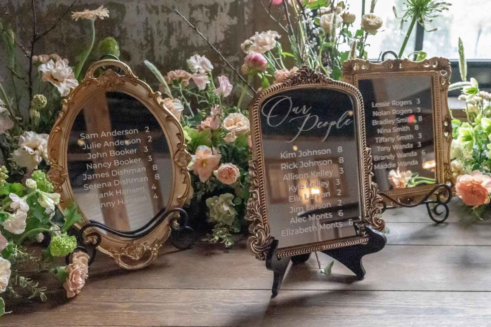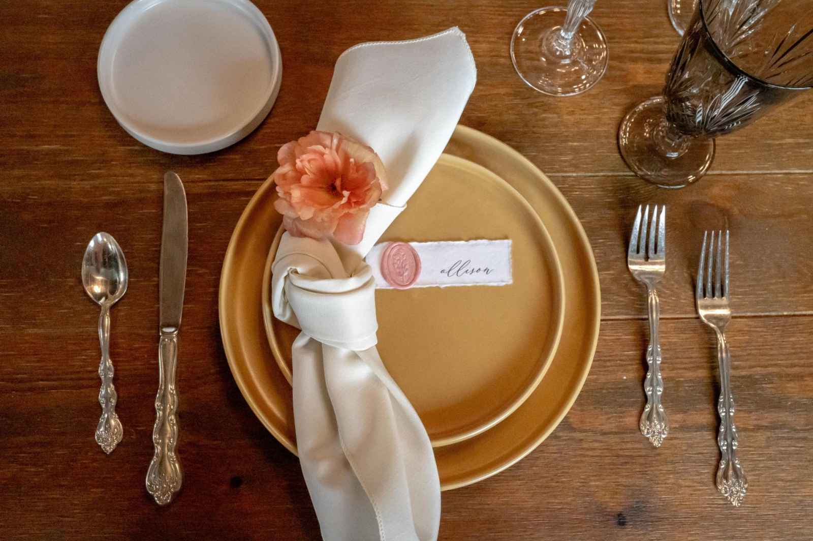 Because she had so much confidence that Allison from Your Little Details would pick up on the classic elegance that she envisioned for this shoot, Leigha only sent over two inspiration pictures for the stationery. Allison was able to produce exactly what Leigha had pictured from the raw edges and wax insignias to the linen menus and bar sign. We also love the elegant and timeless use of the gold mirrors for the welcome sign and table number display!