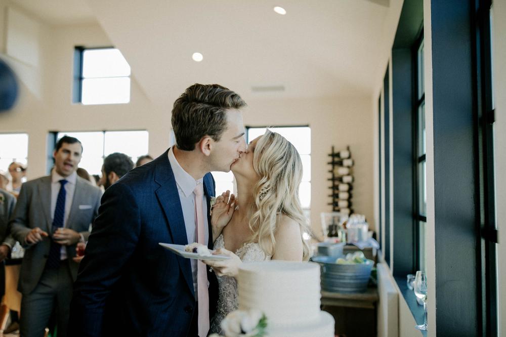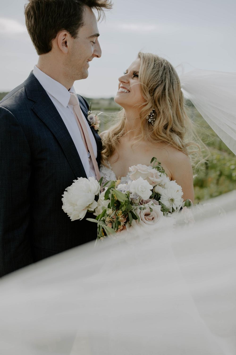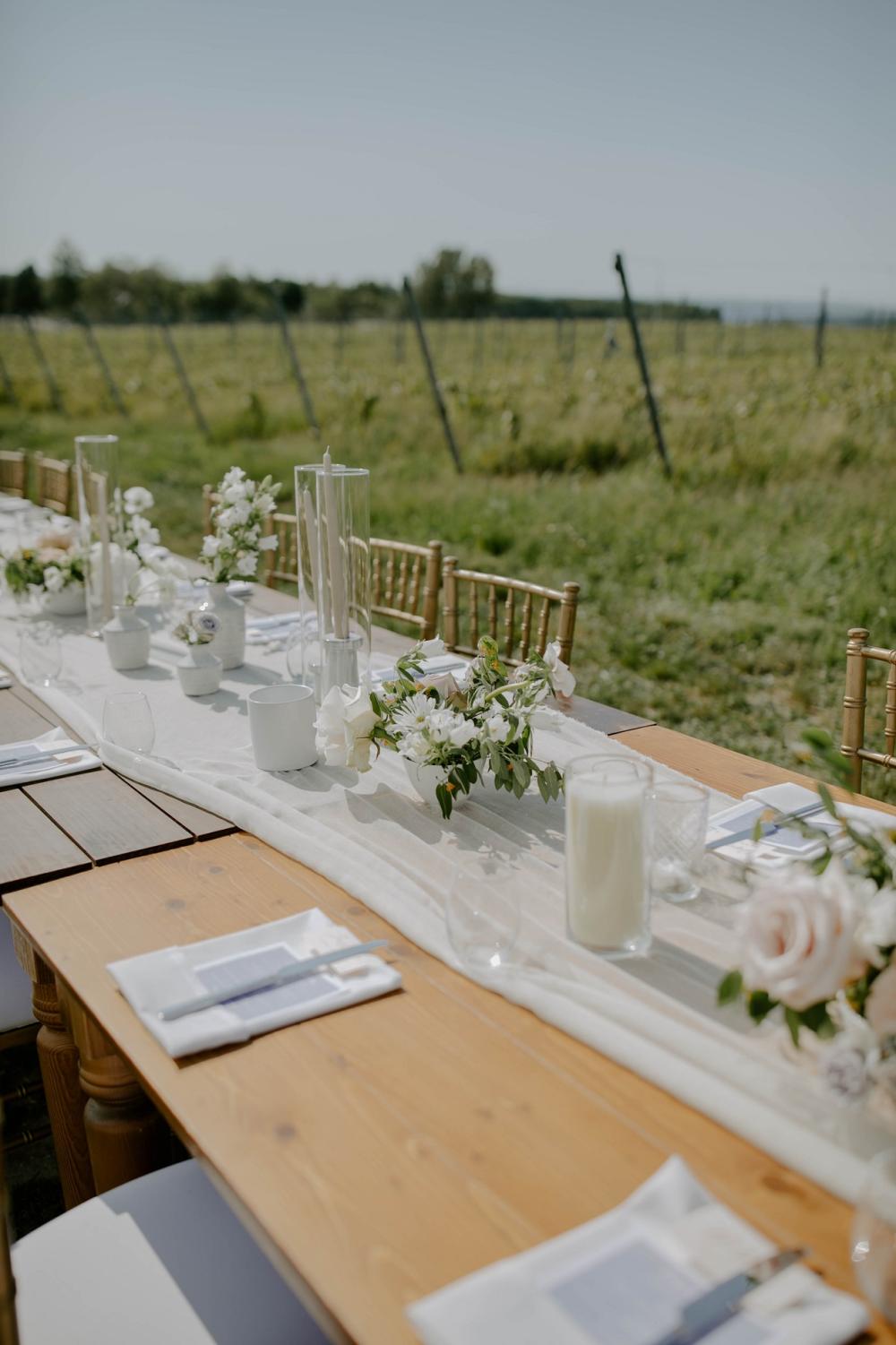 Abbey worked closely with their florist to help develop a color scheme and theme that would look beautiful with their venue. The rustic charm of their reception scene is absolutely beautiful. We love the contrast of the light pink elements with the silver table details! All of the floral pieces make the whole reception seem full of life, especially with the vineyard extending into the distance.